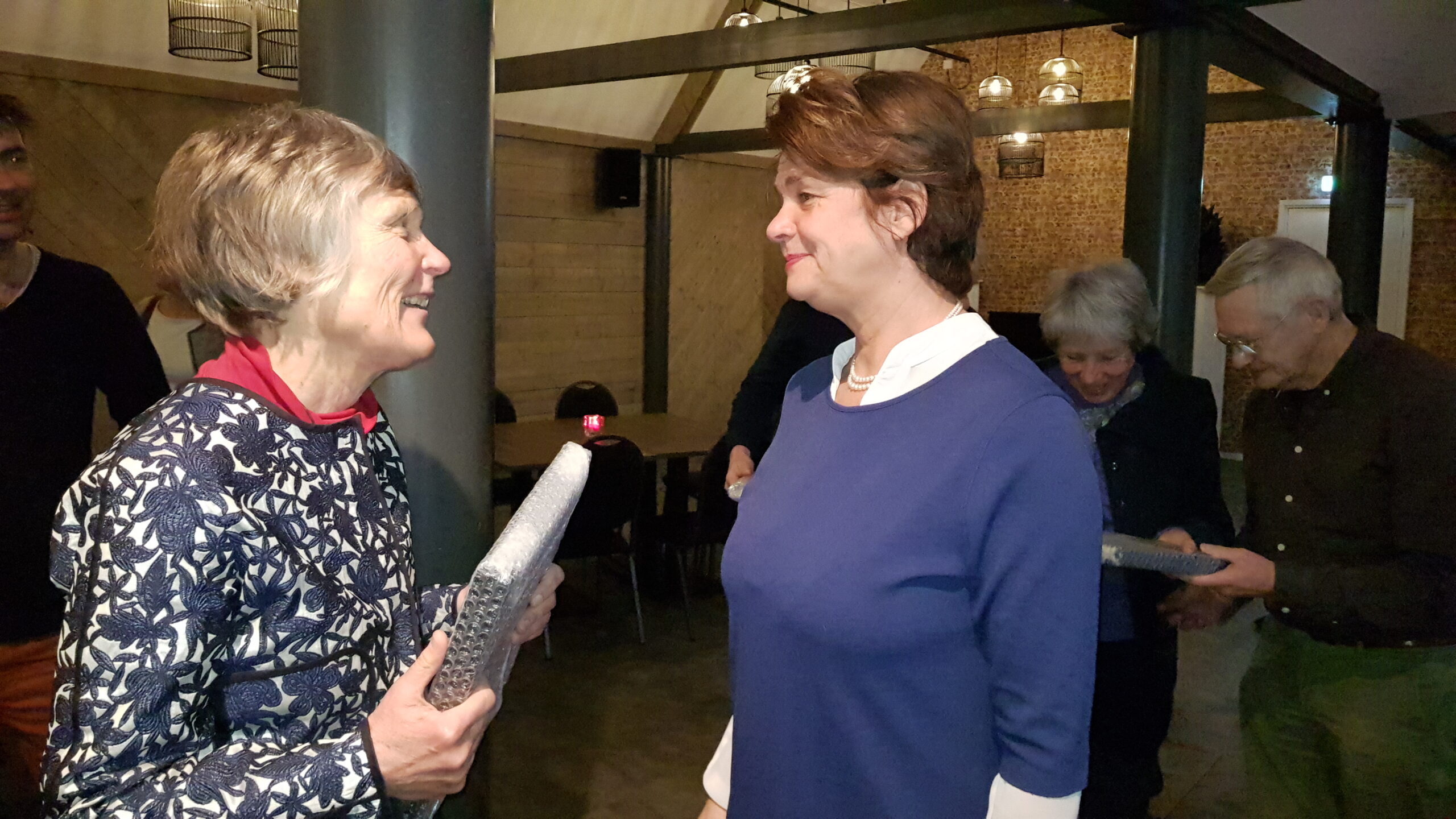 Chris de Waard in gesprek met locoburgemeester Marleen Damen over de Gouden Speld die ze overhandigde aan Jaap van Meijgaarden.