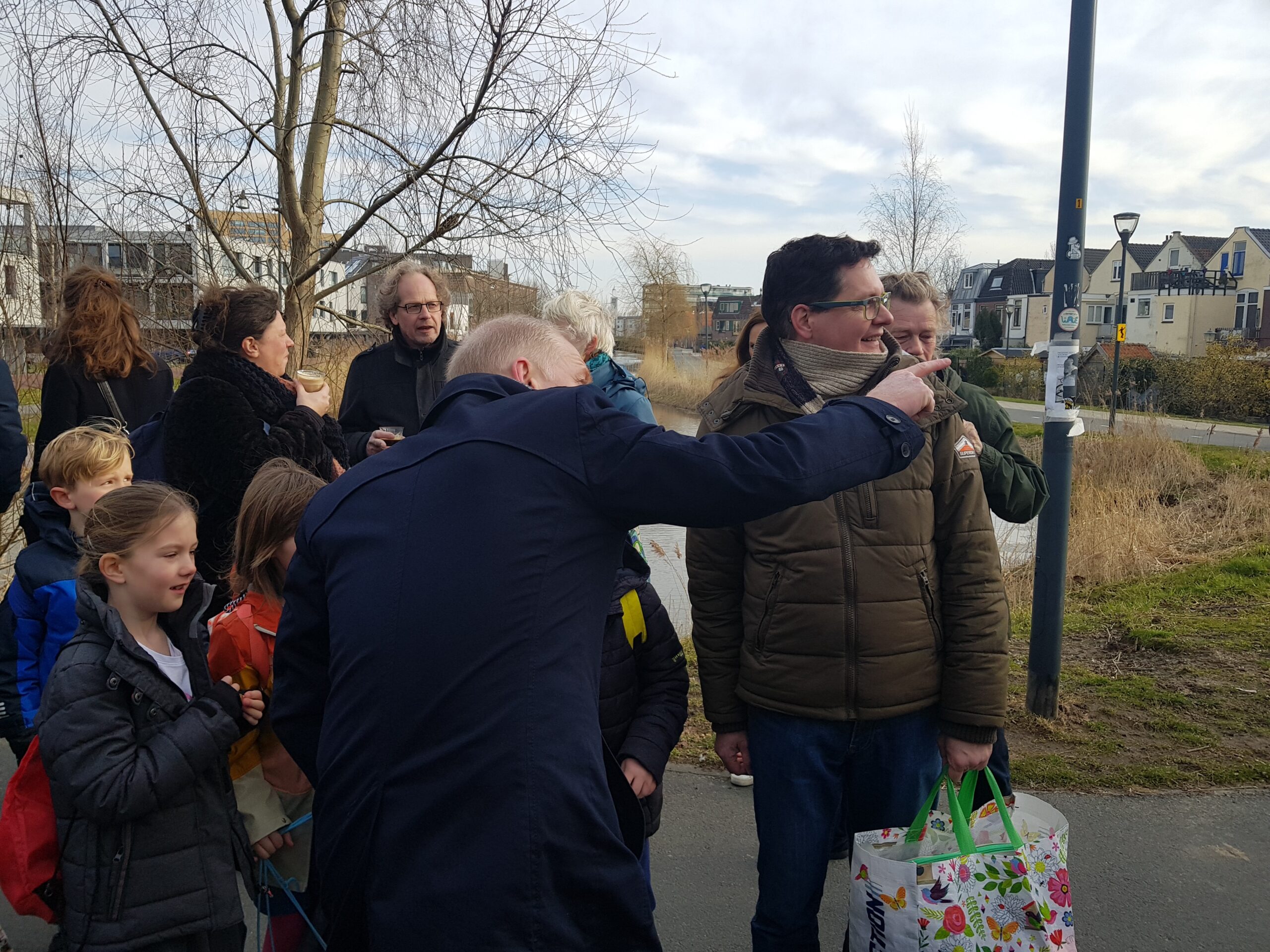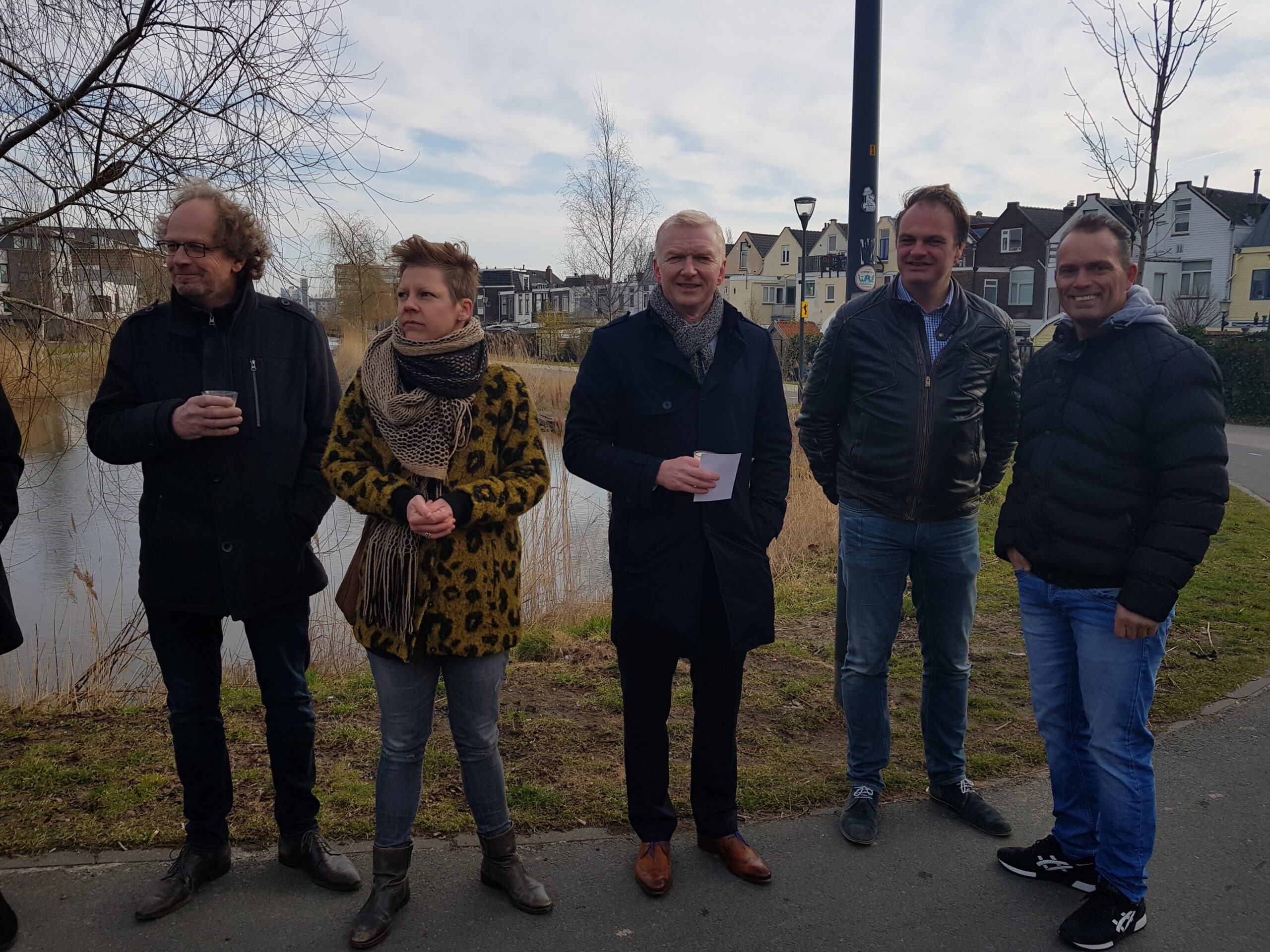 Chris de Waard sprak na de onthulling van het bouwbord met wethouder Robert Strijk en met de voorzitter van de Vrienden van het Singelpark, Conny Broeyer.