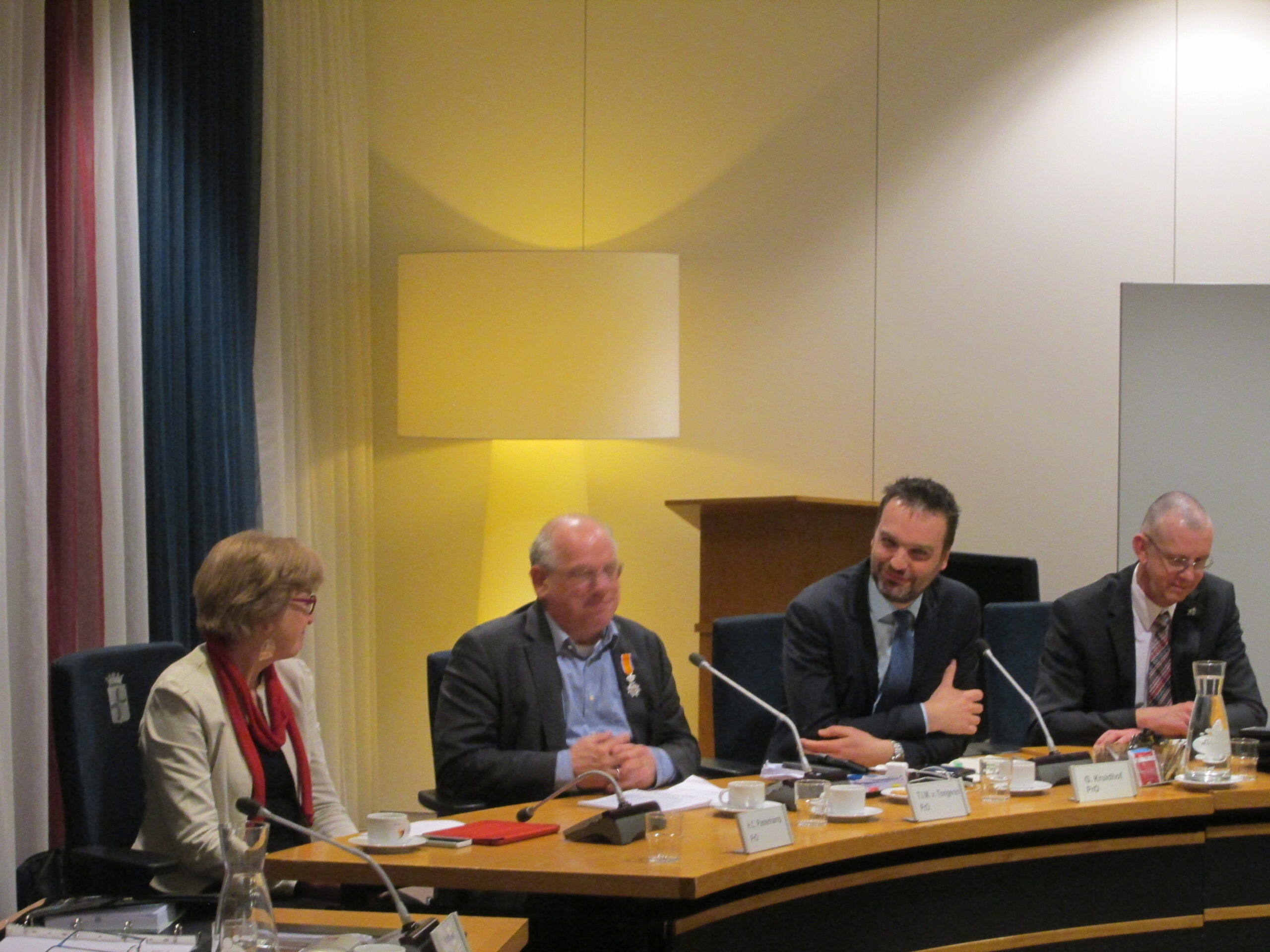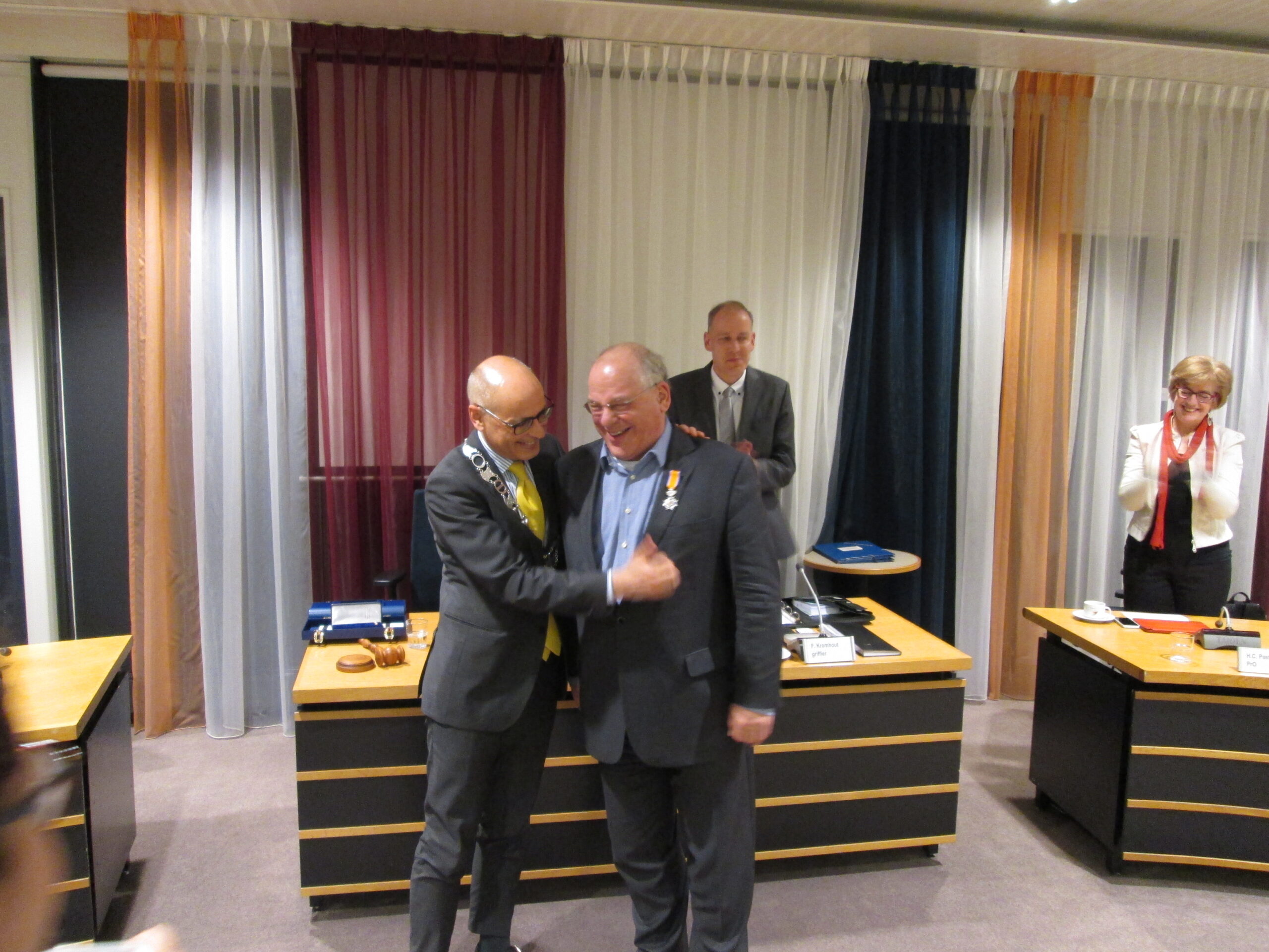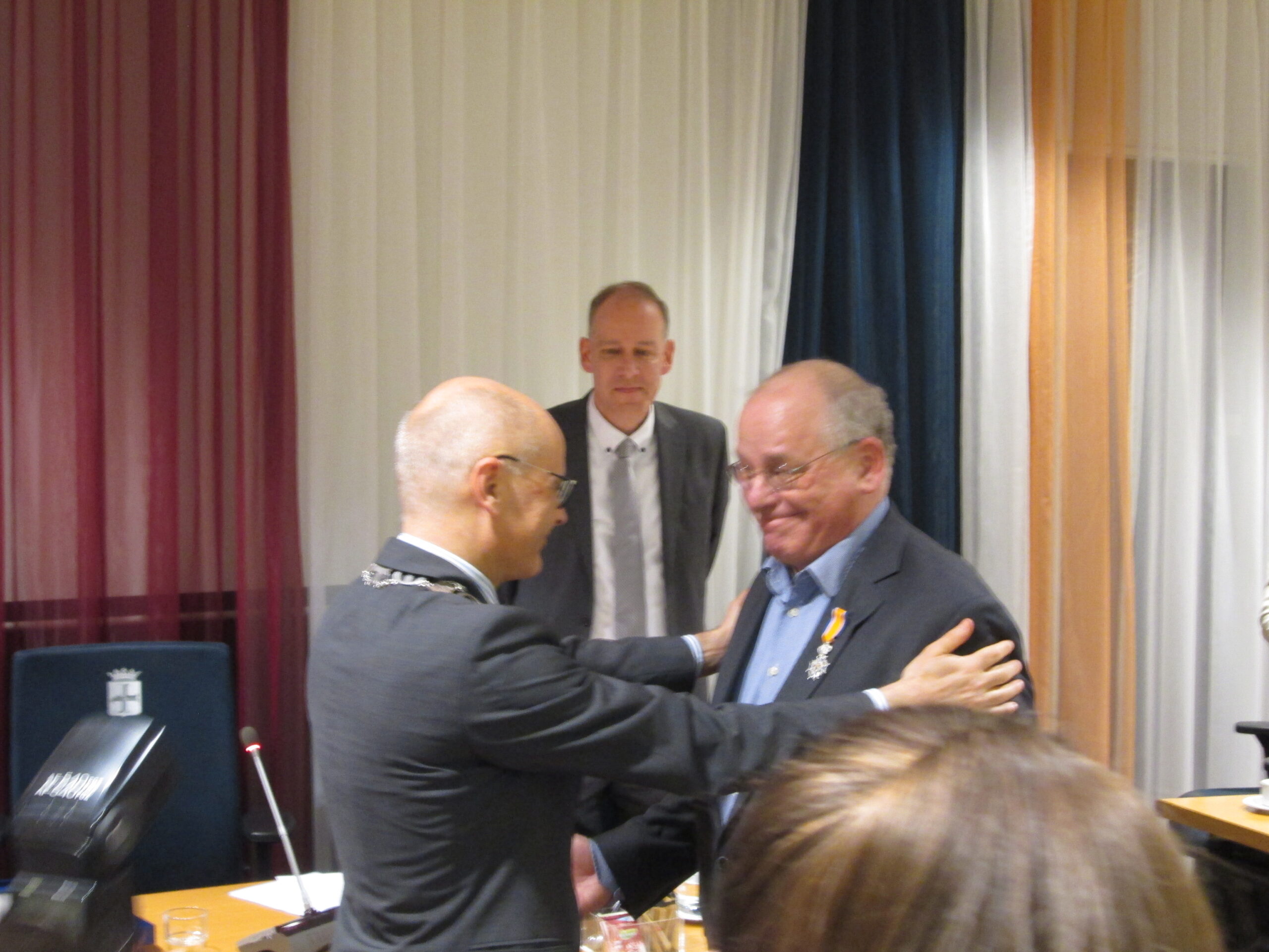 Als laatste richtte de burgemeester zich tot Van Tongeren. “Met jouw vertrek gaat de gemiddelde leeftijd van de raadsleden weer flink naar beneden”, zei hij grappend tegen de nestor van de Oegstgeester raad. Vervolgens serieus en met een brede glimlach: “het heeft Zijne Majesteit de Koning behaagd, jou te benoemen tot lid in de Orde van Oranje-Nassau.” Van Tongeren was totaal verrast en kon enige emotie niet onderdrukken.