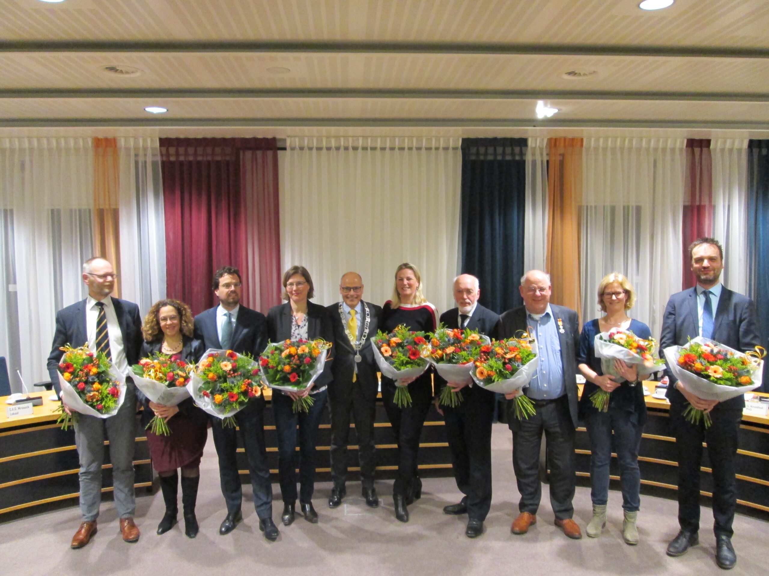 Tijdens een laatste raadsbijeenkomst namen dinsdagavond negen raadsleden afscheid. Zij konden allemaal rekenen op een persoonlijk woord van burgemeester Jaensch. “Ieder van u gaf op een eigen manier vorm aan de rol van raadslid. U was de afgelopen jaren ambassadeur van de gemeente Oegstgeest en hoop dat u dat de komende jaren ook blijft.” Hij noemde ook hoe lastig het raadswerk kan zijn, zeker in combinatie met een gezinsleven. “Het dreigt een privilege te worden voor mensen met genoeg tijd en geld.”