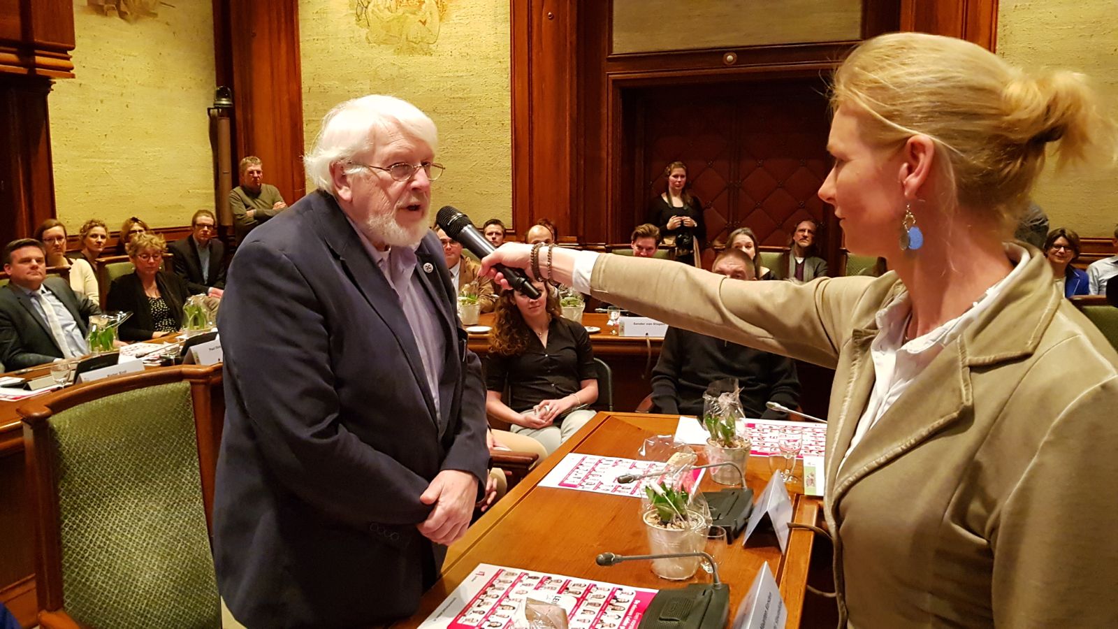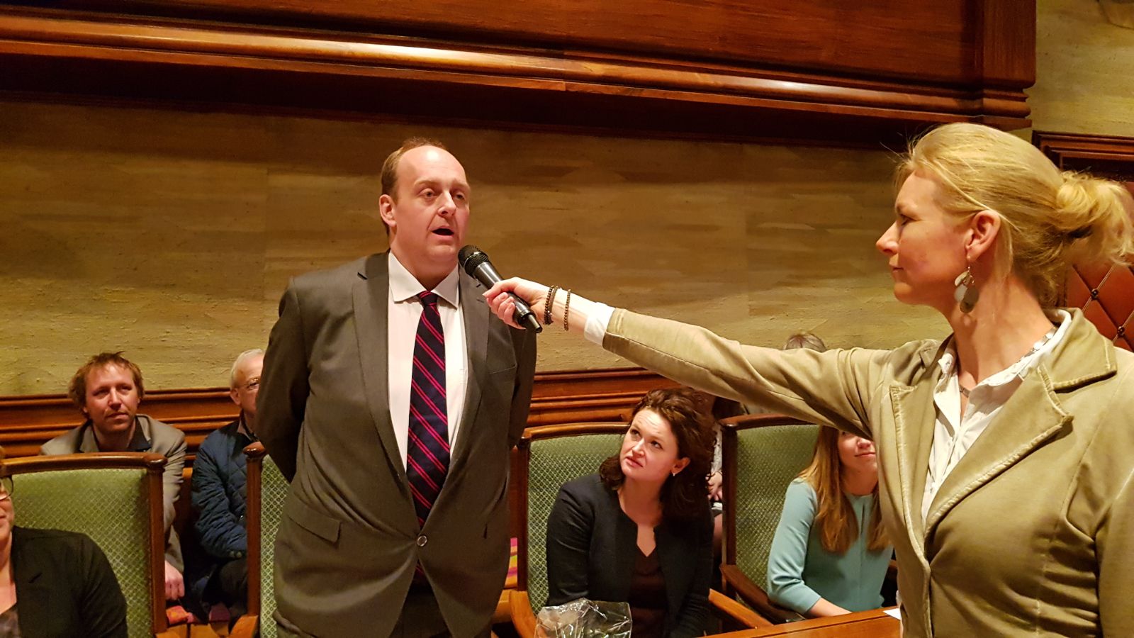 Nadat alle nieuwe raadsleden hun eed of gelofte hadden afgelegd, kwam GroenLinks-raadslid Ashley North naar voren met een rode lantaarn. “Vier jaar geleden kreeg ik deze lantaarn van Mart Keuning omdat ik het jongst gekozen raadslid was. Hij zei mij toen vooral jong te blijven. Ik moet zeggen dat het me wel wat grijze haren heeft opgeleverd, maar het was super leuk. Inmiddels ben ik niet meer het jongste raadslid, dat is nu Thomas van Halm van de SP. Daarom krijgt hij nu de rode lantaarn en dezelfde boodschap: blijf jong en houd de raad fris.”