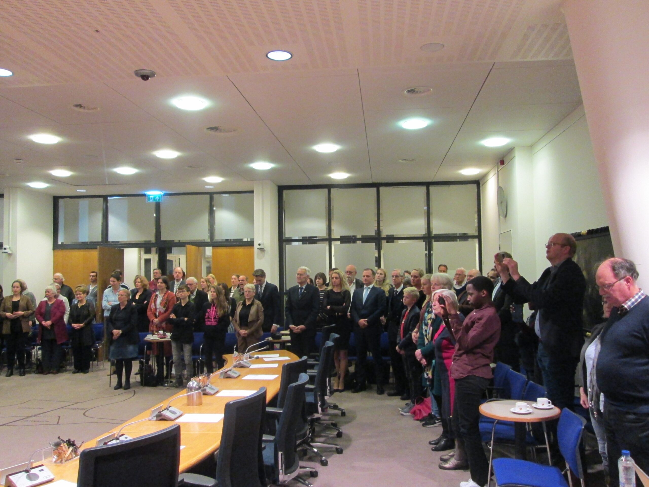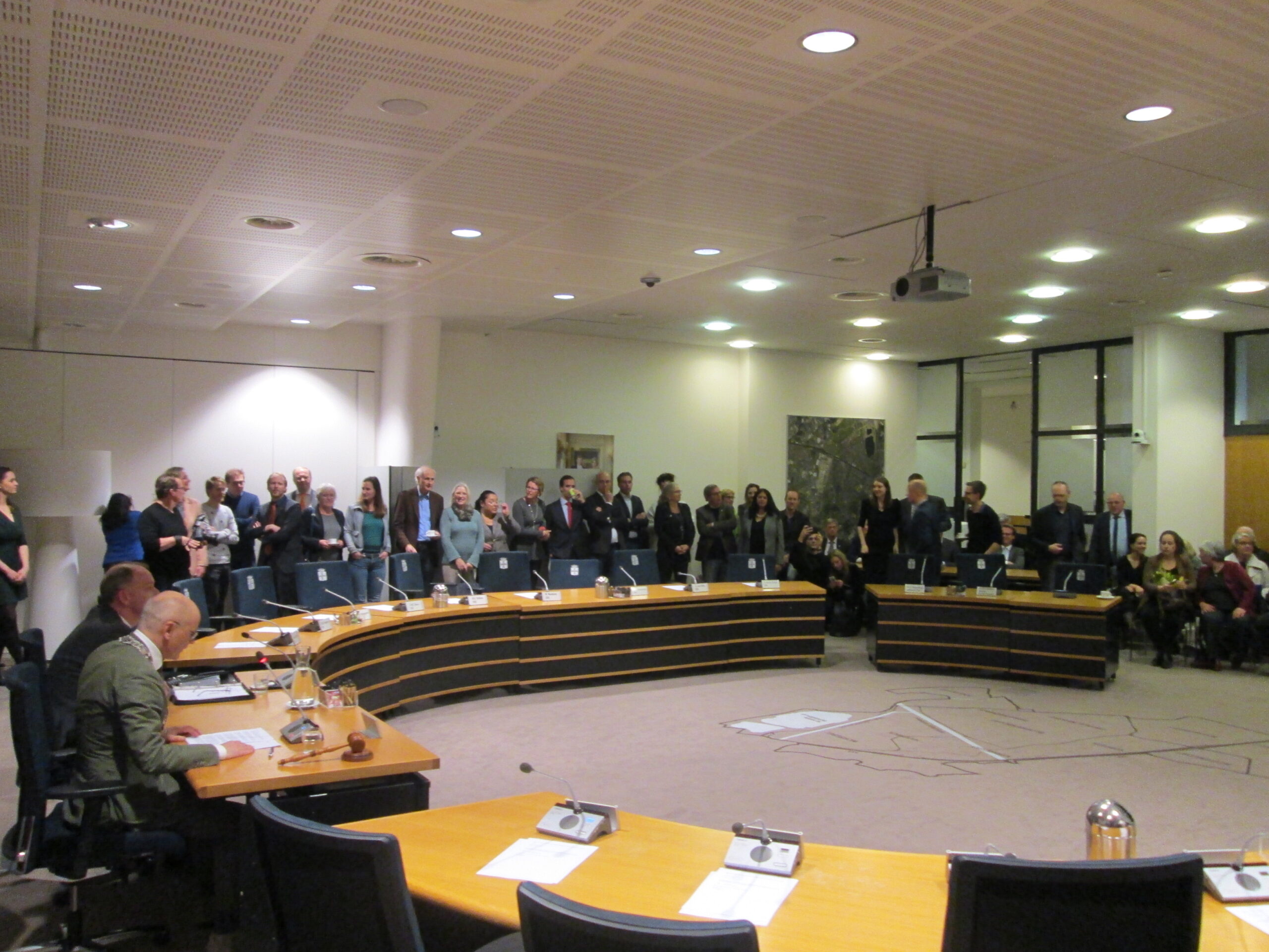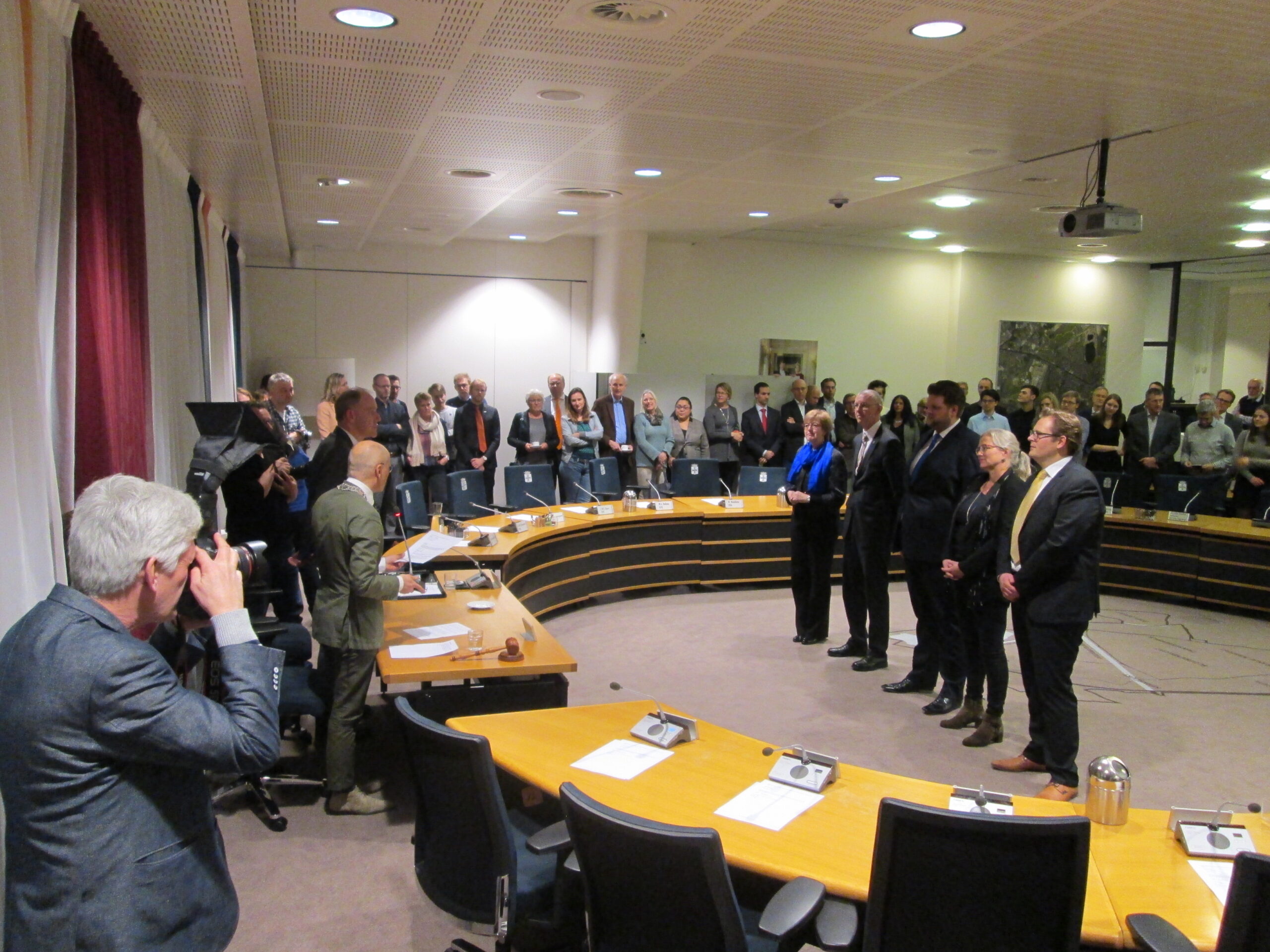 Er was geen plekje meer vrij in de raadzaal van het gemeentehuis, die was volgestroomd met vrienden en familie van de nieuwe raadsleden. “Volgens mij heb ik het hier nog nooit zo druk gezien”, aldus brugemeenter Emile Jaensch aan het begin van het officiele gedeelte. Vervolgens beloofden alle (nieuwe) raadsleden dat ze zich aan de wet zullen houden en geen steekpenningen aan zullen nemen. “Dat beloof ik.”