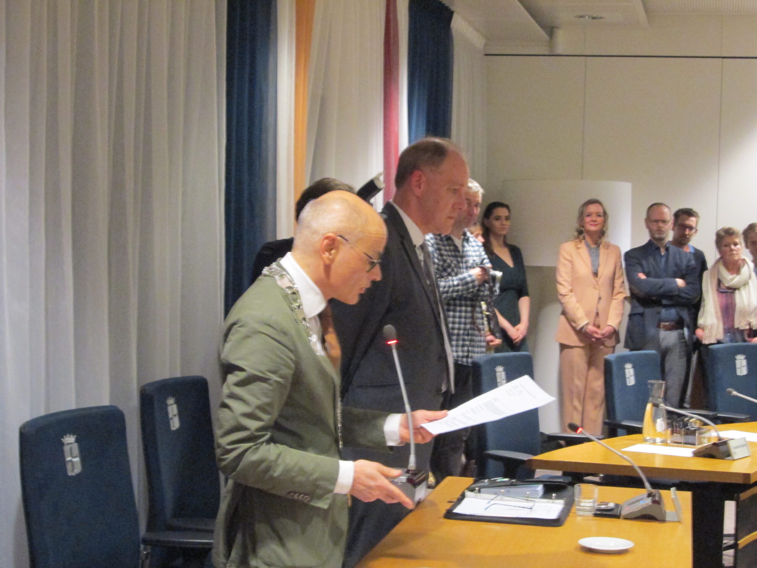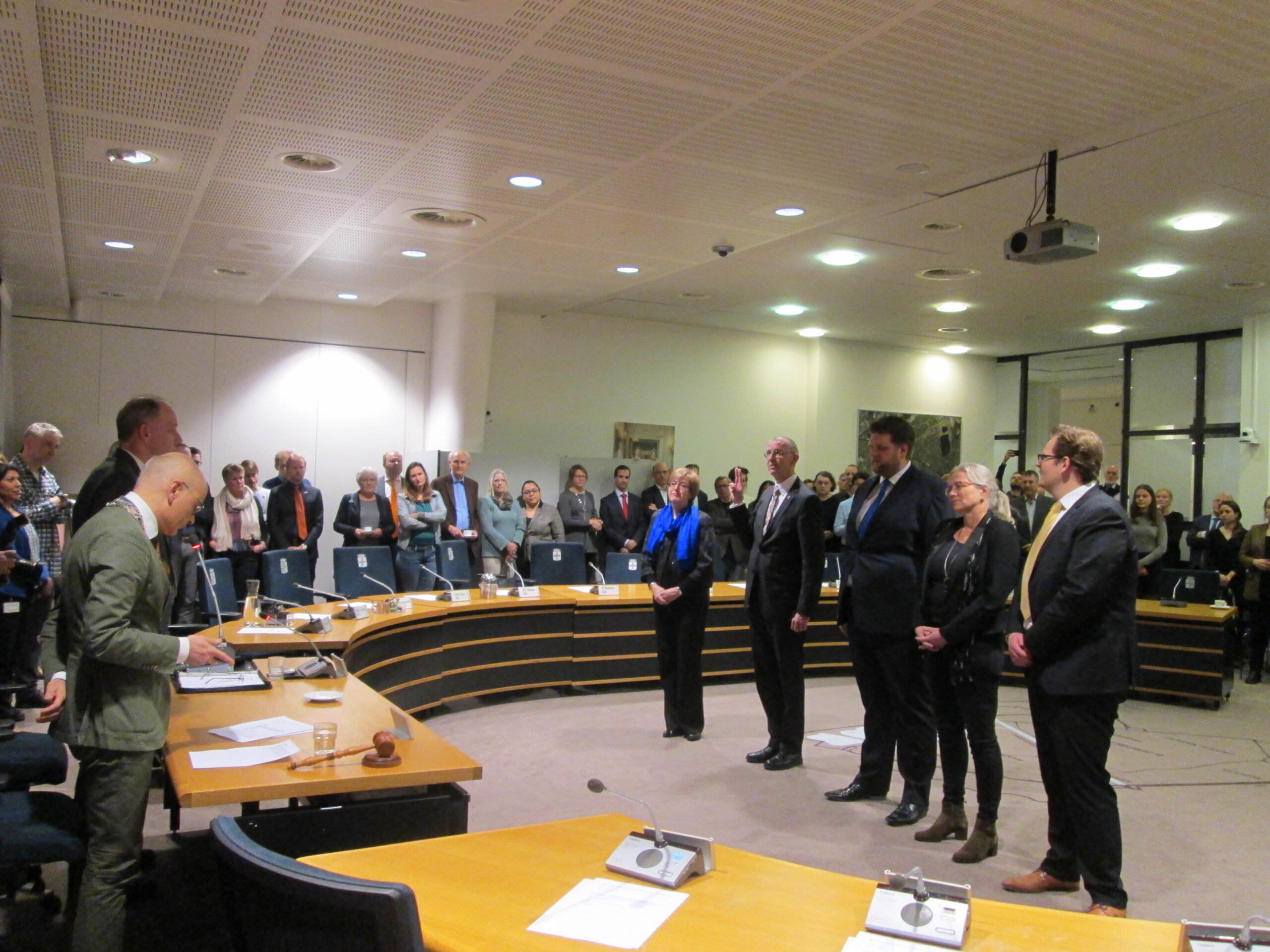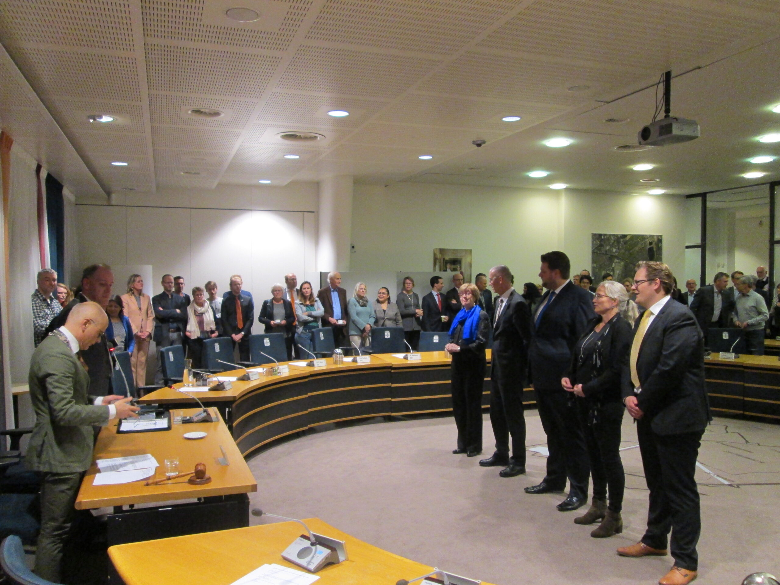 In het gemeentehuis van Oegstgeest zijn gisteravond negentien raadsleden ceremonieel geinstalleerd. Door een eed of gelofte af te leggen, hebben de politici zich voor vier jaar aan het raadswerk verbonden. Negen van hen deden dat voor het eerst, zij vervangen de raadsleden die afgelopen dinsdag afscheid namen.