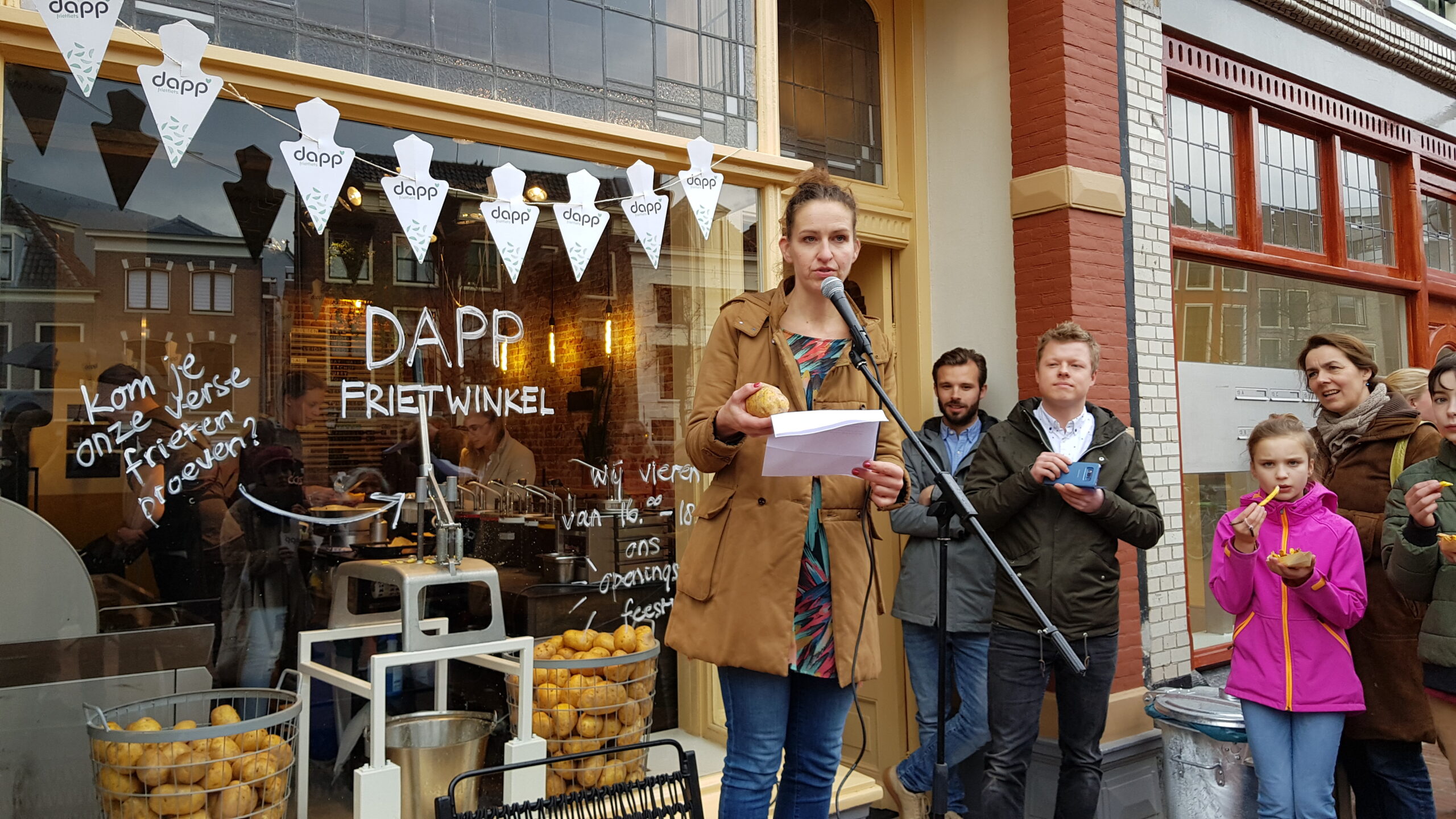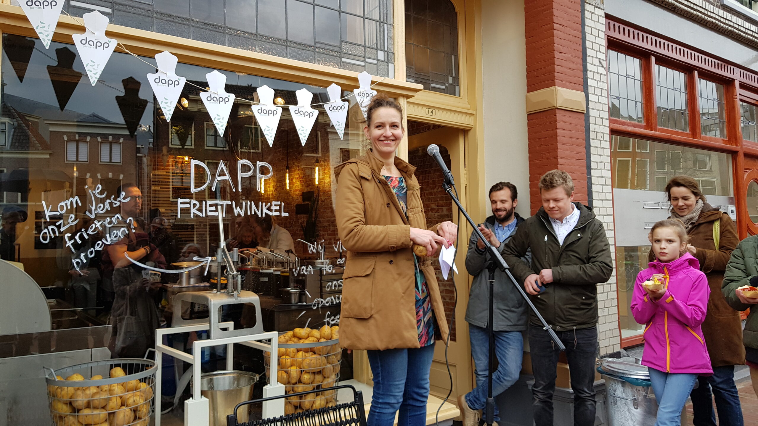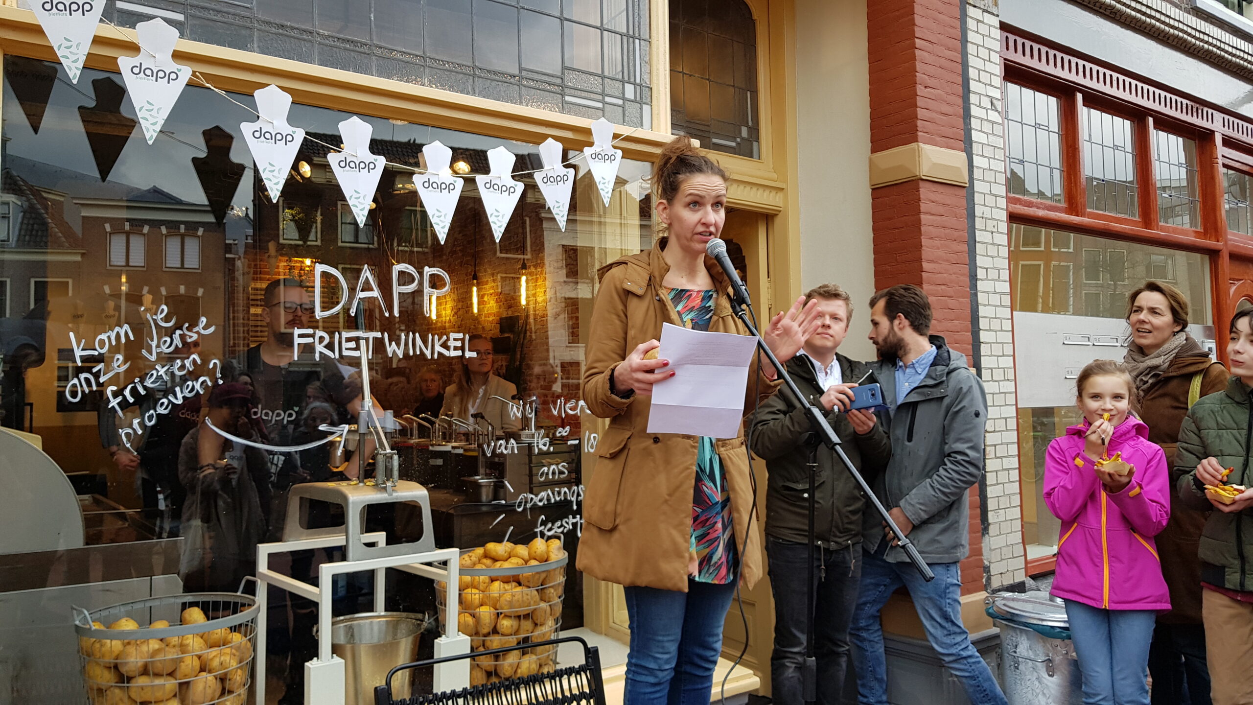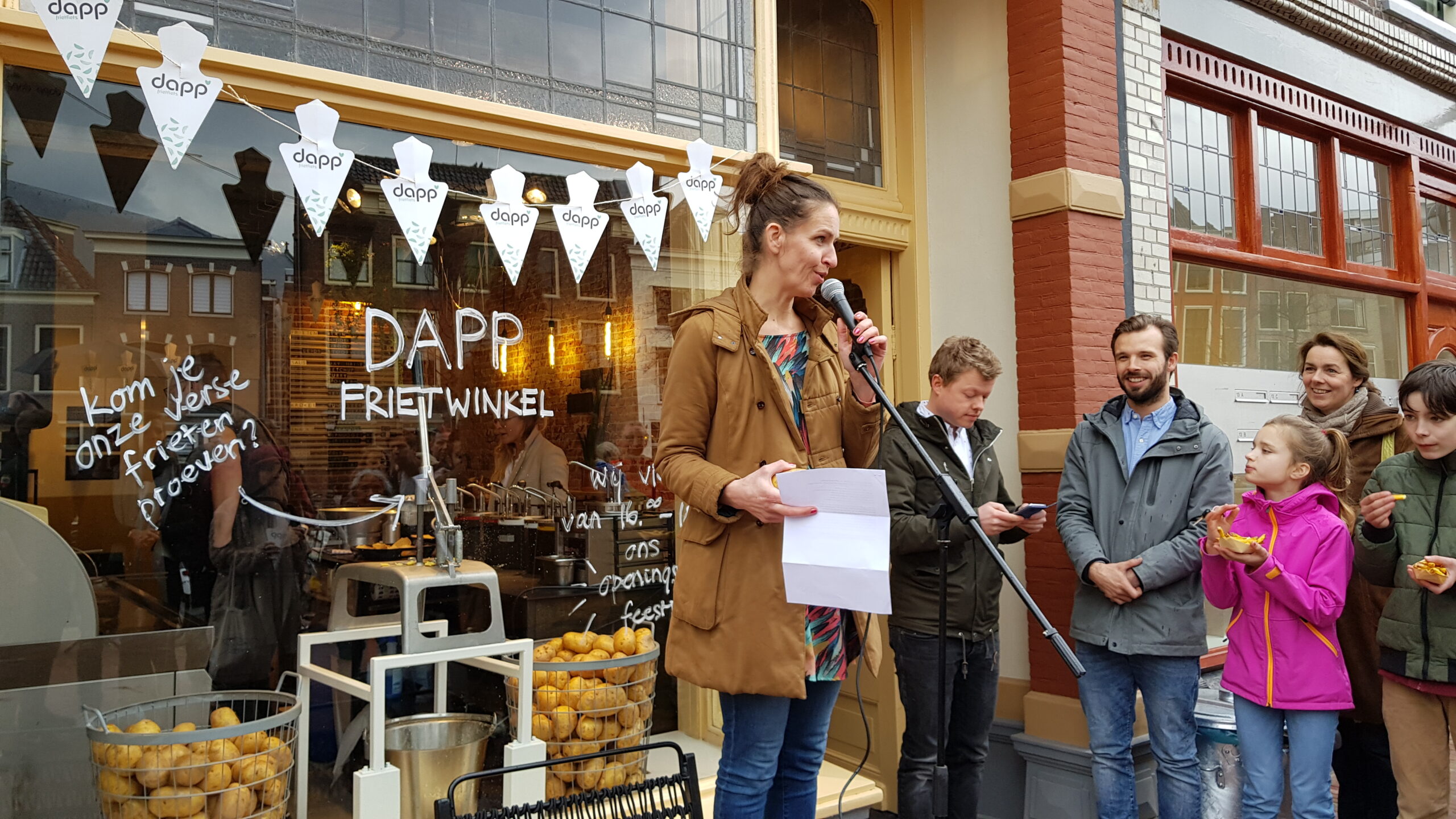 De Leidse stadsdichter Marianne van Velzen opende zaterdag de nieuwste vestiging van Dapp Frietwinkel aan de Aalmarkt. Ze deed dat met een speciaal voor de gelegenheid geschreven sprookjesgedicht. “want jullie verhaal laat zich lezen als een sprookje”, zei ze tegen oprichters Roderick en Siem.