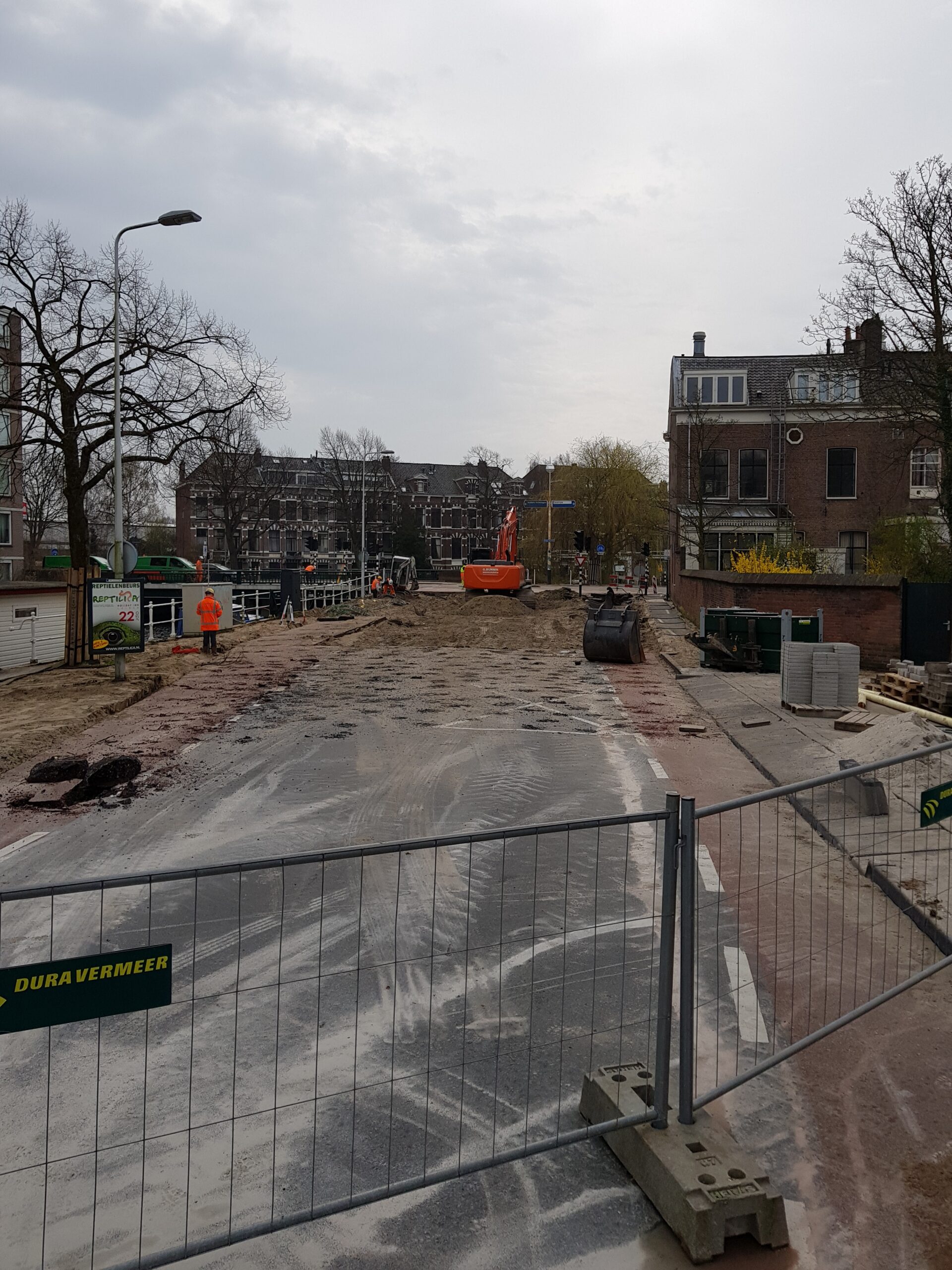 De komende drie weken ondervindt het verkeer ernstige overlast door de herinrichting van de Plantagelaan en het Utrechtse Veer in Leiden. Om die overlast zo kort mogelijk te laten duren werkt aannemer Dura Vermeer de klok rond.
