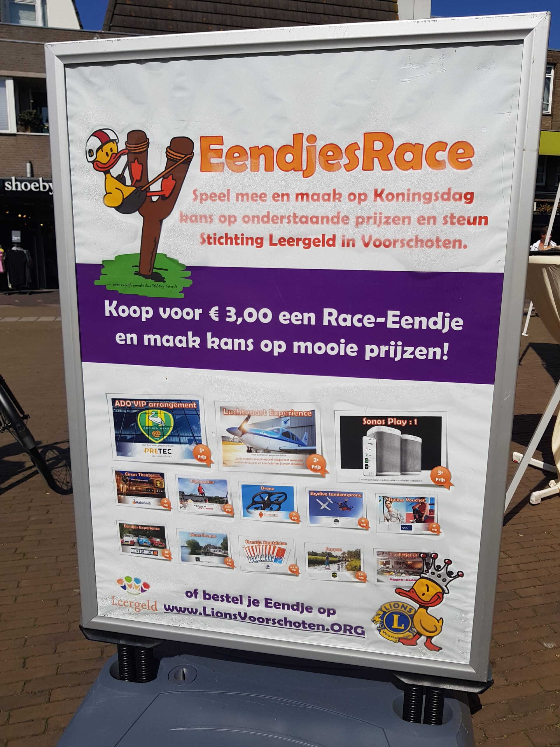 De race-eendjes zijn te koop via www.lionsvoorschoten.nl en op Koningsdag tot 12.00 uur ’s morgens bij de verkoopstand van de Lions in de Schoolstraat ter hoogte van Van Wees Mode. De eendjes kosten 2,50 per stuk. bij grotere aantallen geldt een korting.