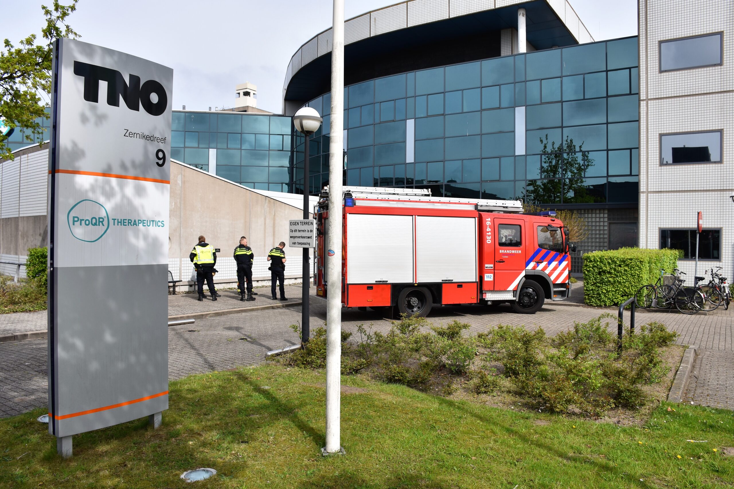 Het gebouw van TNO en en ProQR Therapeutics aan de Zernikedreef op het Leiden Bio Science Park is enige tijd ontruimd geweest na een brandalarm. Rond 11.00 uur ging het alarm en en werd iedereen naar buiten gedirigeerd.
