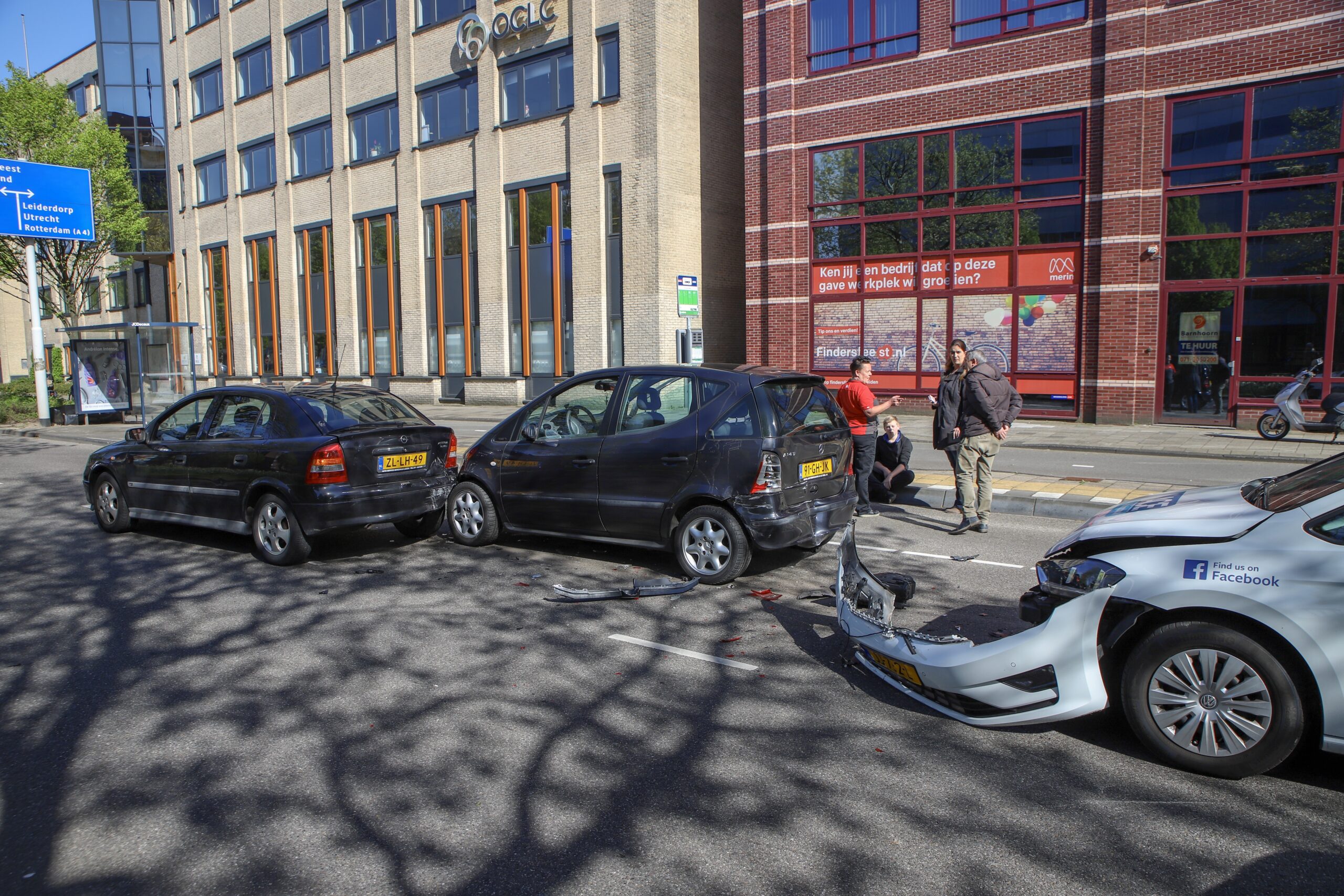 Vanmiddag zijn rond 16.30 uur drie auto’s op elkaar gebotst op de Schipholweg in Leiden. Eén van de voertuigen, een leswagen, raakte flink beschadigd. Het ambulancepersoneel heeft twee inzittenden van de auto’s nagekeken maar het bleek niet nodig om ze naar het ziekenhuis over te brengen.