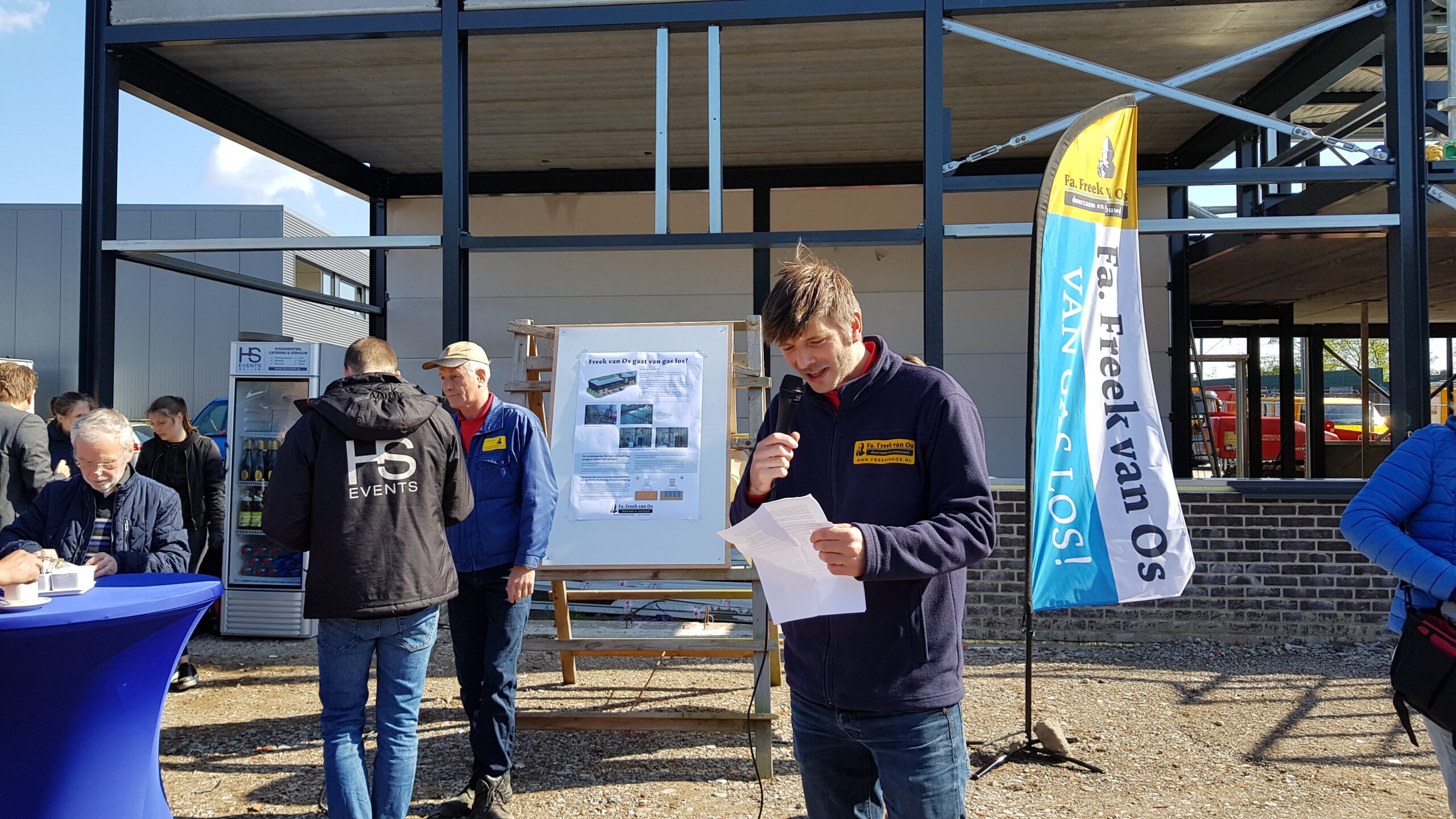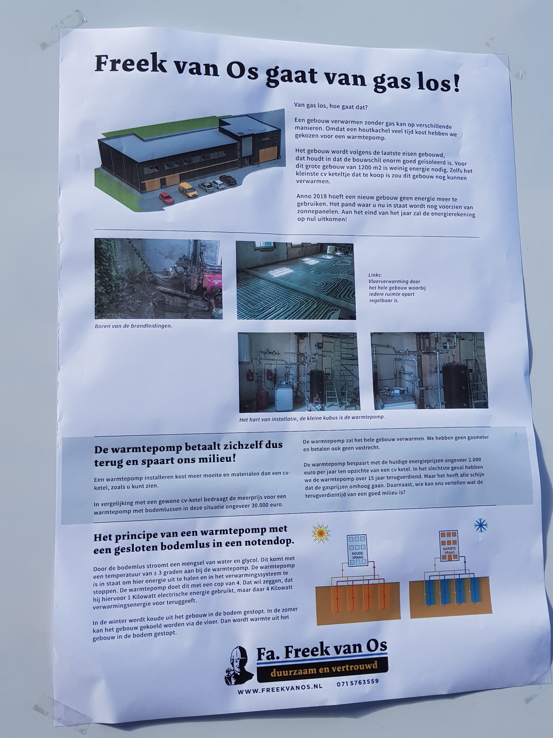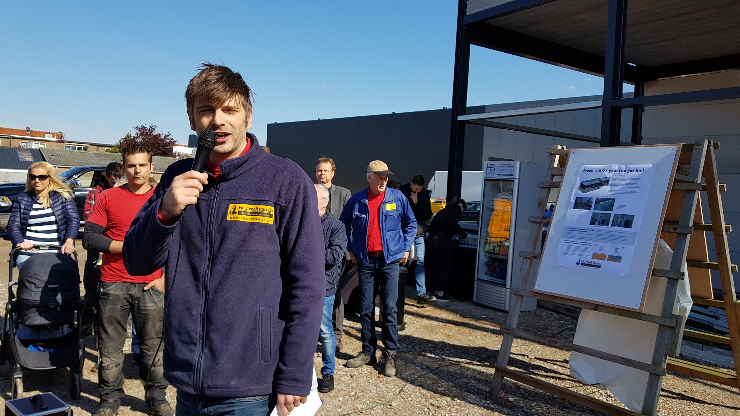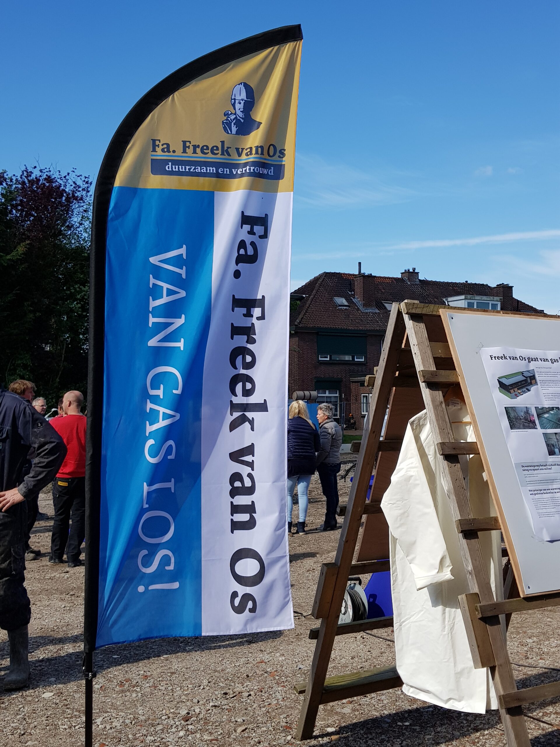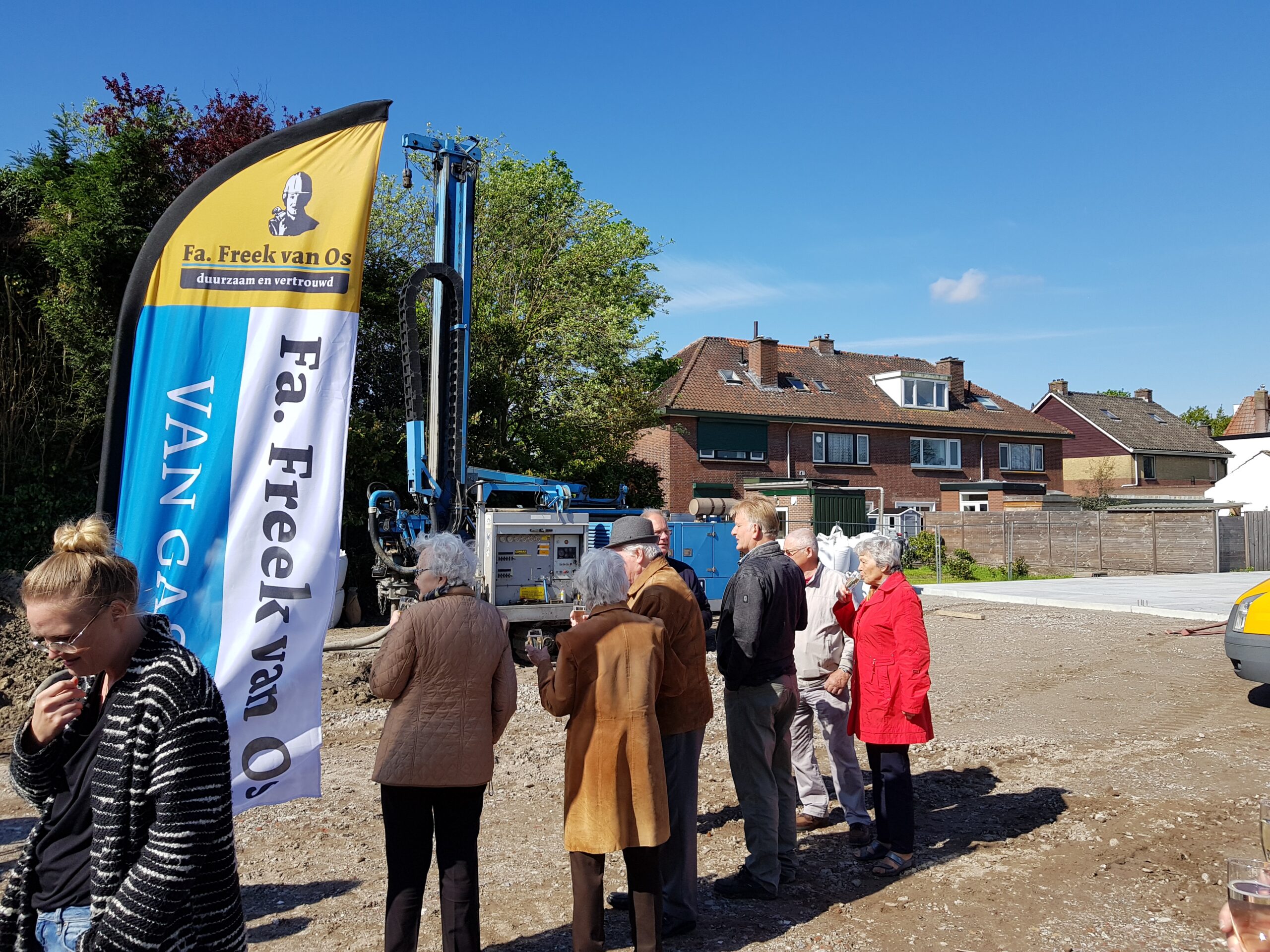 De Firma Freek van Os gaat van gas los! Met die slogan werd vandaag gevierd dat bij de nieuwbouw die het bedrijf pleegt in de Dobbewijk in Voorschoten de eerste stap is gezet naar het duurzaam verwarmen van het nieuwe pand dat in augustus opgeleverd moet worden.