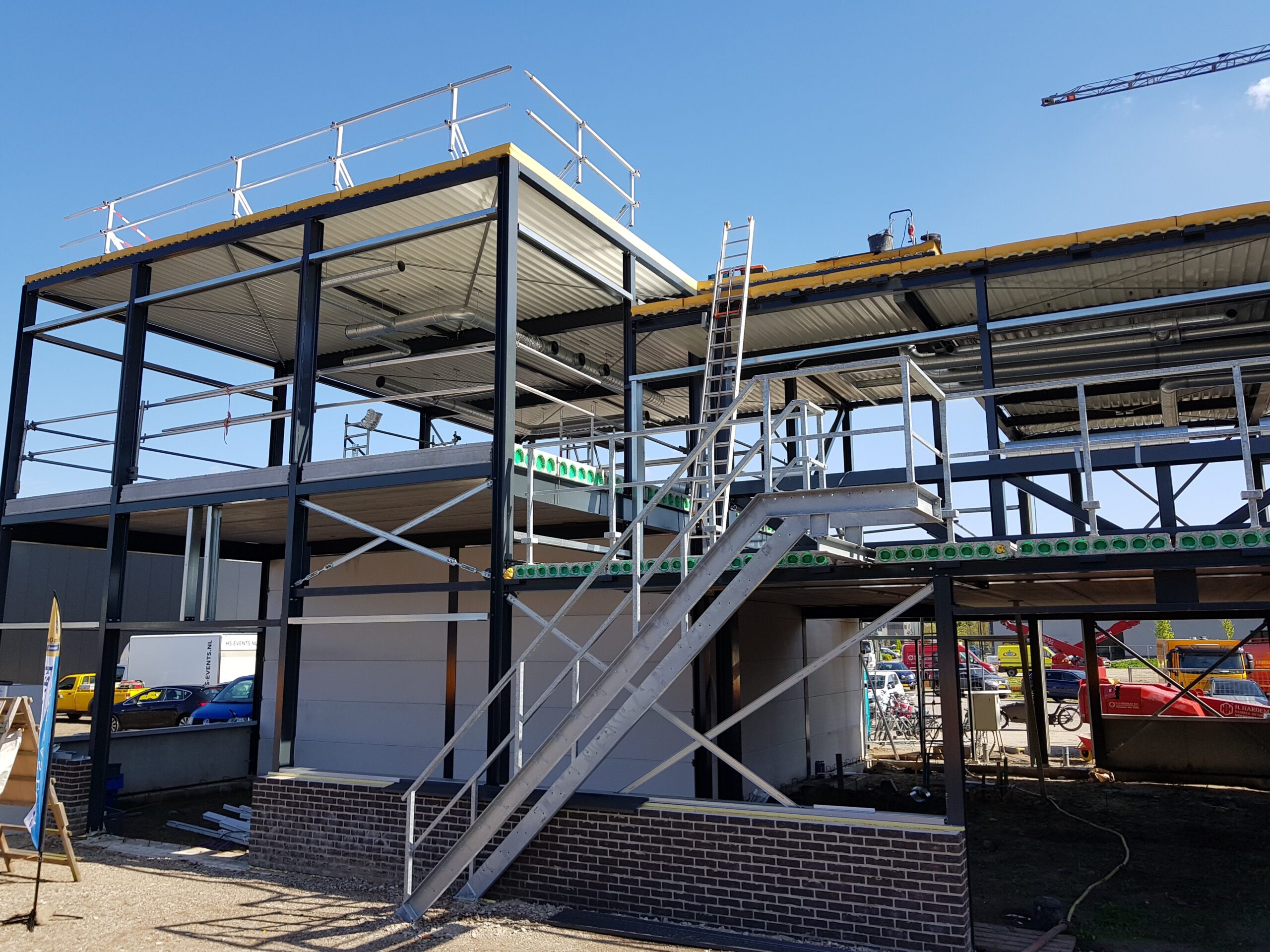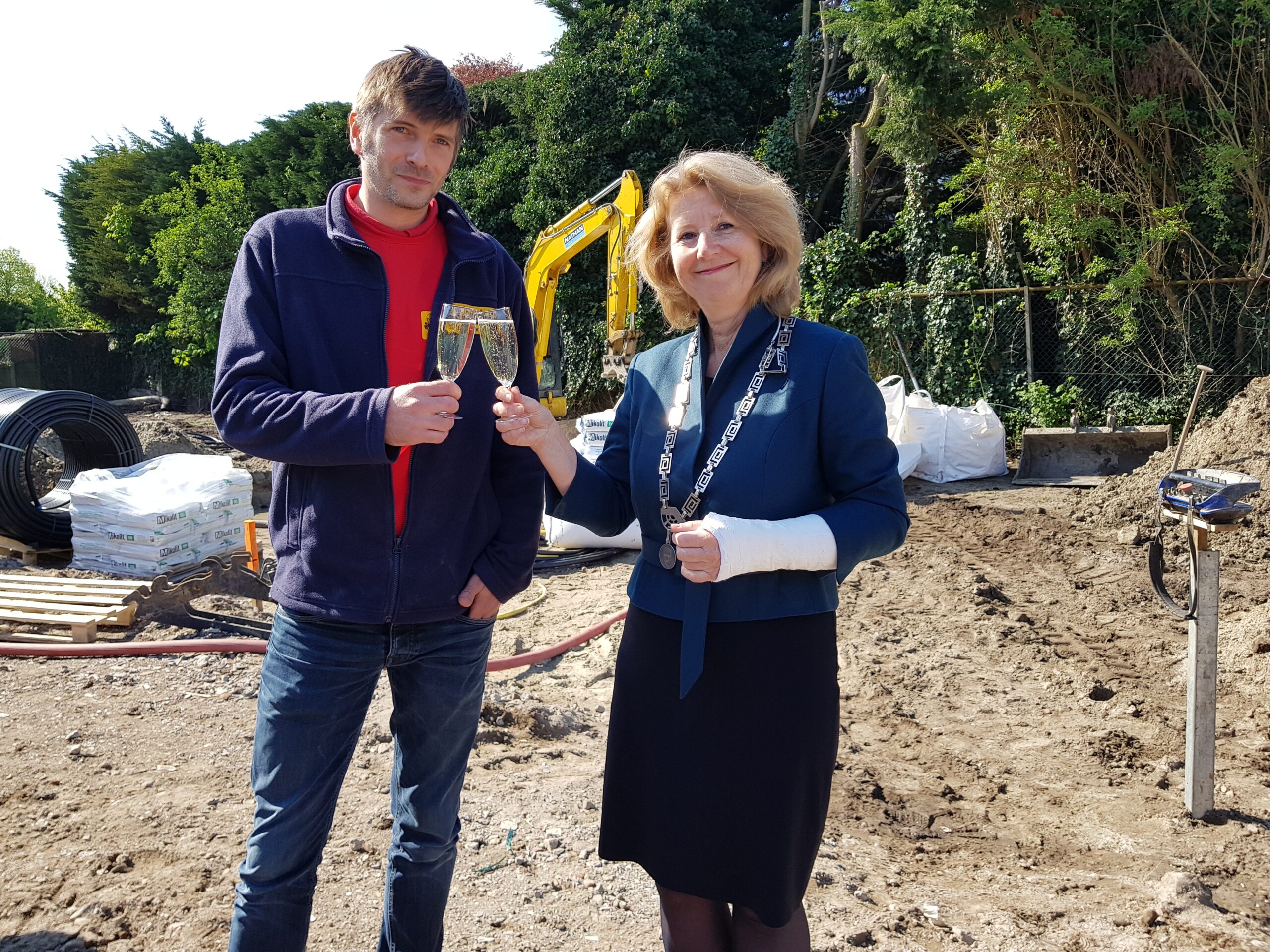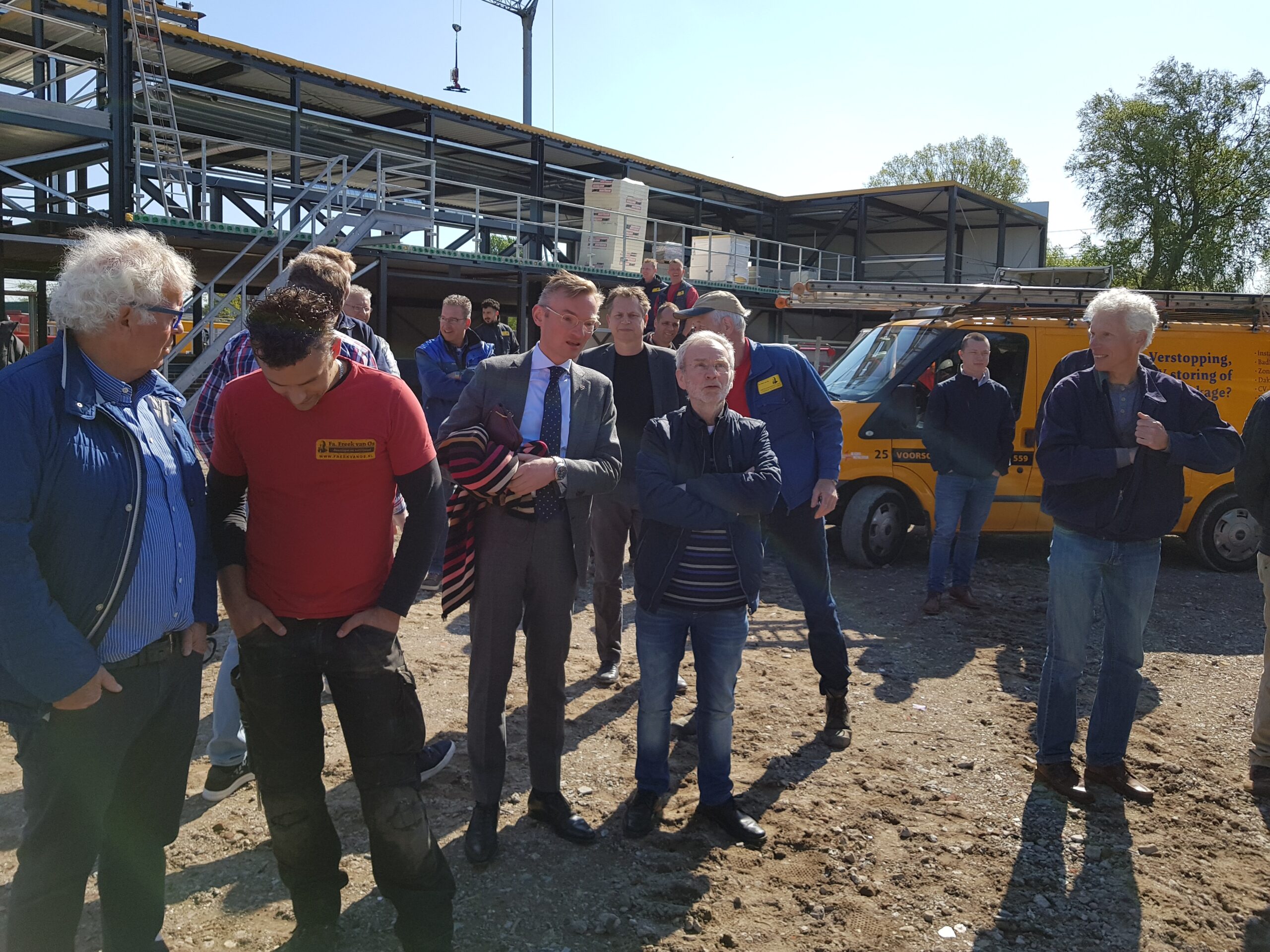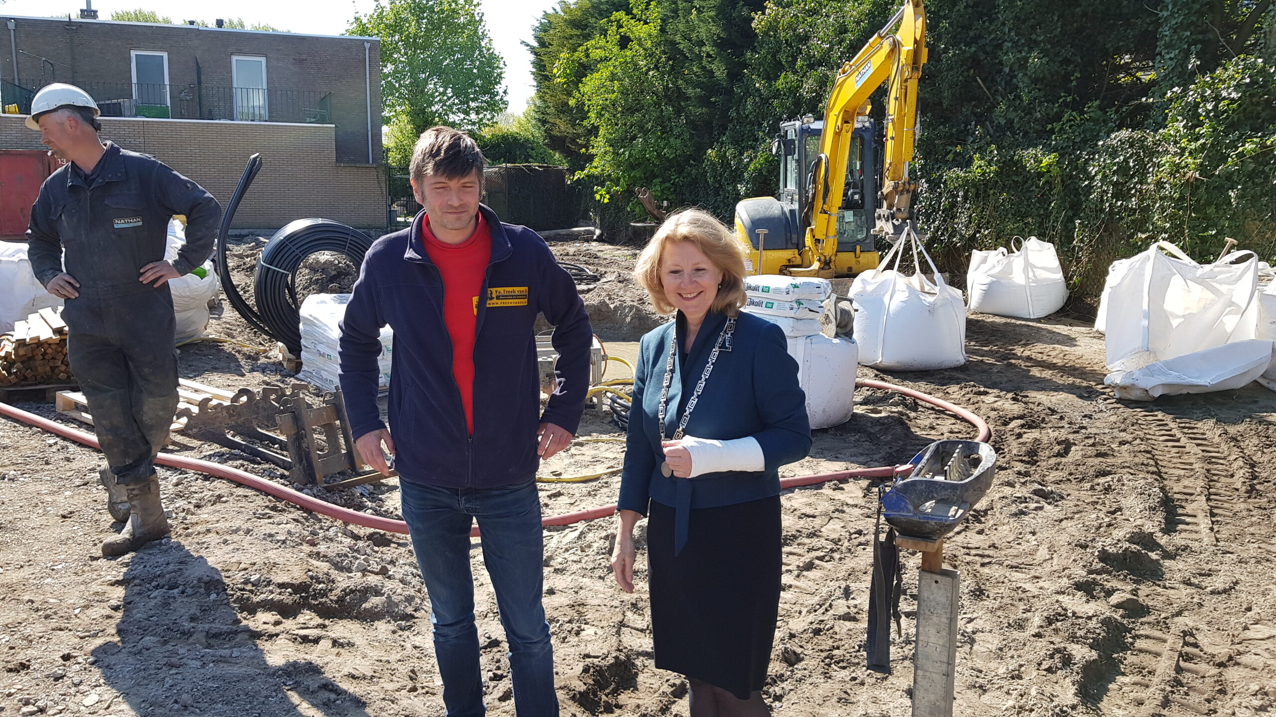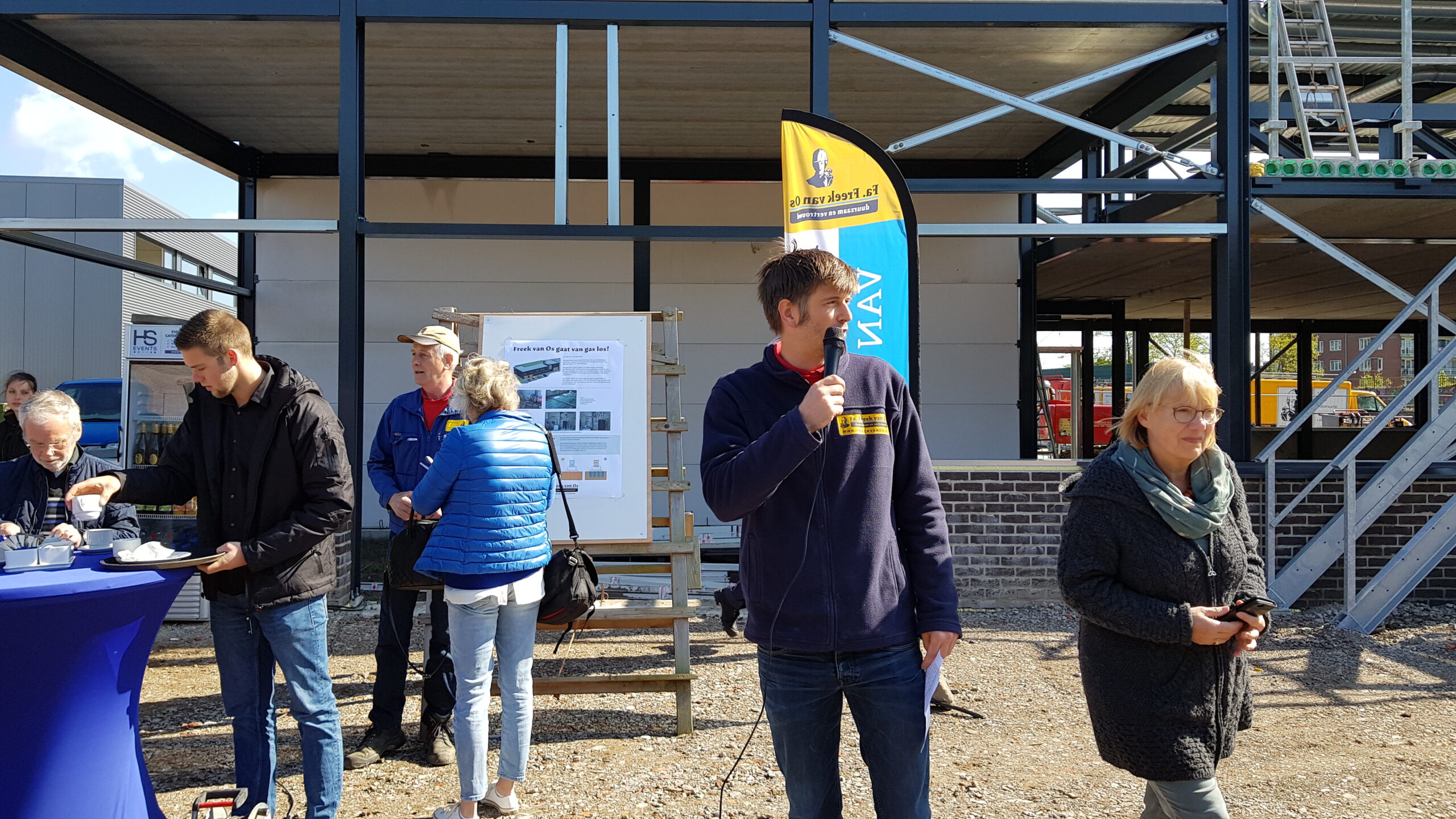 De Firma Freek van Os gaat van gas los! Met die slogan werd vandaag gevierd dat bij de nieuwbouw die het bedrijf pleegt in de Dobbewijk in Voorschoten de eerste stap is gezet naar het duurzaam verwarmen van het nieuwe pand dat in augustus opgeleverd moet worden.