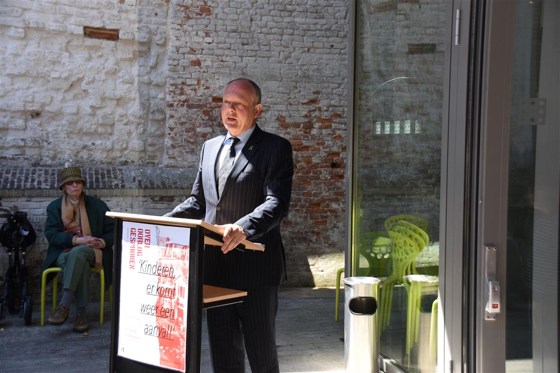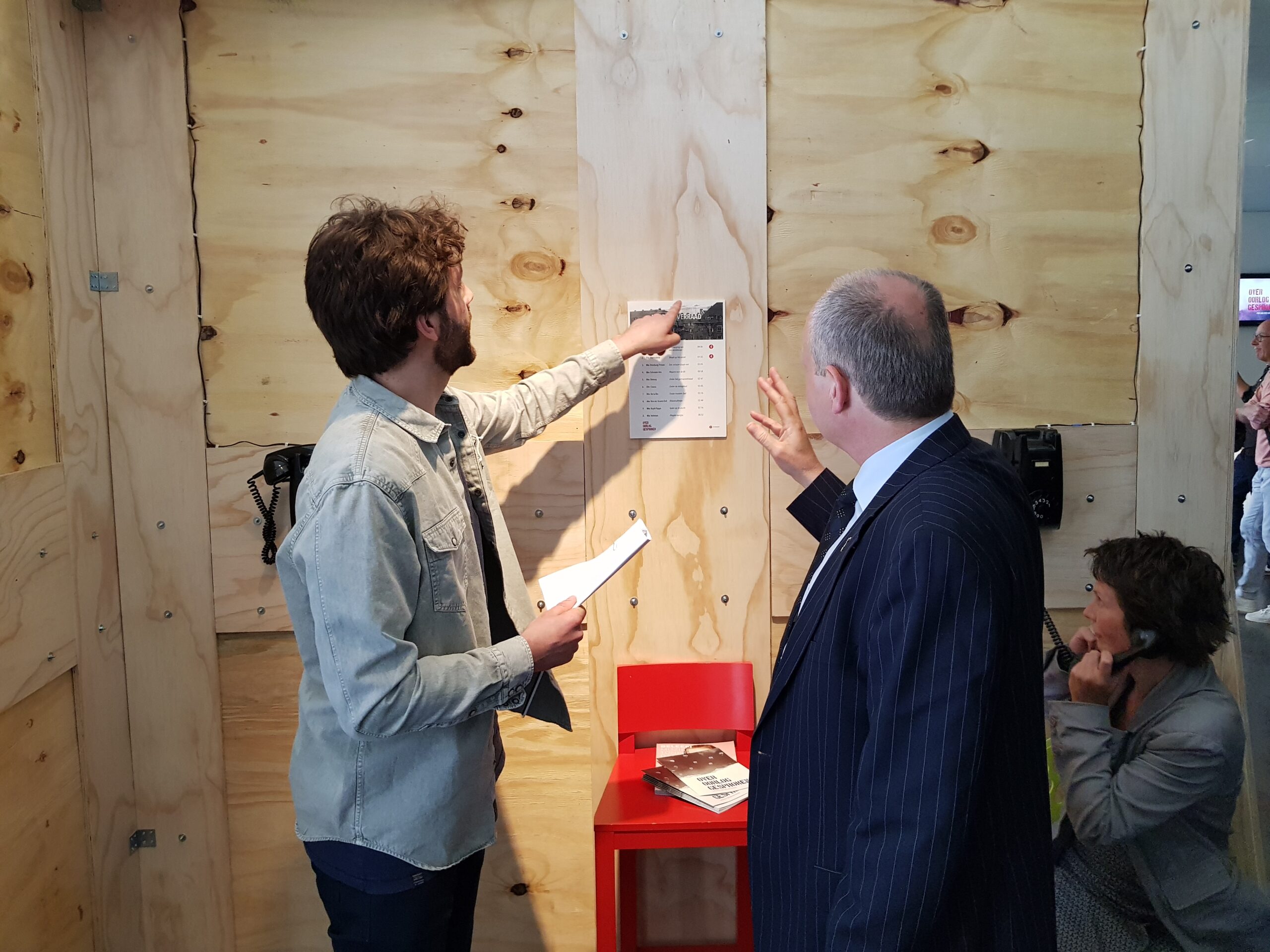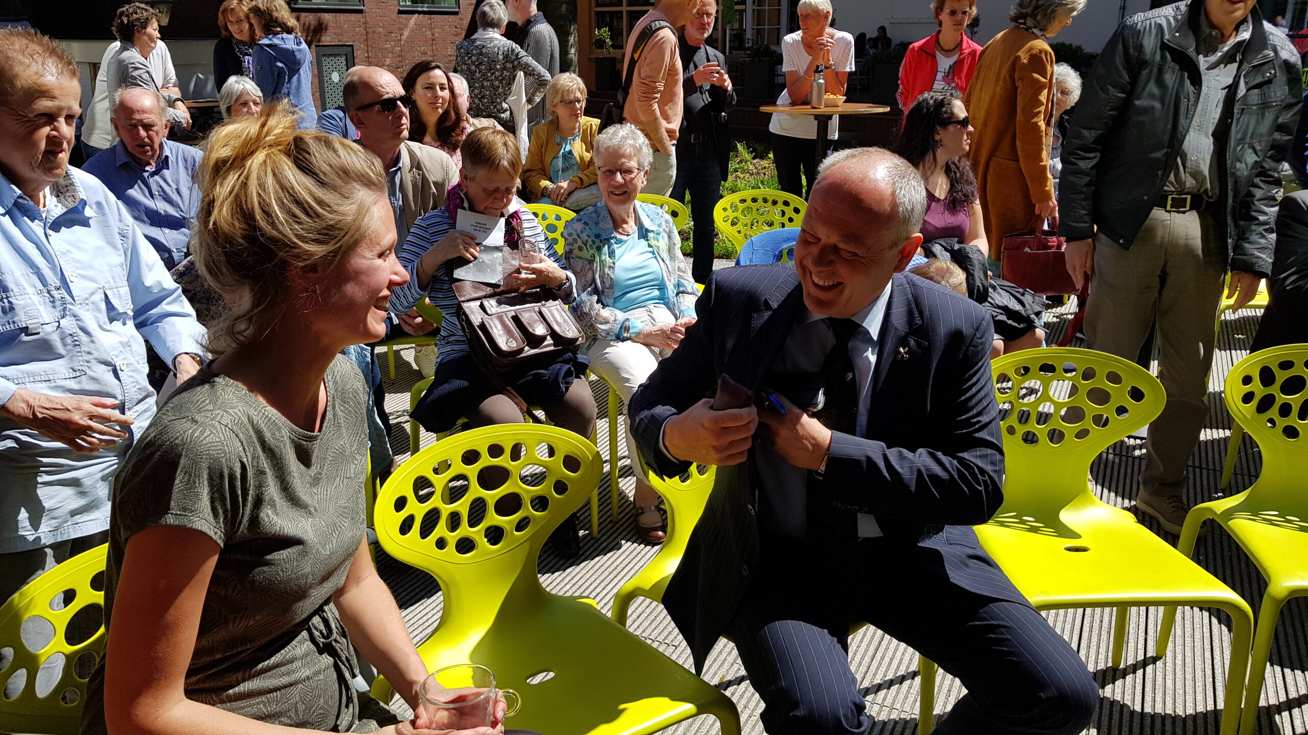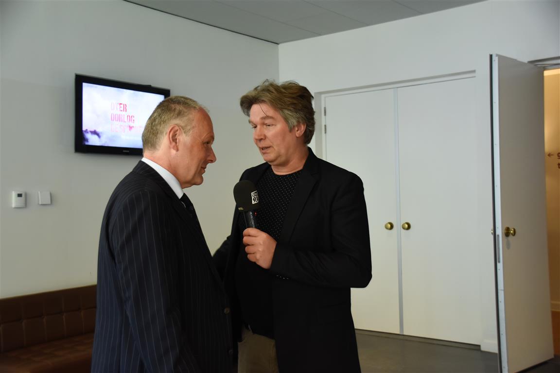 Chris de Waard in gesprek met burgemeester Lenferink over de expositie ‘Over Oorlog gesproken’.