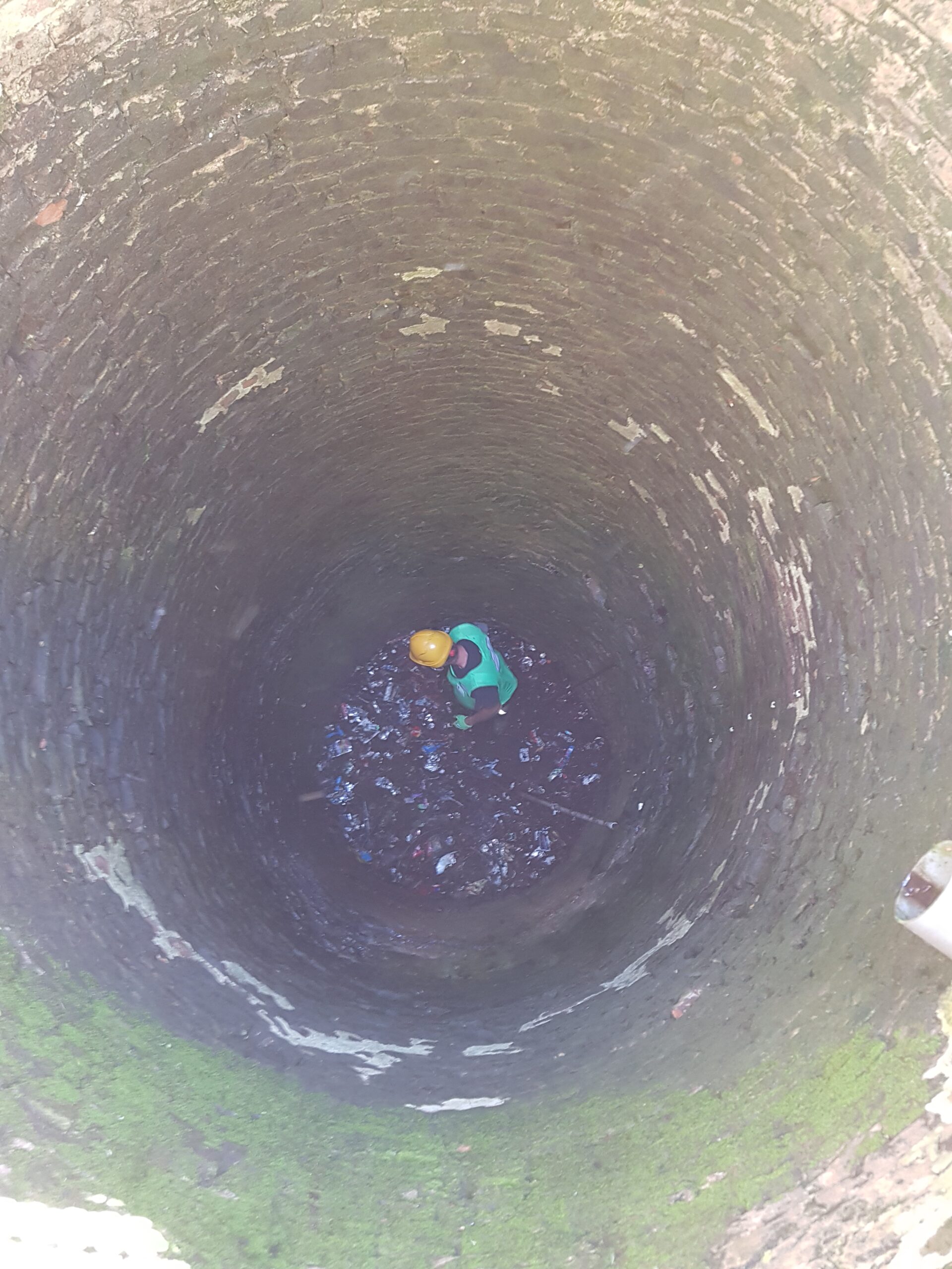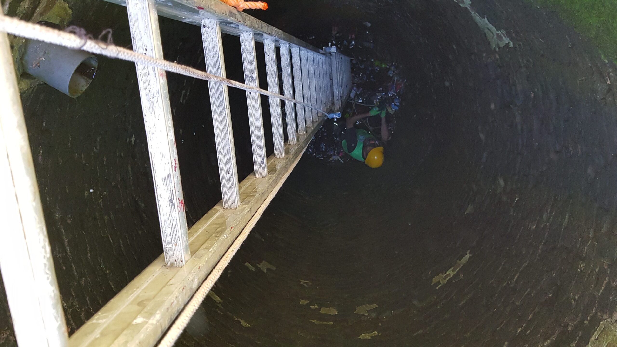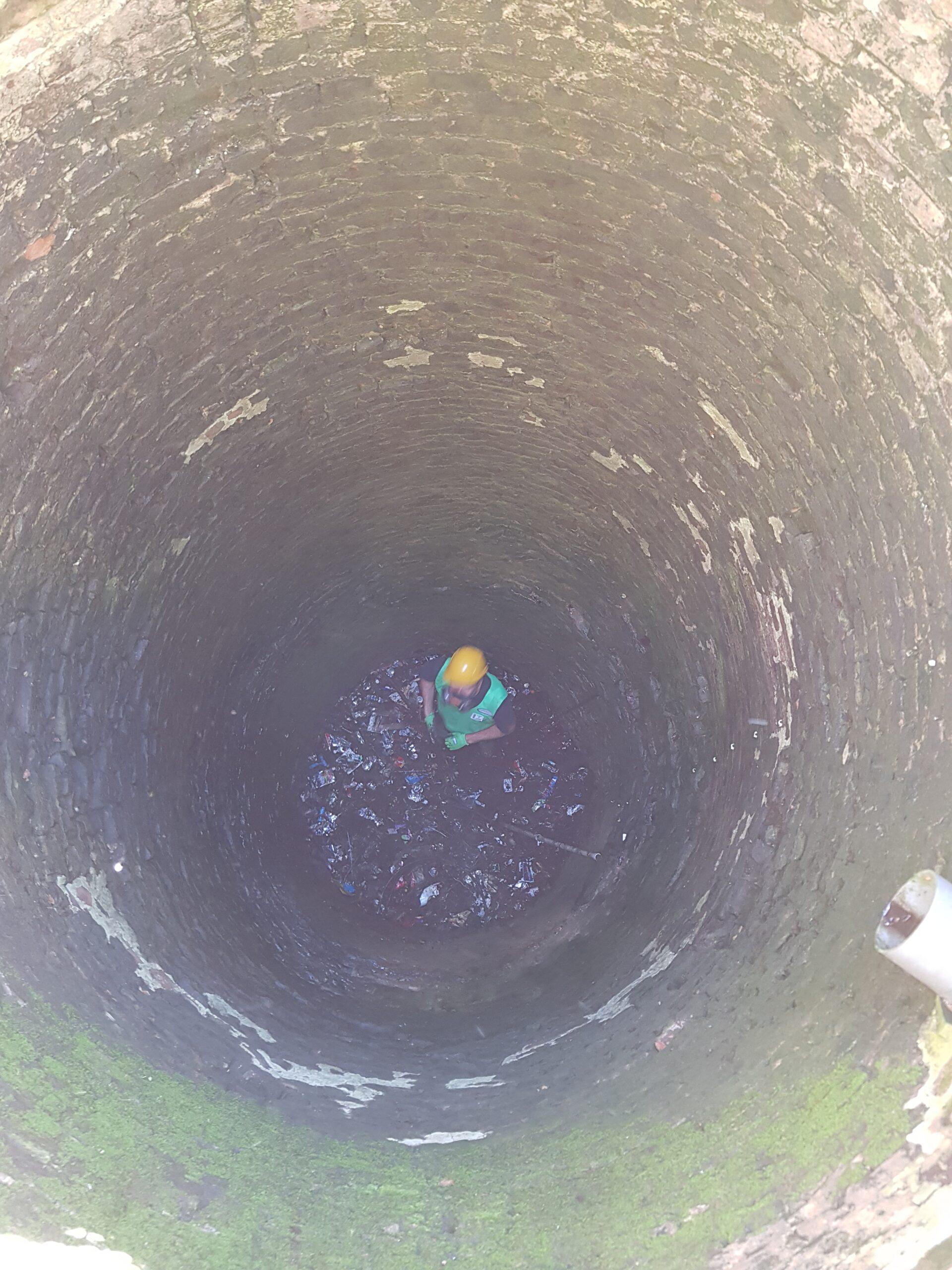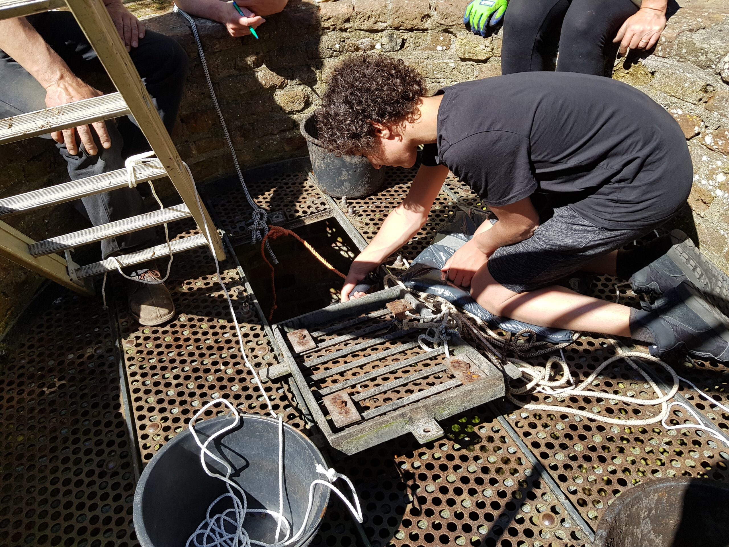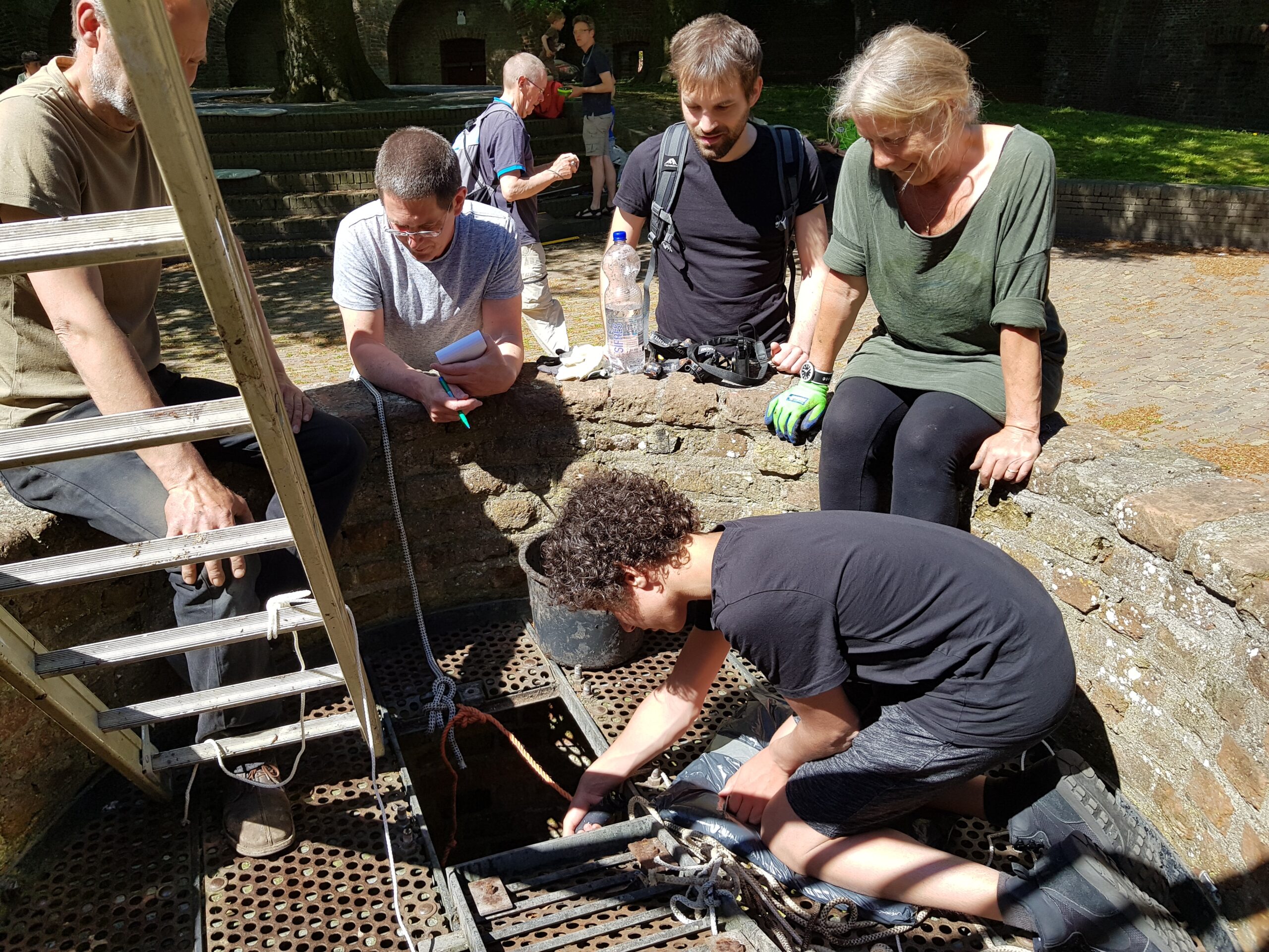Mede-initiatiefnemer Daniel Siepman daalde rond 11.00 uur vanmorgen af naar de bodem van de waterput. Gewapend meet mijnwerkersapparatuur zoals een helm met lamp en een gasmasker schepte hij de ene na de andere emmer vol rommel die tientallen centimeters dik op de bodem van de put lag. Pas een dikke twee uur later zag hij het daglicht weer. Later werd ook nog met een magneet naar muntjes en andere metalen gevist.