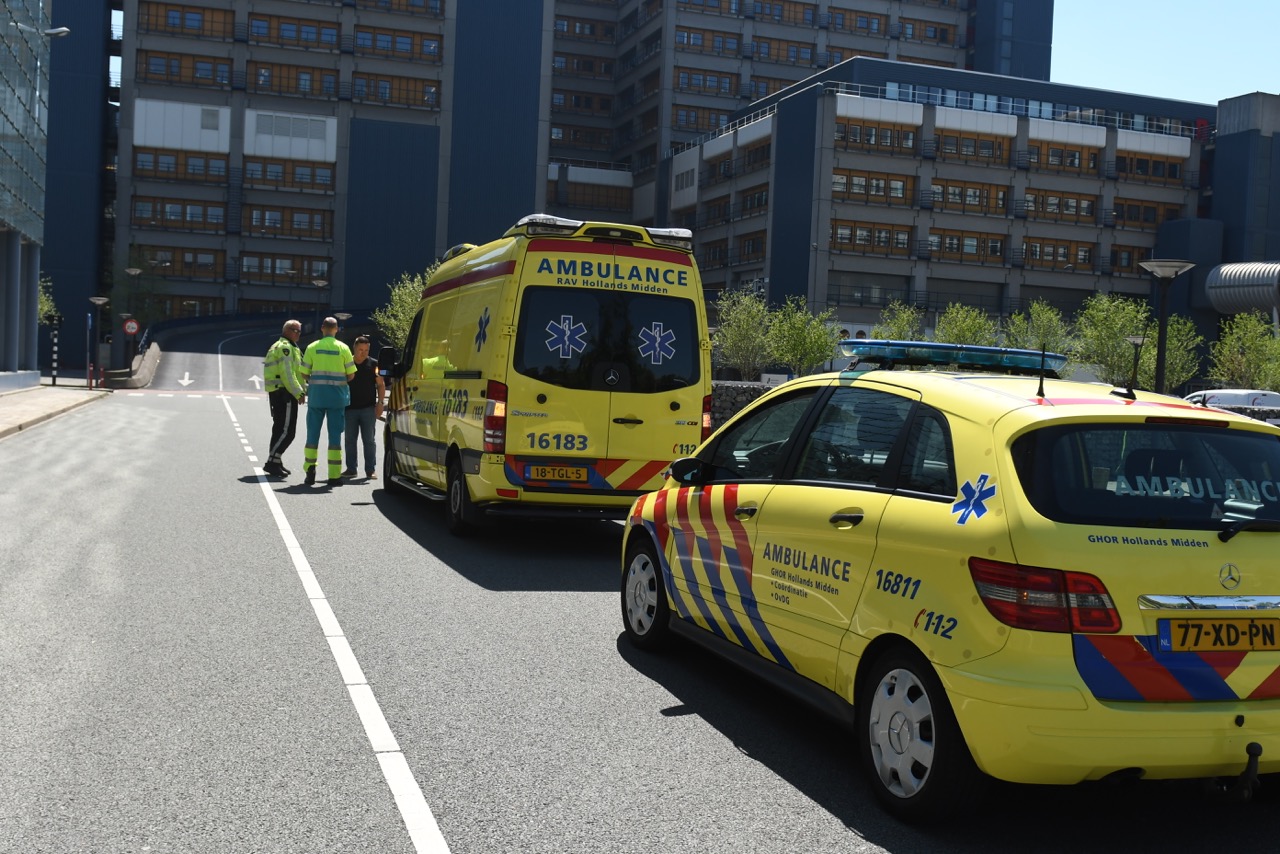Een vrouw is op het terrein van het LUMC in Leiden met haar fiets tegen een ambulance aangereden. Het ongeval vond plaats op de oversteekplaats waar de ambulances naar de spoedeisende hulp rijden. Er klinkt daar een bel die bij ieder voertuig afgaat. De vrouw kon na controle haar weg weer vervolgen.