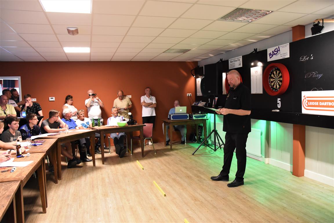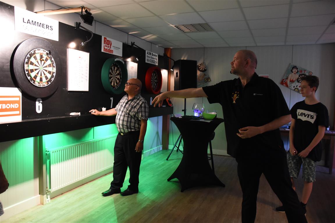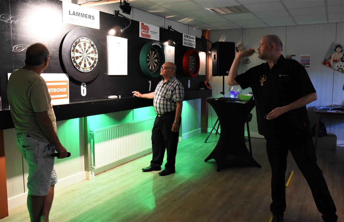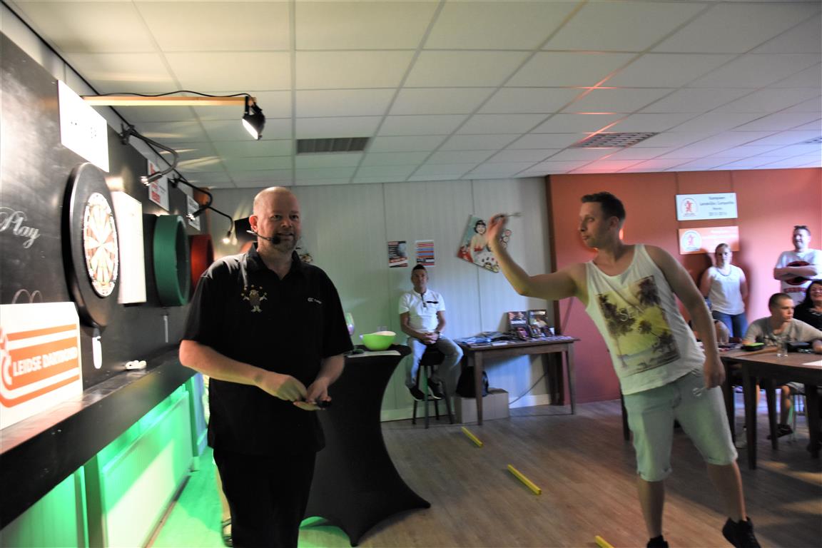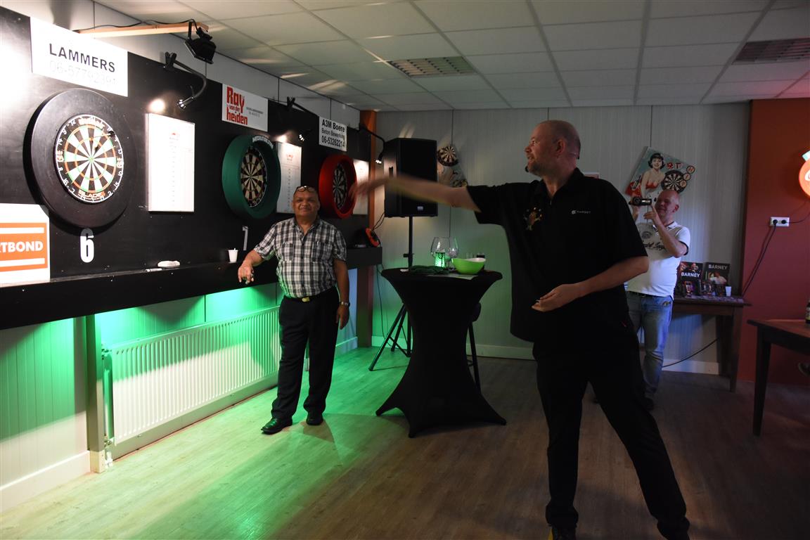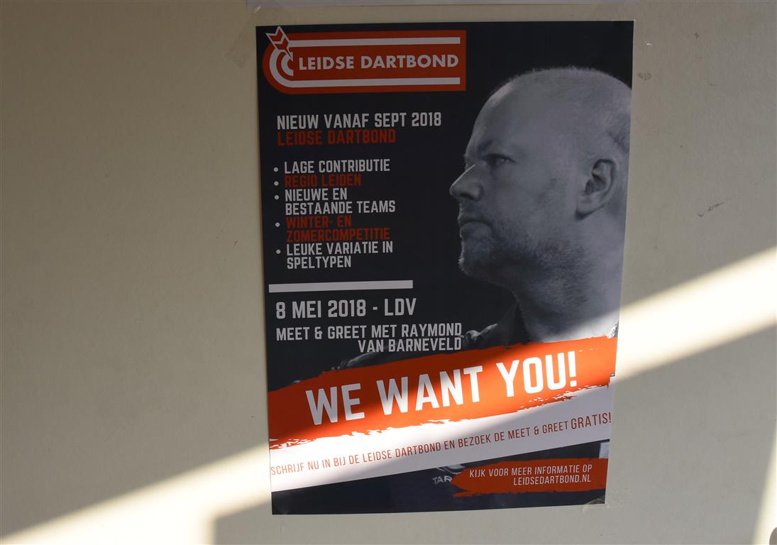 Vijfvoudig wereldkampioen Raymond van Barneveld was dinsdagavond op bezoek bij de Leidse Dart Vereniging aan de Voorschoterweg. Barney vertelde over zijn dartcarrière en speelde een quiz met de ruim 70 leden van de LDV. Een aantal leden was door loting uitgekozen om een leg tegen Barney te spelen, dat geen van hen kon winnen van de wereldkampioen verbaasde uiteraard niemand. Na afloop van de quiz en het darten beantwoordde Barney vragen vanuit het publiek en ging met met iedereen die dat wilde op de foto.