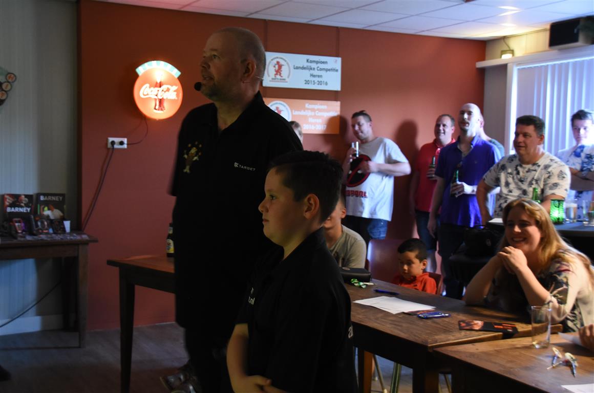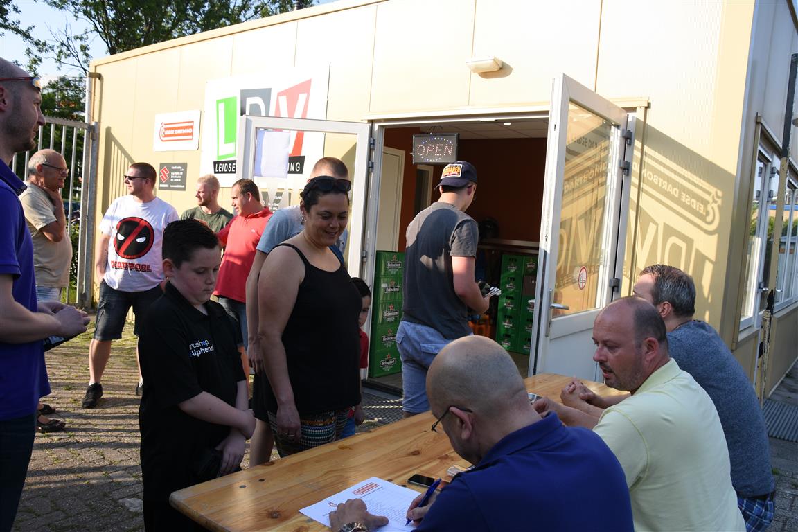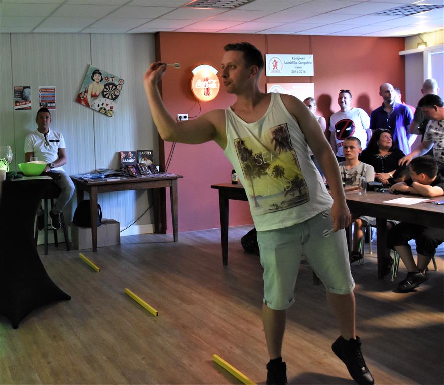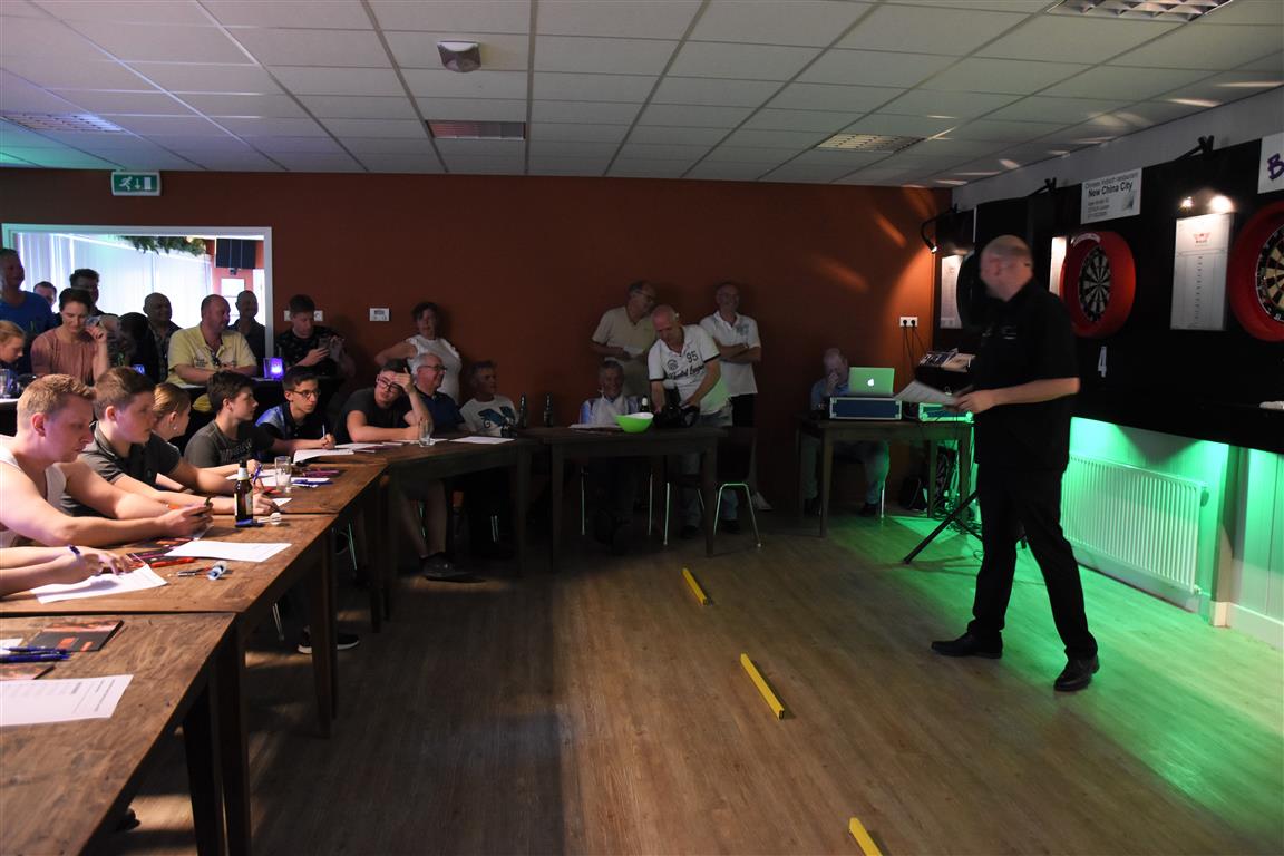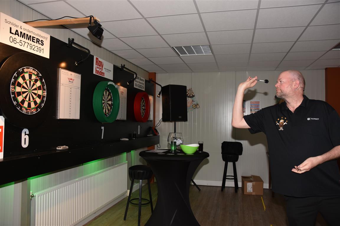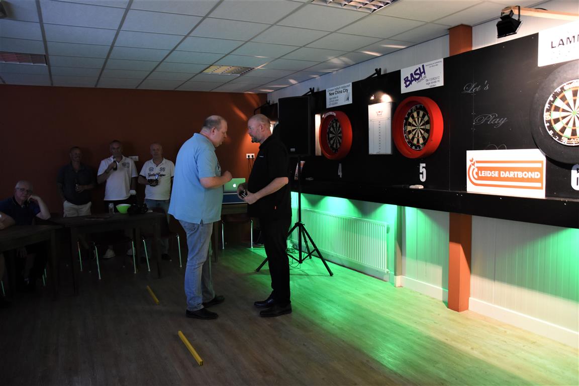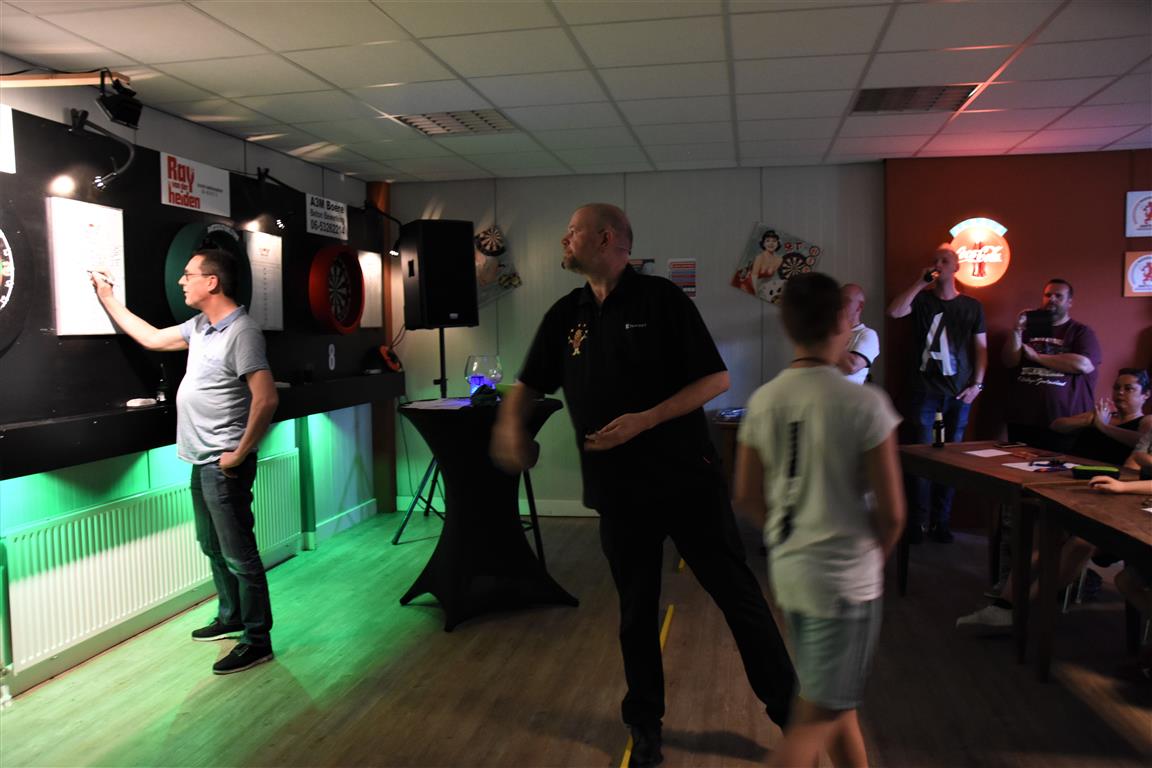 Vijfvoudig wereldkampioen Raymond van Barneveld was dinsdagavond op bezoek bij de Leidse Dart Vereniging aan de Voorschoterweg. Barney vertelde over zijn dartcarrière en speelde een quiz met de ruim 70 leden van de LDV. Een aantal leden was door loting uitgekozen om een leg tegen Barney te spelen, dat geen van hen kon winnen van de wereldkampioen verbaasde uiteraard niemand. Na afloop van de quiz en het darten beantwoordde Barney vragen vanuit het publiek en ging met met iedereen die dat wilde op de foto.