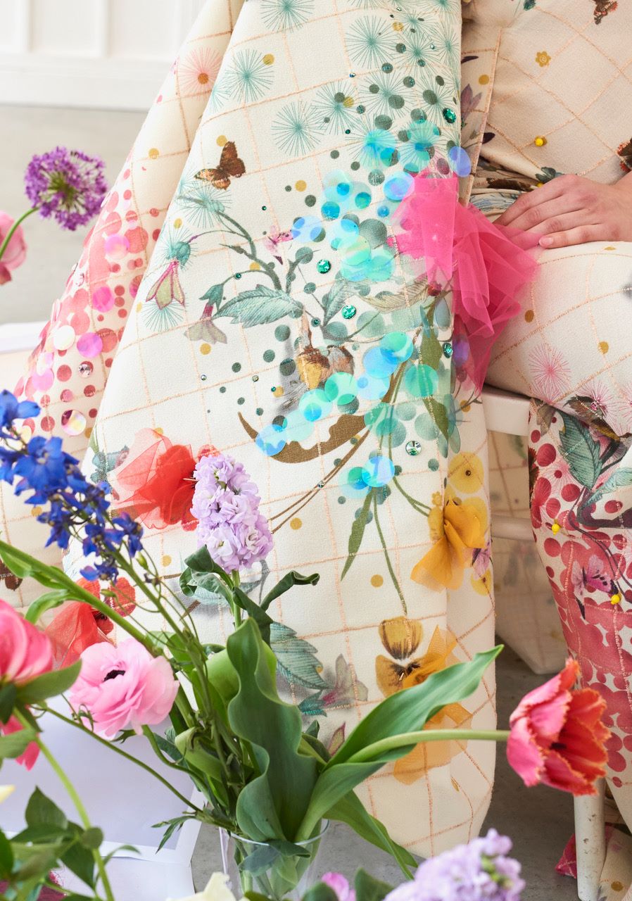 Edwin Oudshoorn werd bij zijn stofontwerp geïnspireerd door de collectie Amphora-aardewerk en de collectie stofstalen van Museum De Lakenhal. In dit hoogwaardige aardewerk staan sierlijke en abstracte motieven centraal die zijn gebaseerd op florale en dierlijke decors. Deze elementen vertaalde Edwin Oudshoorn naar een eigen ontwerp van florale patronen, vogels, vlinders en geabstraheerde vormen in felle zomerse kleuren zoals rood, geel en roze. De ontwerper koos een dunne, soepele, crèmekleurige wollen stof met een ingeweven raster van bronskleurig chenilledraad, dat de ruiten van historische stofstalen en hun envelopjes weerspiegelt. Hierop printte hij zijn zeer gelaagde en uitbundige ontwerp. Het raster vormt een stoer contrast met het kleurrijke patroon: een spannende hedendaagse vertaling van Leids Laken.