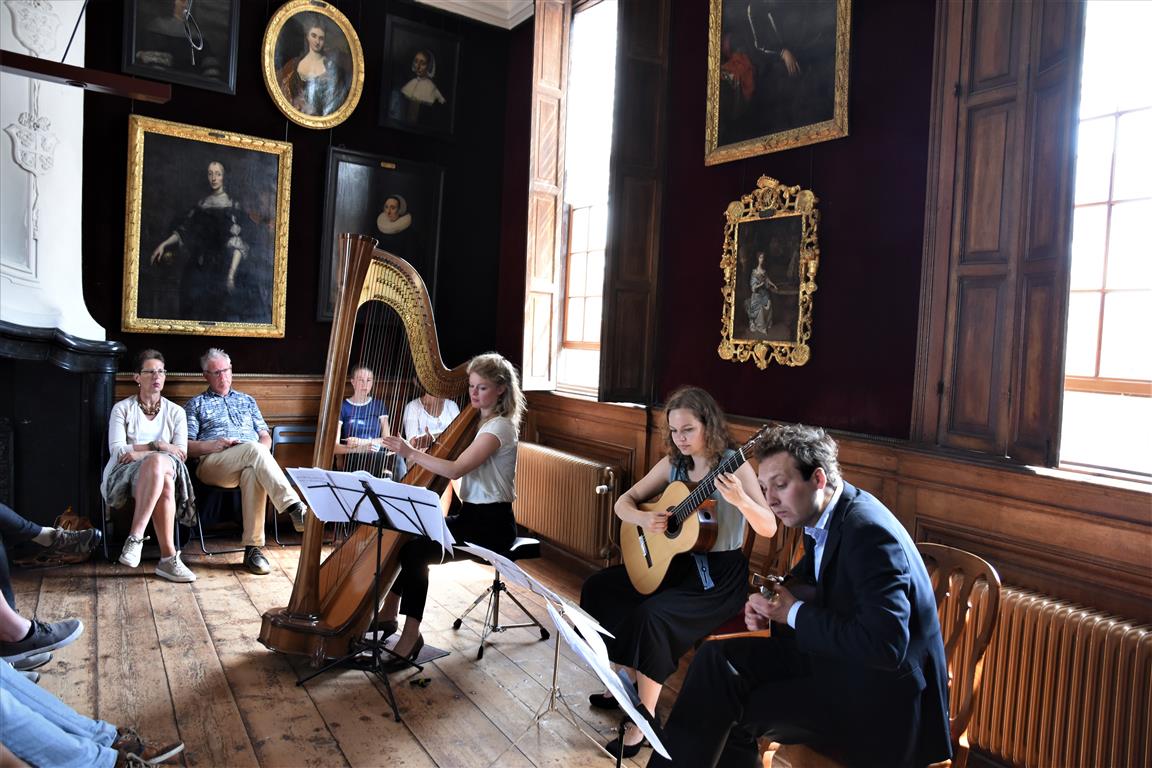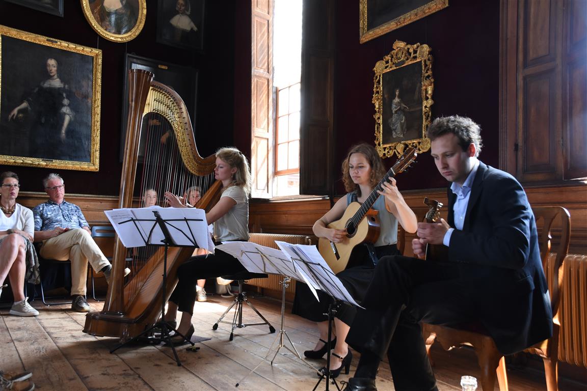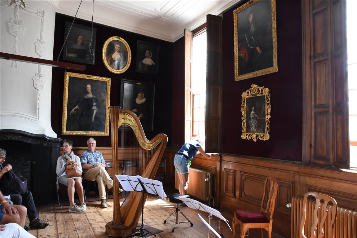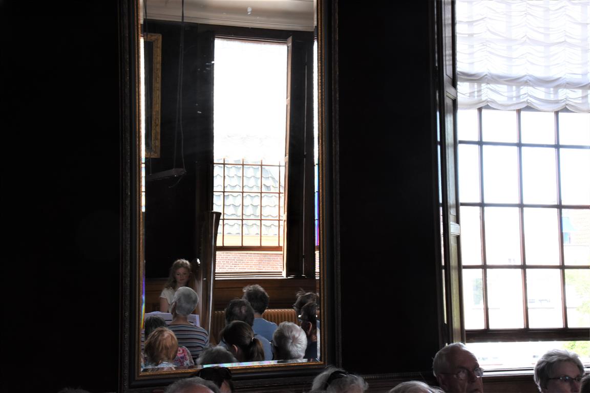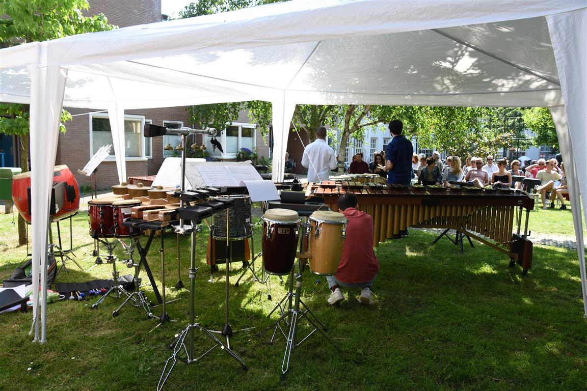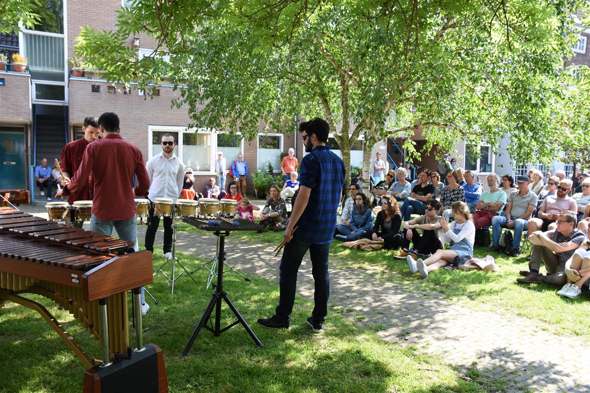 De Hofjesconcerten 2018 kunnen in de herinnering worden opgeslagen als zomerse hofjesconcerten. In de loop van de middag bleken de partytenten de muzikanten niet tegen regen maar wel tegen felle zon te beschermen. In het Jean Michelhof bespeelde Martijn Boom de marimba. Velocities (van J. Schwantner) eiste een hoog tempo van de mallets, de stokken waarmee de staven, de houten ’toetsen’ worden aangeslagen. Hard werken, dus; en dat met een zwart overhemd. Maar wel erg gaaf om te horen.
