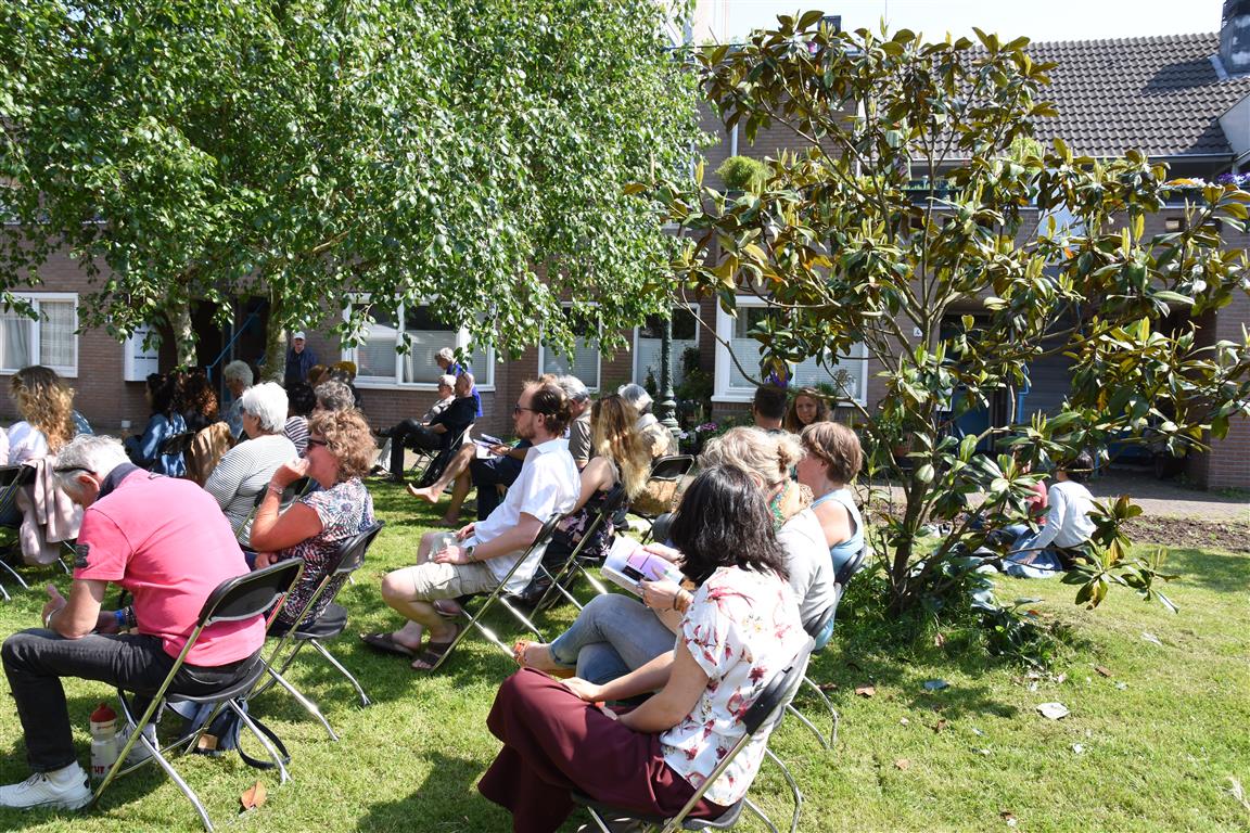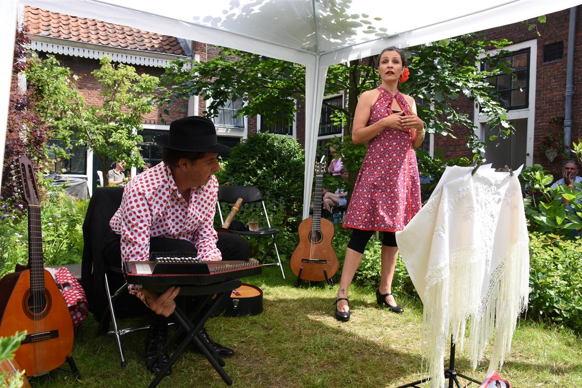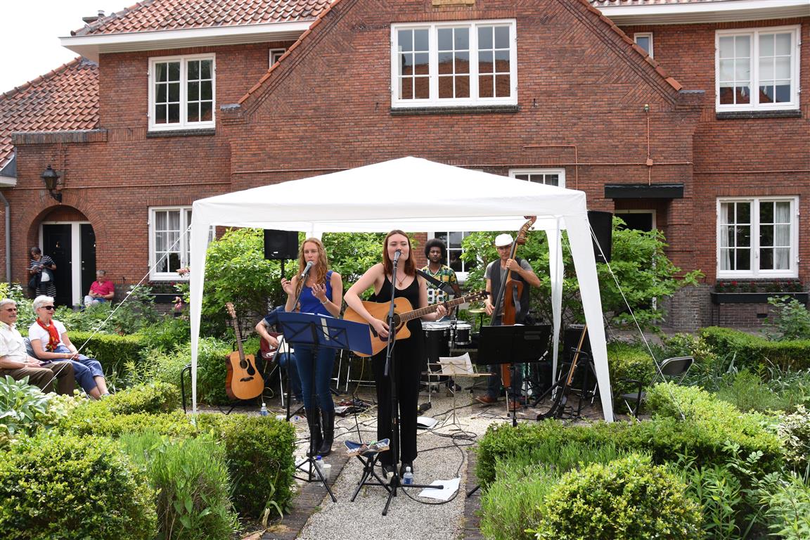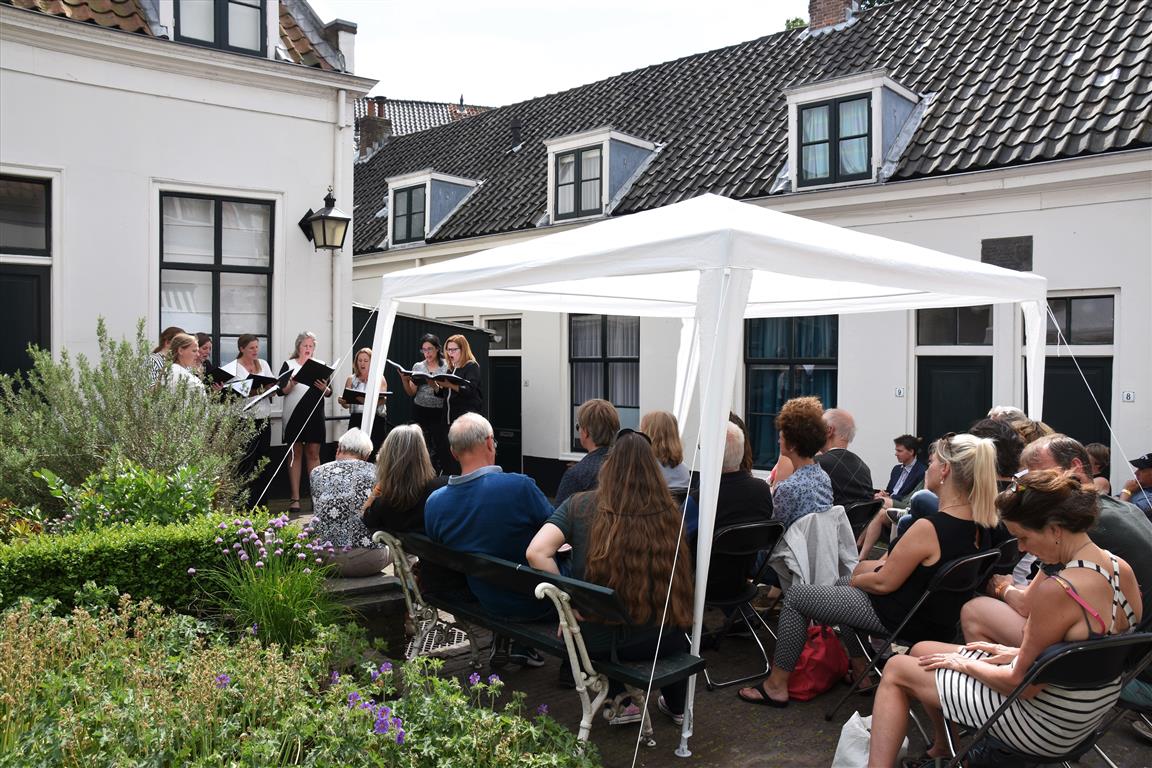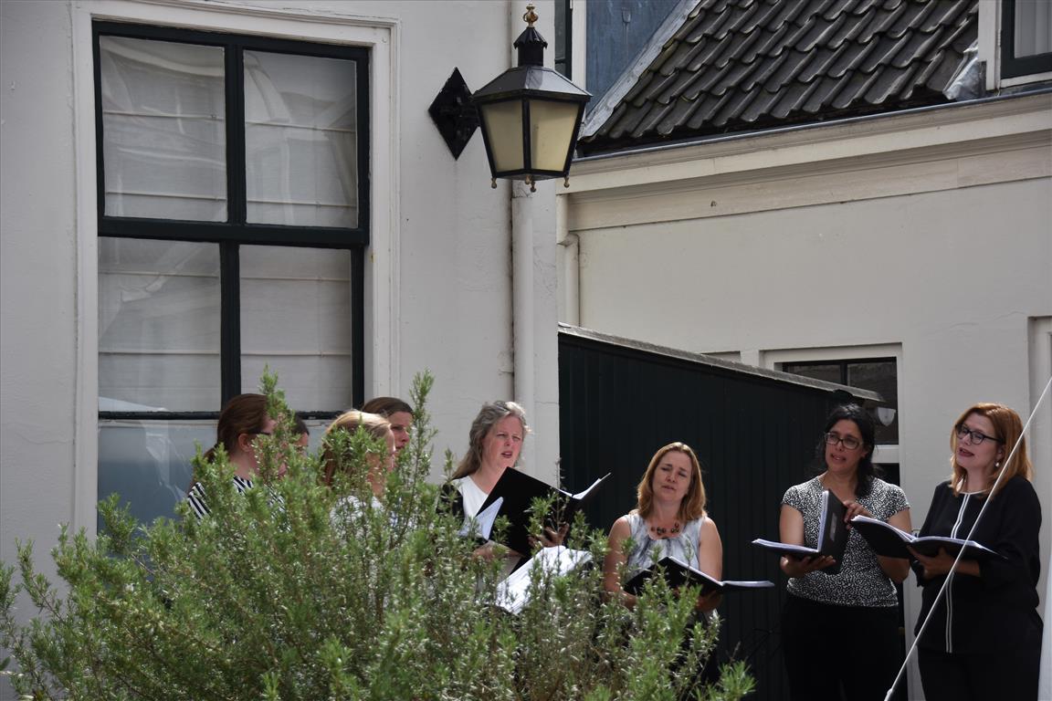 In het Heilig Geesthof leek het eerder op de middag bij Suzanne Sanders iets koeler. Zij en haar band speelden/zongen muziek die misschien iets meer in overeenstemming was met de temperatuur: haast laid back, mooie tweestemmigheid van de zangeressen die bekend en eigen materiaal brachten. Terloops bleek ook de reikwijdte van de Hofjesconcerten. Gevraagd naar waar men vandaan kwam, kwamen ook antwoorden als Den Haag en Anna Paulowna.