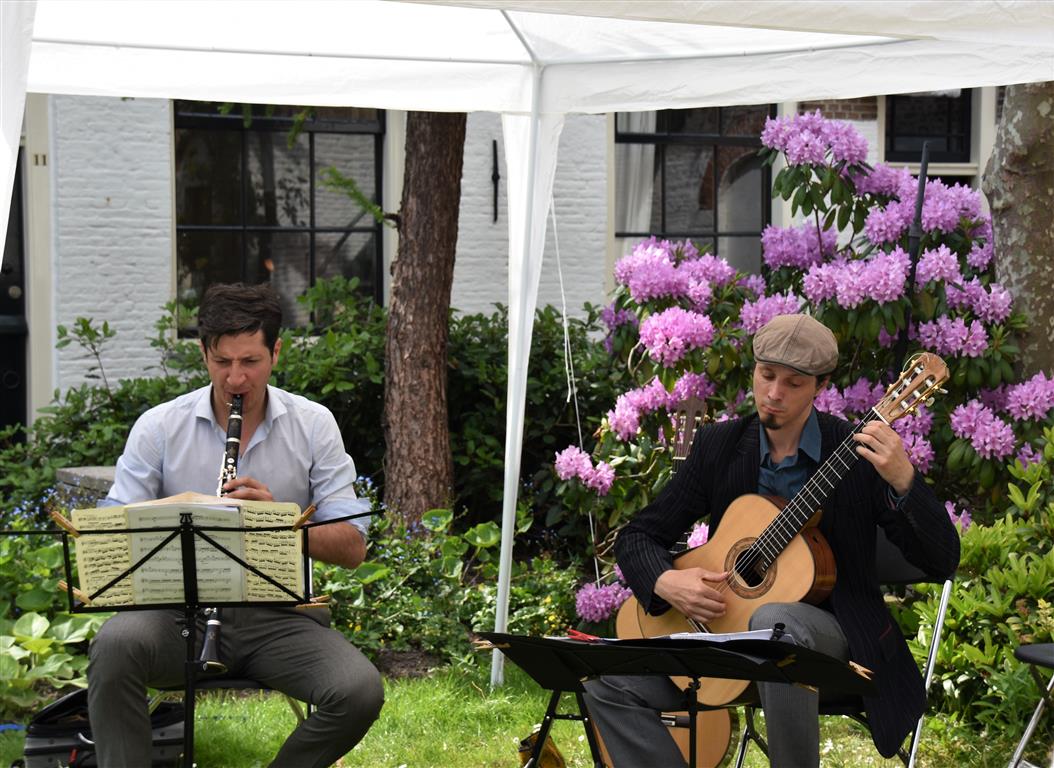 Schroeiend warm was het in het Sint Salvatorhof. De warmte zal ook de reden zijn geweest voor de twee brandweerwagens om in de Steenstraat stil te staan, niet onverstandig een verkwikkend ijsje met dit weer. Klarinet en gitaar zijn, volgens het programmaboekje, een nieuwe combinatie. In elk geval afwisselend qua muziekkeuze.