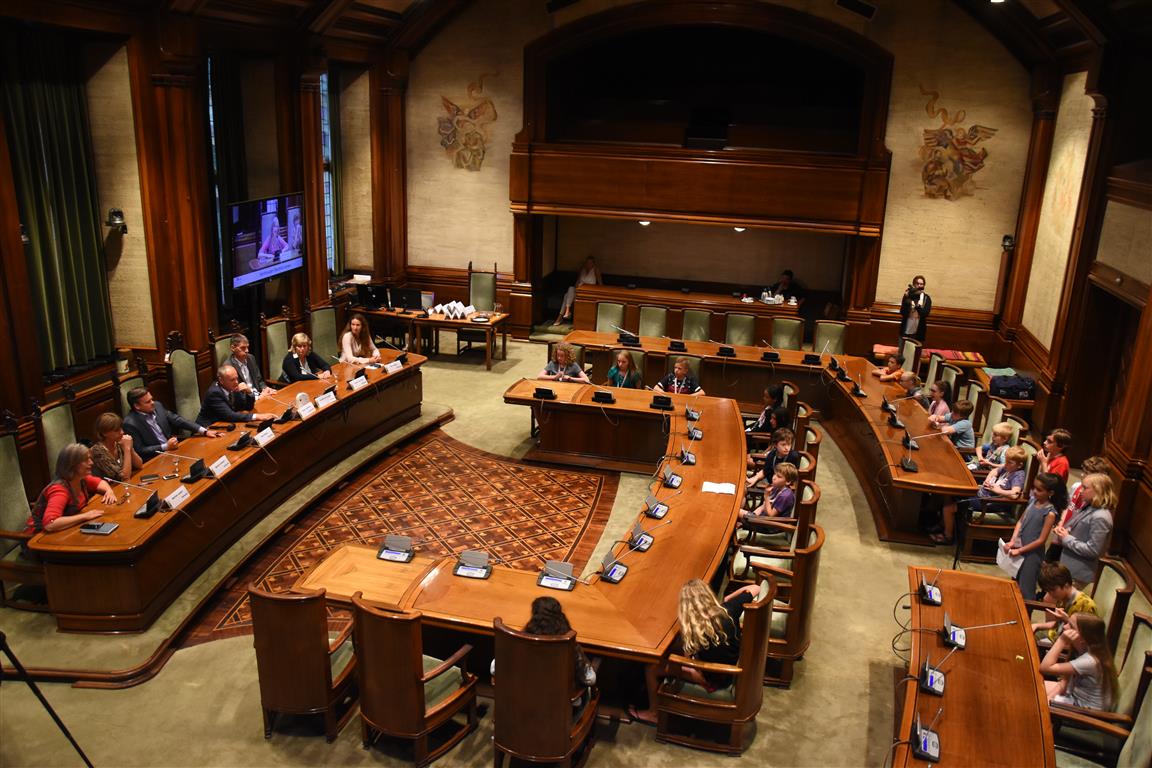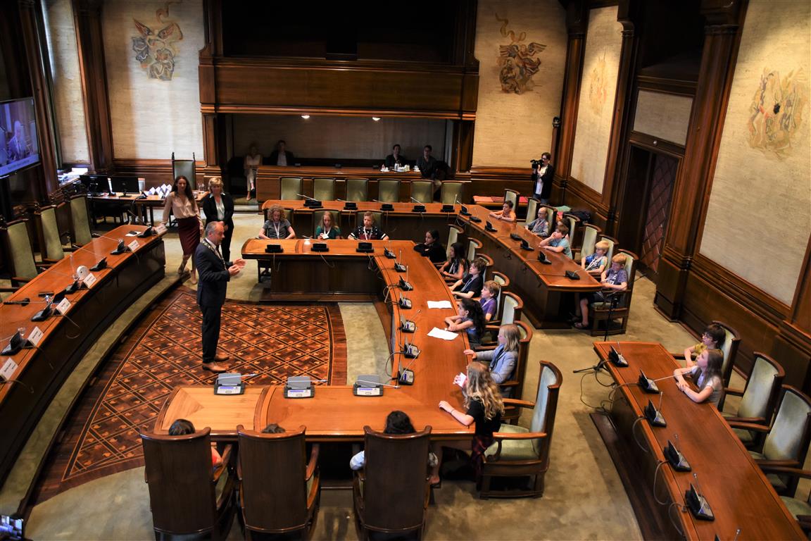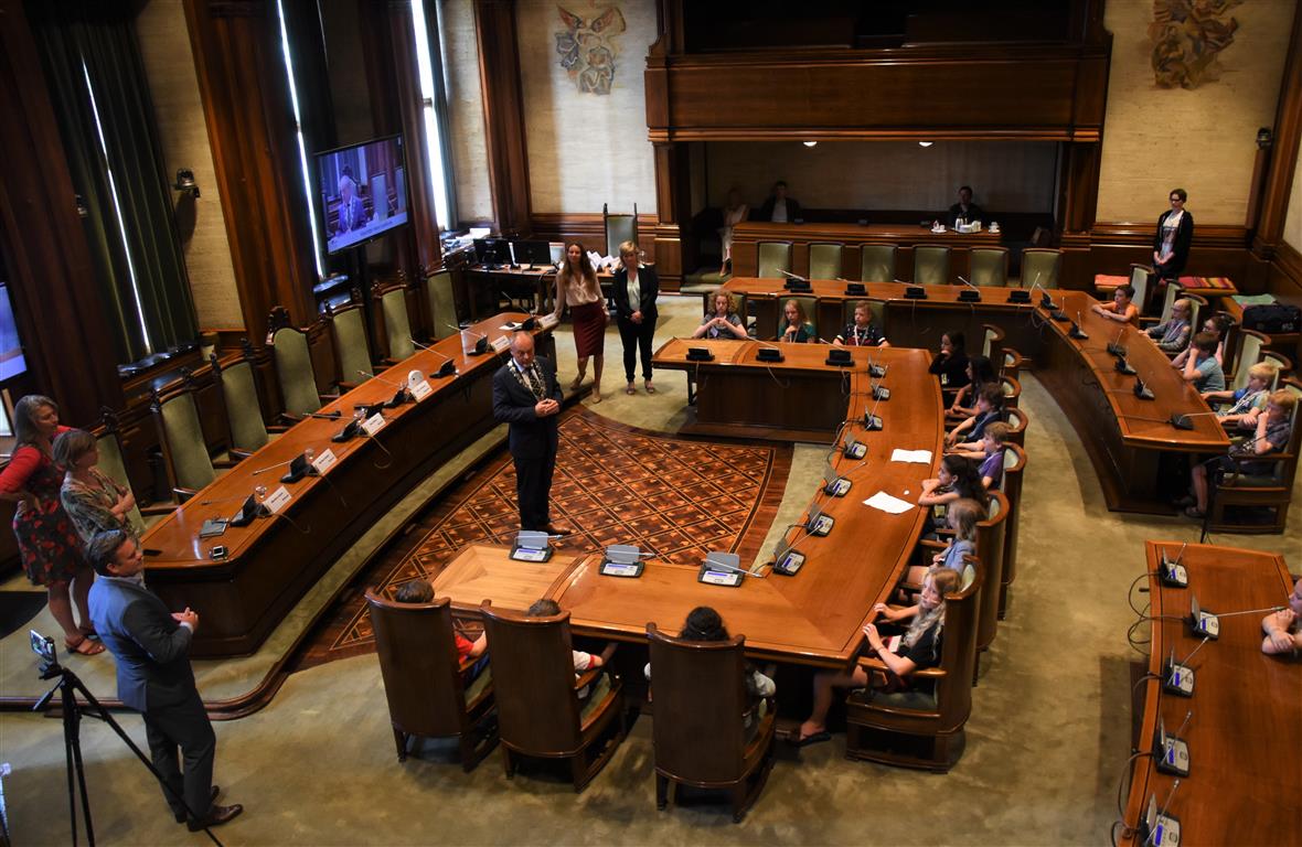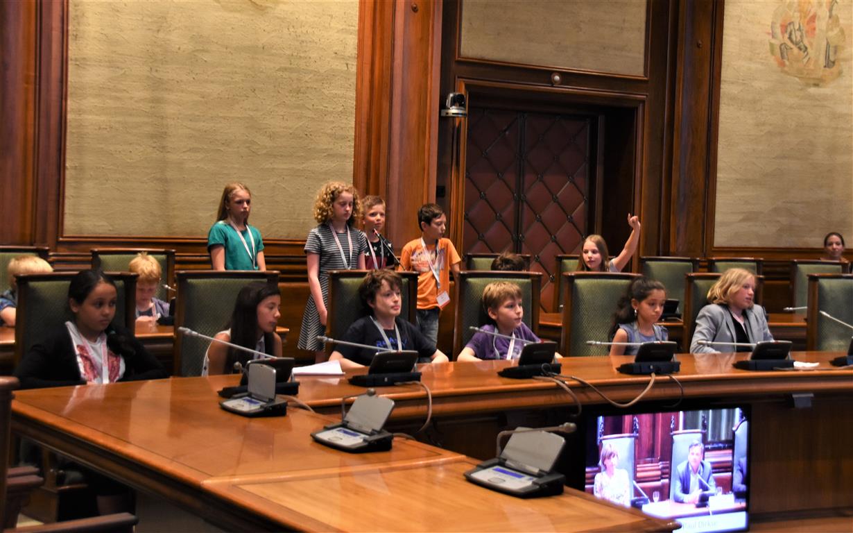 De leerlingen van klas 7b van de Lucas van Leyden school maakten gisteren hun opwachting in de Raadzaal van het Leidse stadhuis. Daar mochten ze een uur lang vragen stellen aan de burgemeester en de vijf wethouders. Die vragen hadden ze in groepjes voorbereid in de klas en gingen over de plannen die de collegepartijen hebben opgeschreven in hun beleidsakkoord. Na afloop van de kinderpersconferentie mochten de hele klas op de foto met het college.