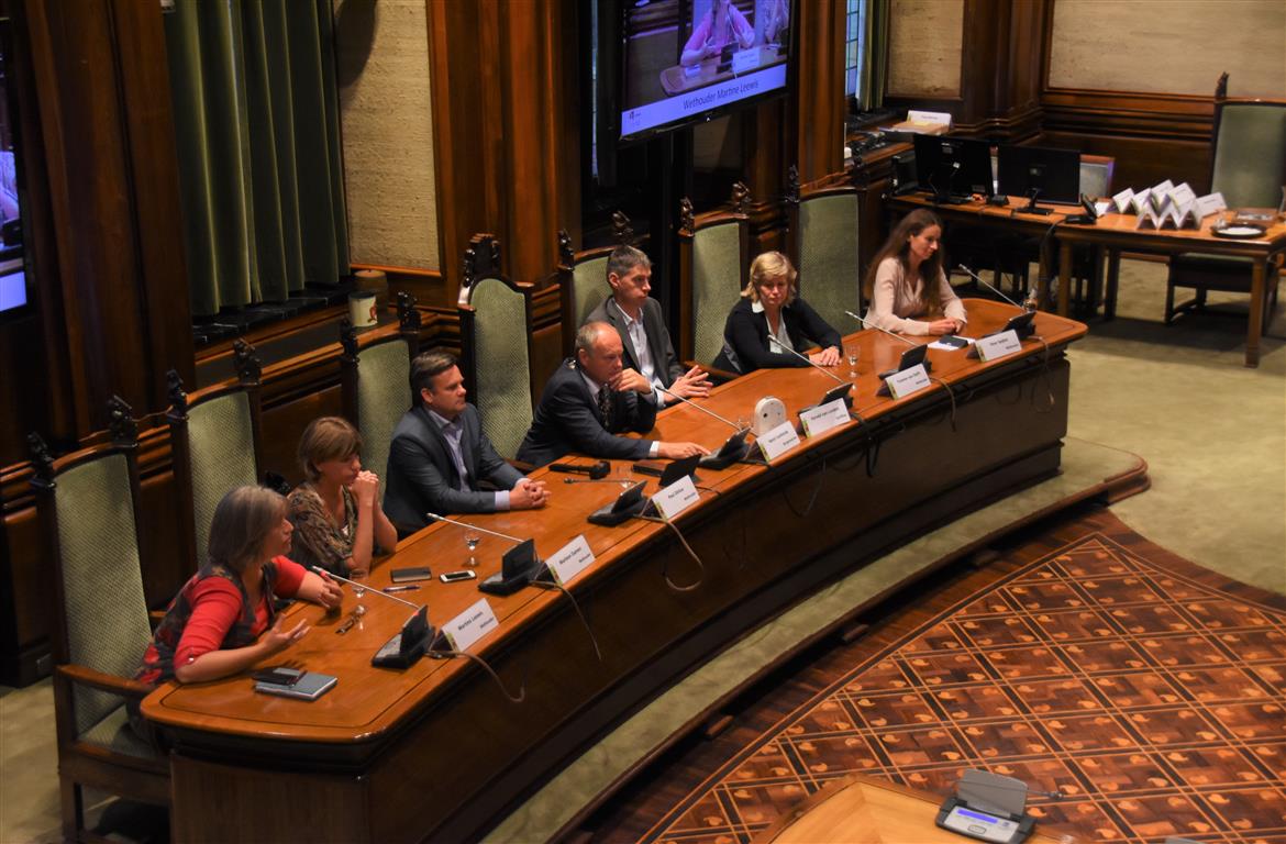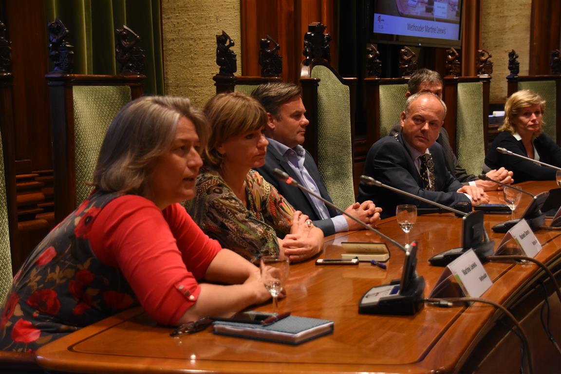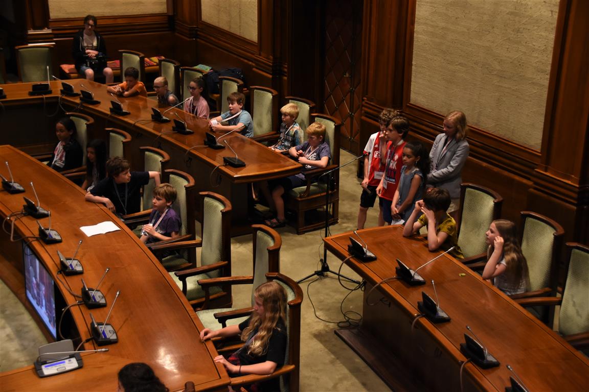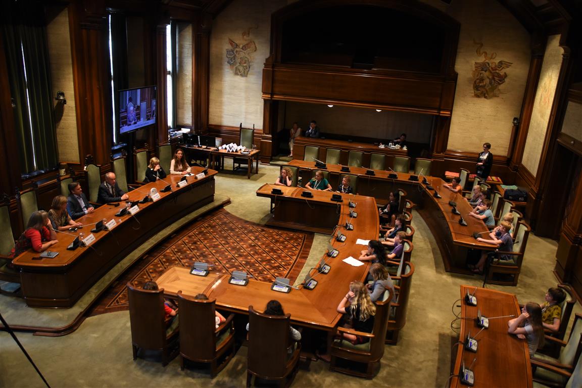 De leerlingen van klas 7b van de Lucas van Leyden school maakten gisteren hun opwachting in de Raadzaal van het Leidse stadhuis. Daar mochten ze een uur lang vragen stellen aan de burgemeester en de vijf wethouders. Die vragen hadden ze in groepjes voorbereid in de klas en gingen over de plannen die de collegepartijen hebben opgeschreven in hun beleidsakkoord. Na afloop van de kinderpersconferentie mochten de hele klas op de foto met het college.