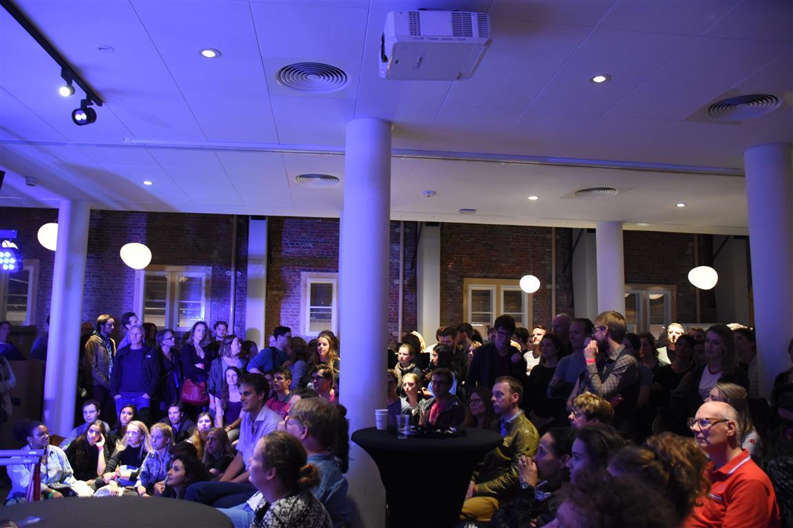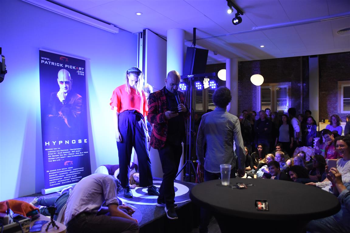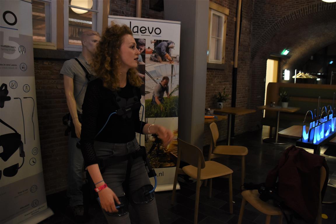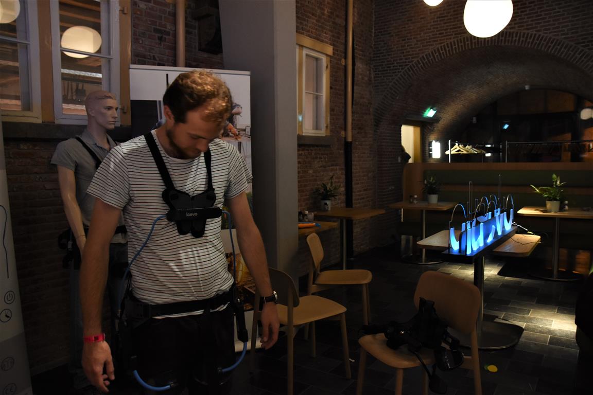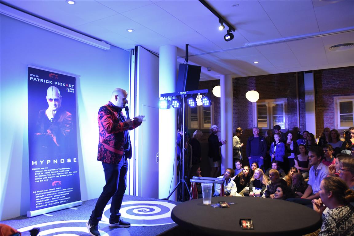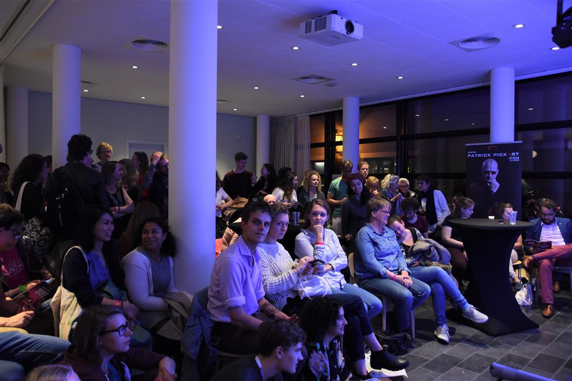 Lang geleden hebben we de hoop opgegeven bij festivals het tijdschema te kunnen volgen. Altijd overkomt je wel íets. In het blokkenschema kun je wel wat ‘ankerpunten’ vinden. Hypnotiseur Patrick Pickart in Museum Boerhaave zagen we wel; nét aan, want het was druk met lange mensen. ‘Mind over body’, zoiets , want “als je vooraf al denkt dat iets niet gaat lukken, dan lukt het ook niet. En andersom….” Hij liet het zien met publiek: dan kun je dingen doen die niet kunnen. Maar om dan nog even aan te wippen bij ‘Aan tafel met Frankenstein’, waar met Kim Holland werd gesproken over high tech seks(speeltjes), bleek nóg lastiger vanwege de drukte. Wél zagen we in Boerhaave het exoskelet uitgeprobeerd worden. En dat veel mensen de autonome robot SAM voorbijliepen. Terwijl SAM al in staat is z’n eigen geld te verdienen. Maar misschien dat dát verhaal onderbelicht bleef.