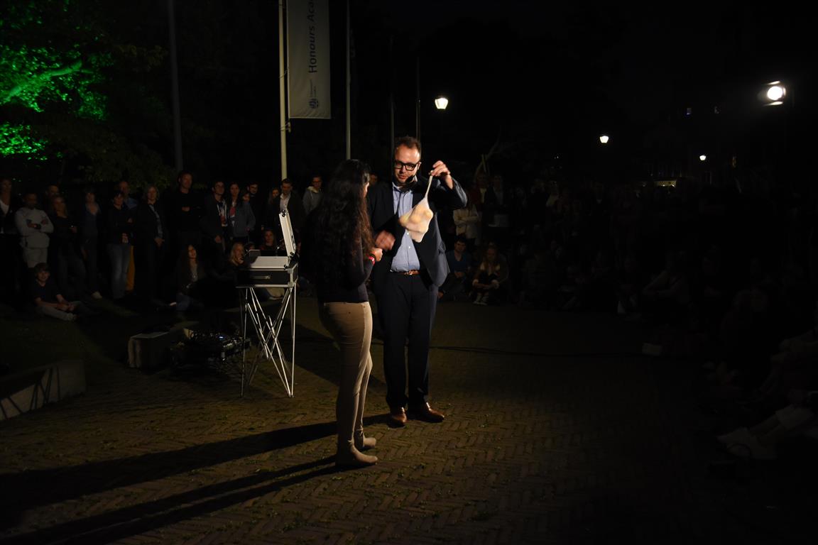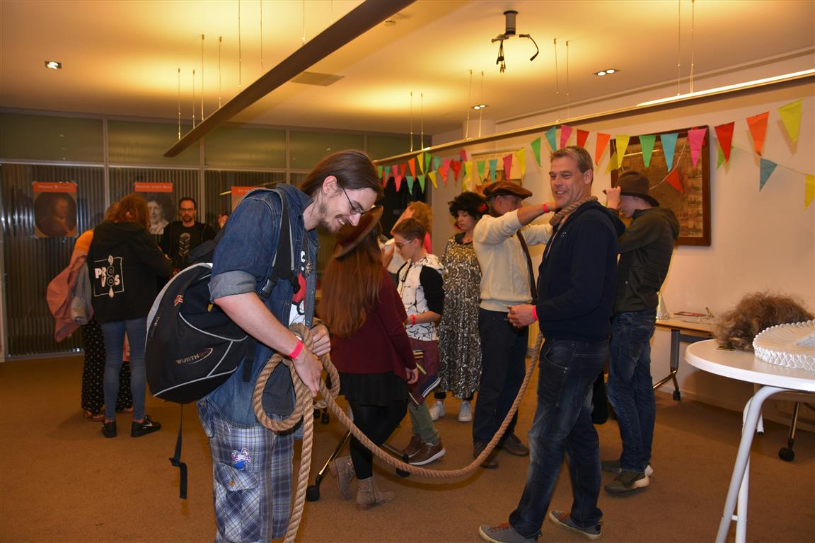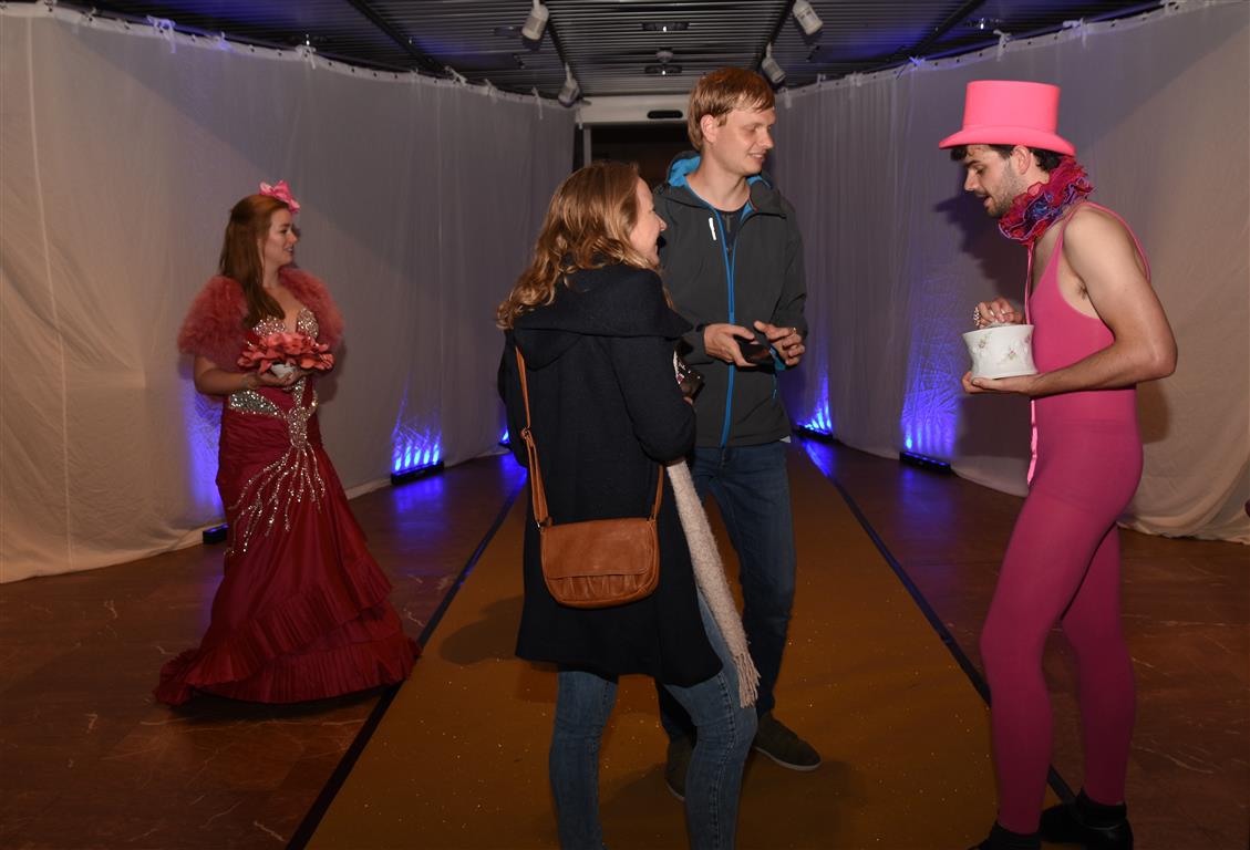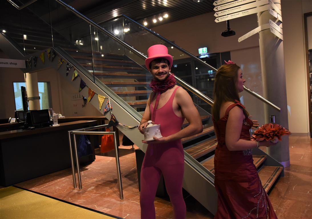 Het zijn misschien juist de kleine, onverwachte ontmoetingen die de Museumnacht aantrekkelijk maken. De ‘verkleedcabine’ van Cabinet of Curiosities bijvoorbeeld, waar je verkleed op de foto kon “Een vrouwendingetje? Nee, dat zie je verkeerd. Ook mannen doen mee, hoor”. Het had wel iets van de jaren twintig, dertig van de vorige eeuw, daar op straat voor het Museum van Oudheden. Of, in de Hortus, het Piepklein Mega Museum van Catoo Lustig, met een voorstelling over “onzekerheid en identiteit” zoals één van haar collega’s dat omschreef. Hij overreedde ons te komen kijken – slechts enkele plaatsen per voorstelling, want piepklein ís ook piepklein – waarna we verstrikt raakten in gesprekken, de tijd uit het oog verloren en de voorstelling misten.