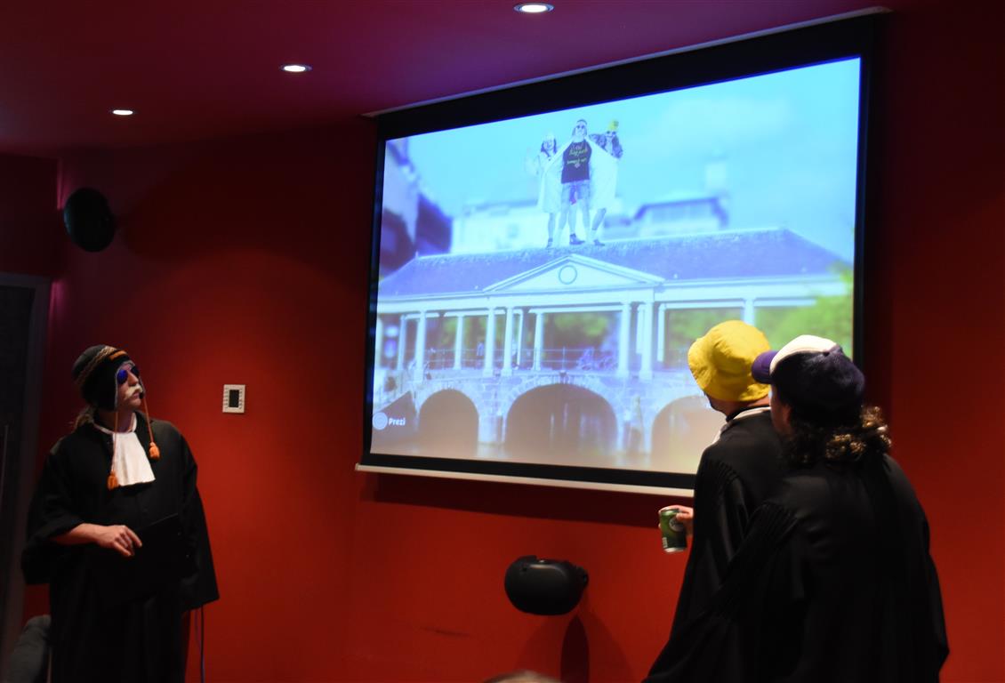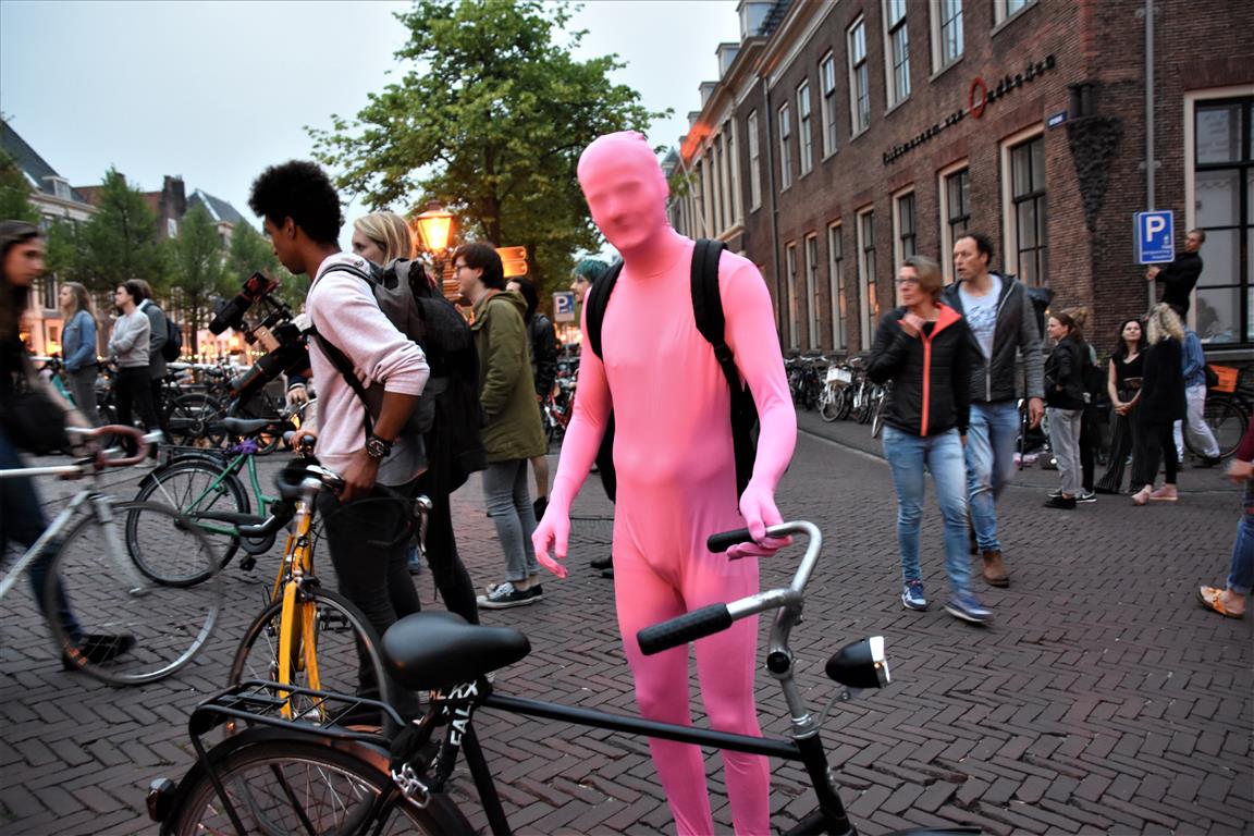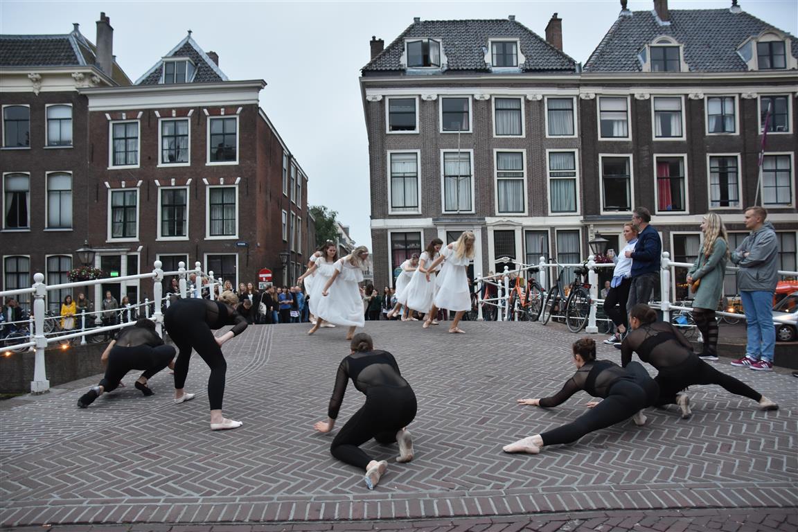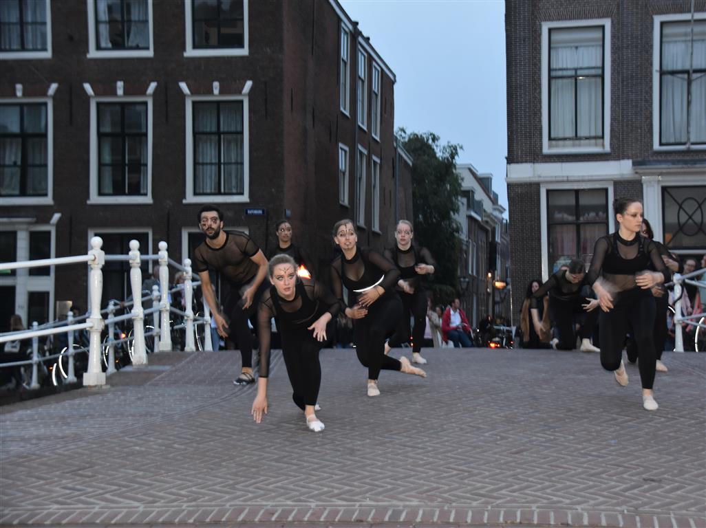 Onze avond begon op het Rapenburg, waar vlak voor 20.00 uur al vrij veel mensen voor de diverse musea stonden te wachten. Op de Doelenbrug warmen de danseressen en danser van Tribes zich op, worstelt de techniek op het laatste moment met een kaduuk draadje en “er liggen hier allemaal kleine stukjes glas”! Het kwam op tijd goed. Ze zetten het verkeer op het Rapenburg stil, maar het publiek was content.
