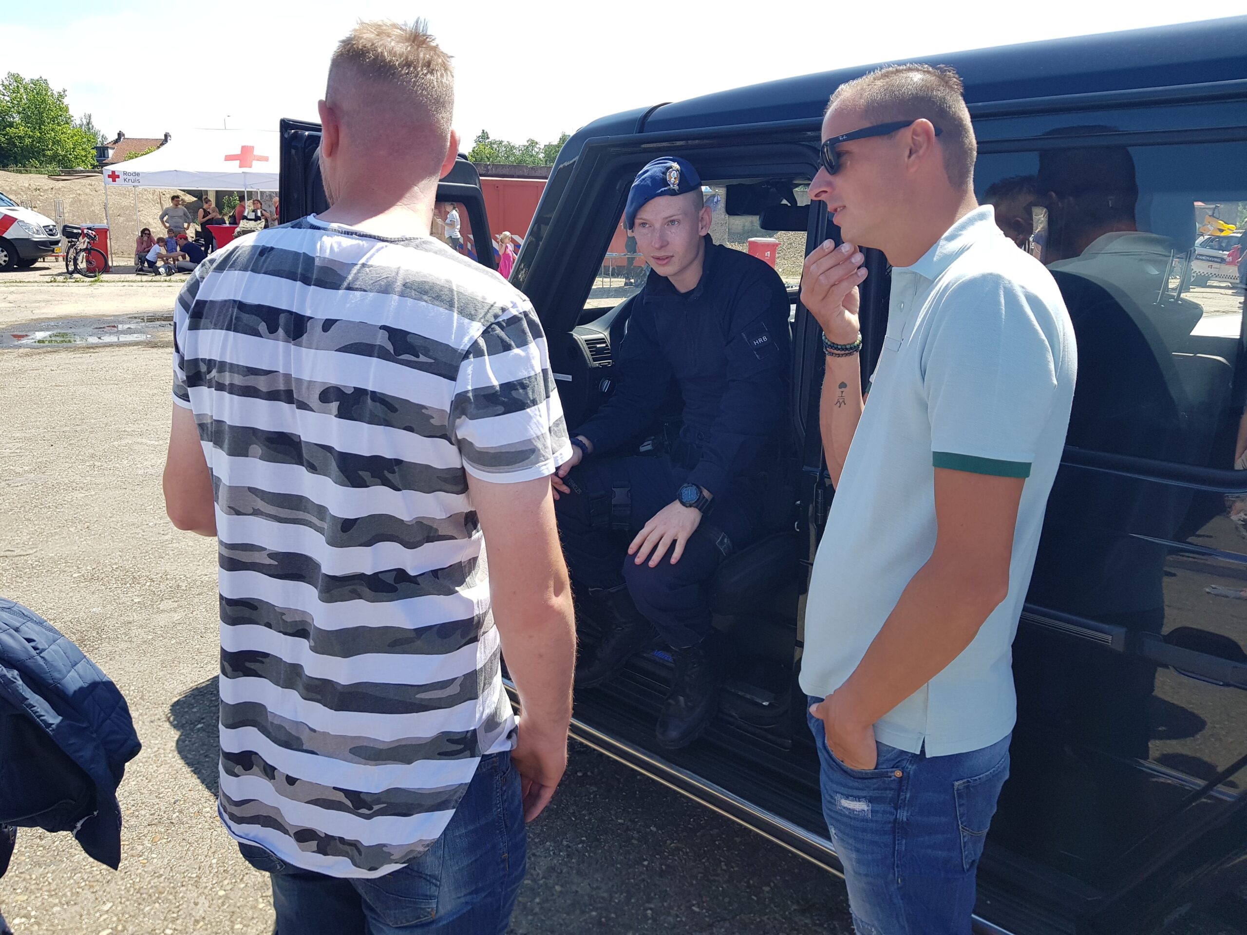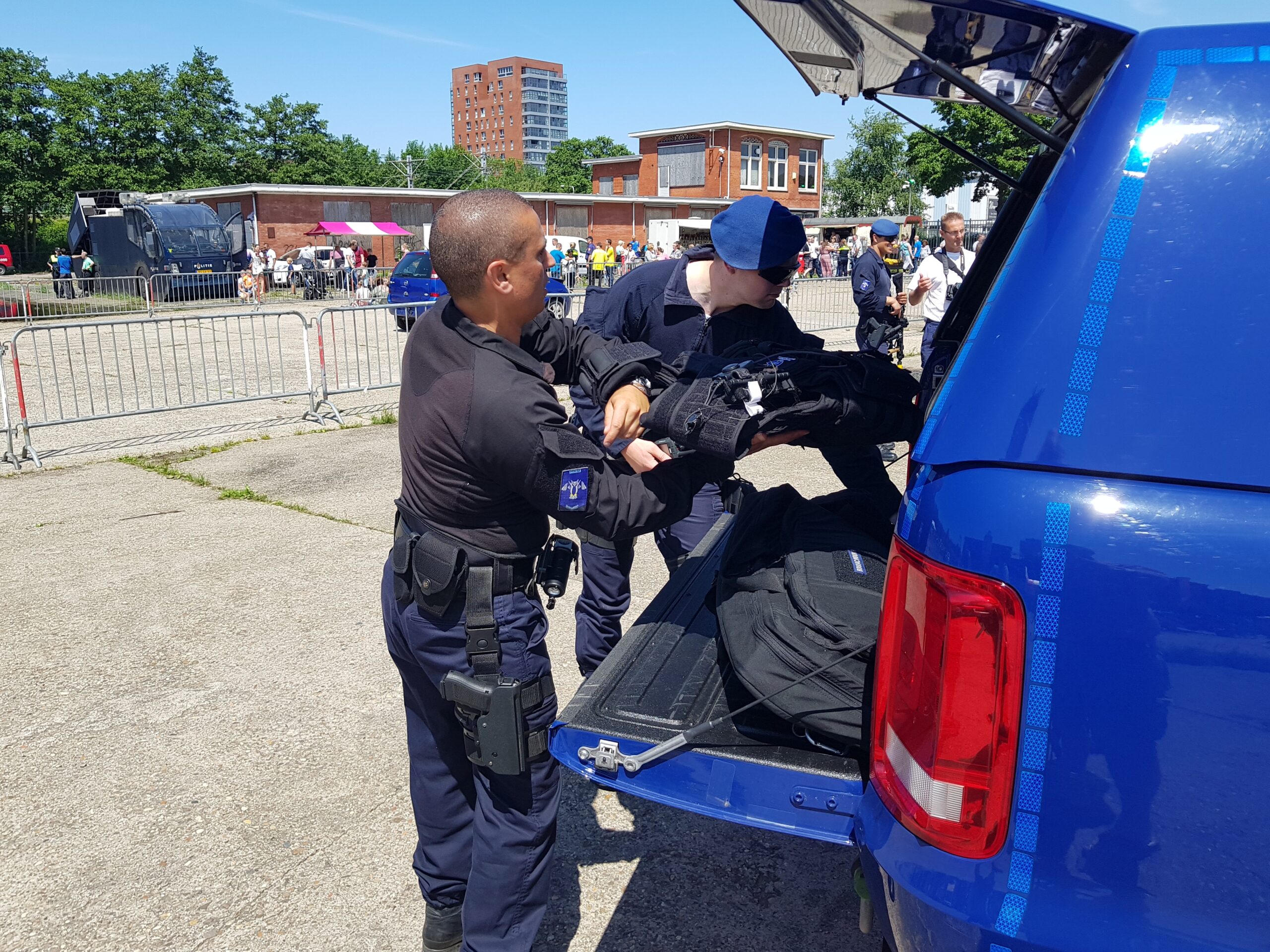 Ronduit spectaculair was het om de politiehonden in actie te zien die in verschillende situaties een ‘boef’ onder controle moesten krijgen. Onder andere door via een net door een agent ingeslagen autoruit de auto in de klimmen.