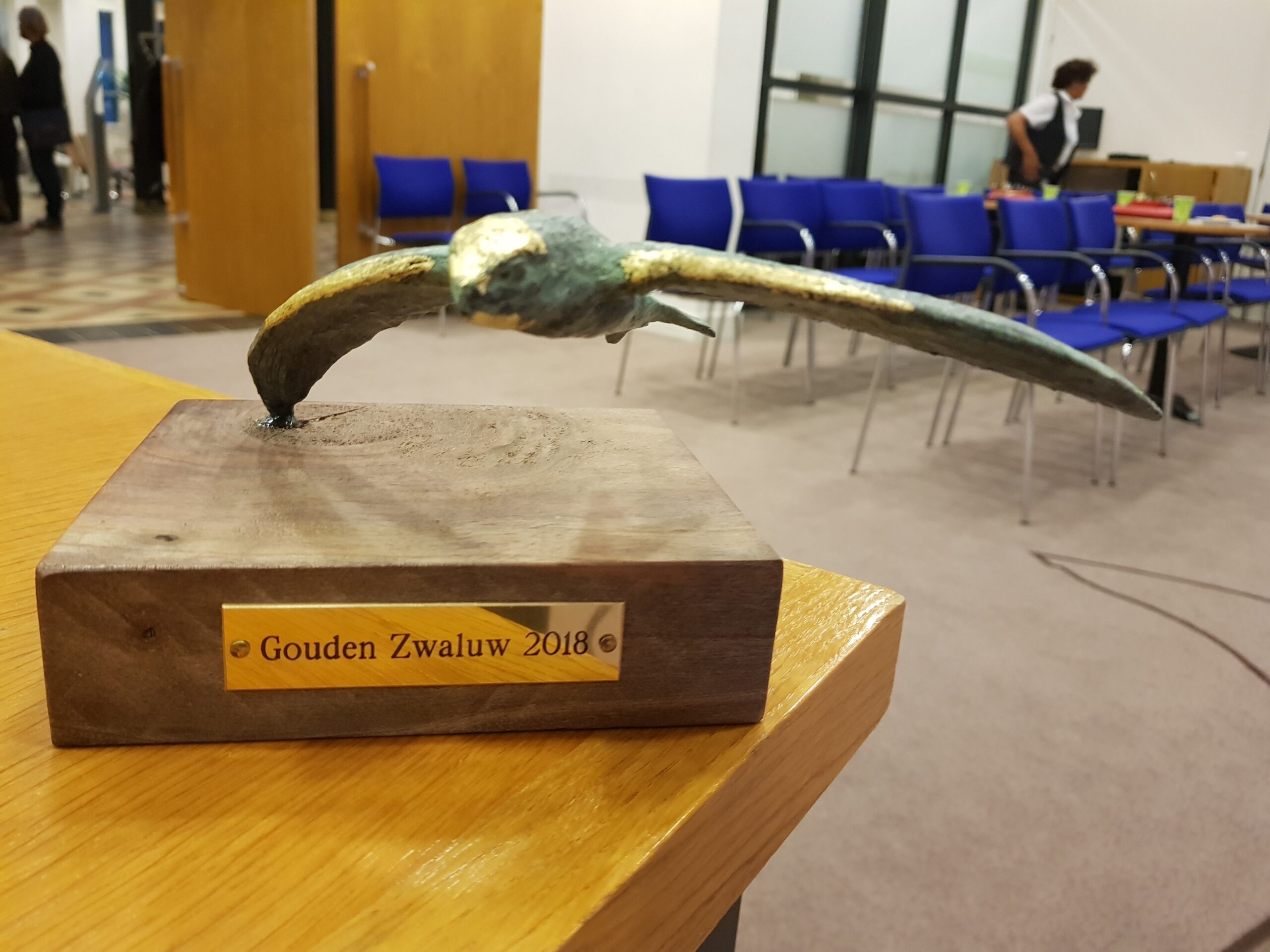 Chris de Waard in gesprek met wethouder Roeffen over het winnen van de Gouden Zwaluw.