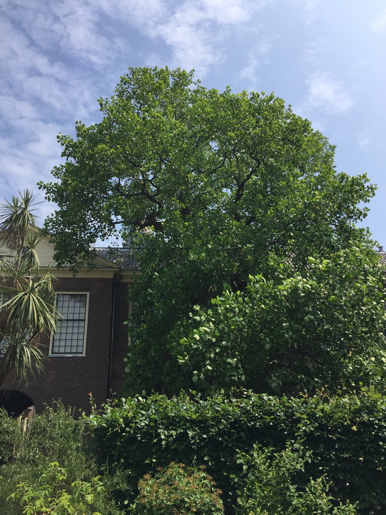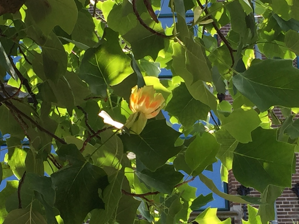 Maar zoals door Boerhaave zelf gezged de grond rondom het huis was belangrijker. En ook hier plantte hij een tulpenboom die in 1954 werd geveld. Inmiddels staan er twee scheuten van de derde generatie. De twee tulpenbomen in het park van Oud-Poelgeest hebben wat meer lucht en licht gekregen door een aantal omringende bomen te verwijderen. Mocht de boom in bloei staan dan is het moeilijk de bloemen te zien. Maar de specifieke vorm van de bladeren is goed te herkennen. In de Hortus Botanicus staat ook een tulpenboom uit de nalatenschap van Boerhaave. Daar zijn de tulpvormige bloemen wel te zien.