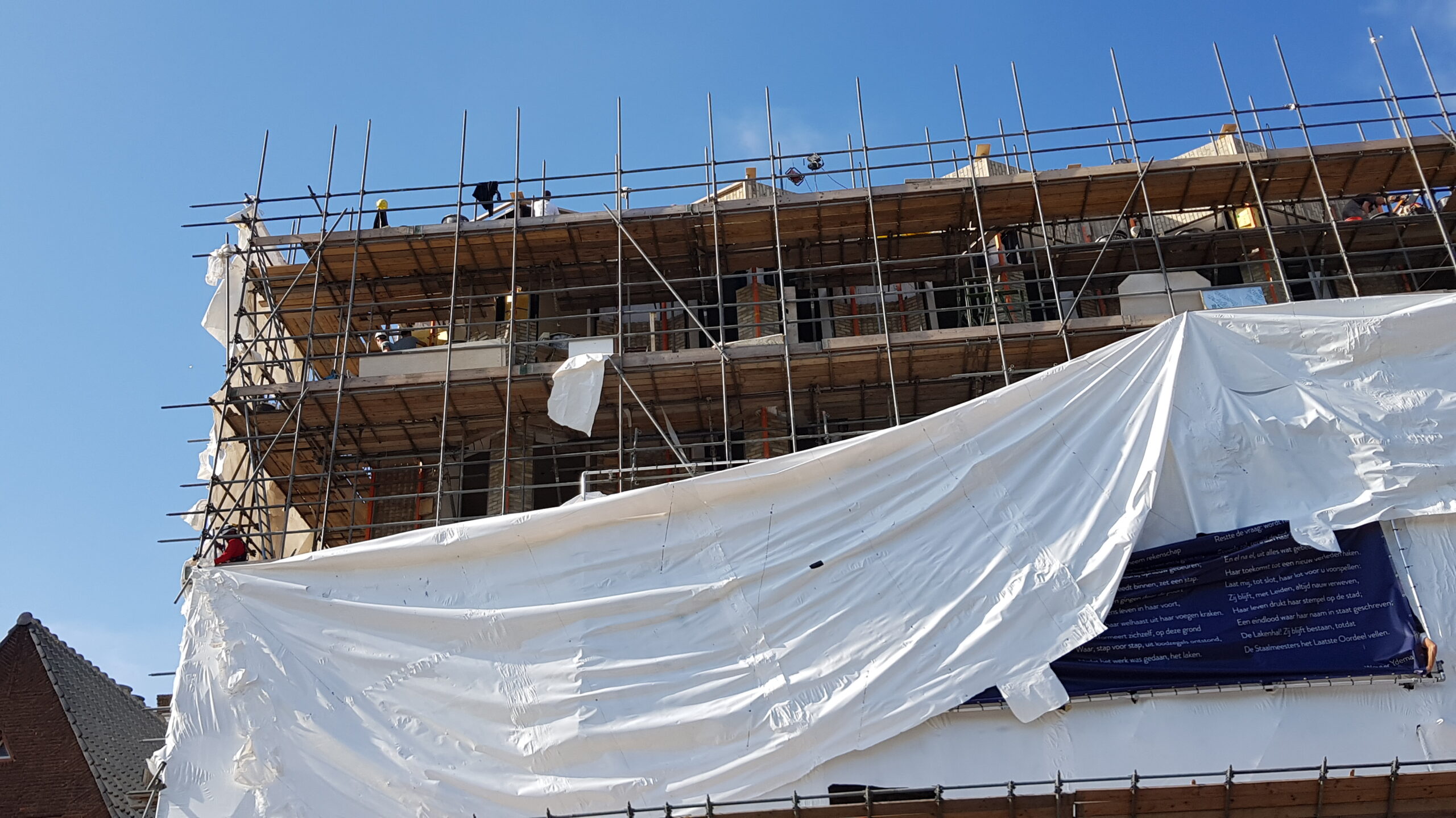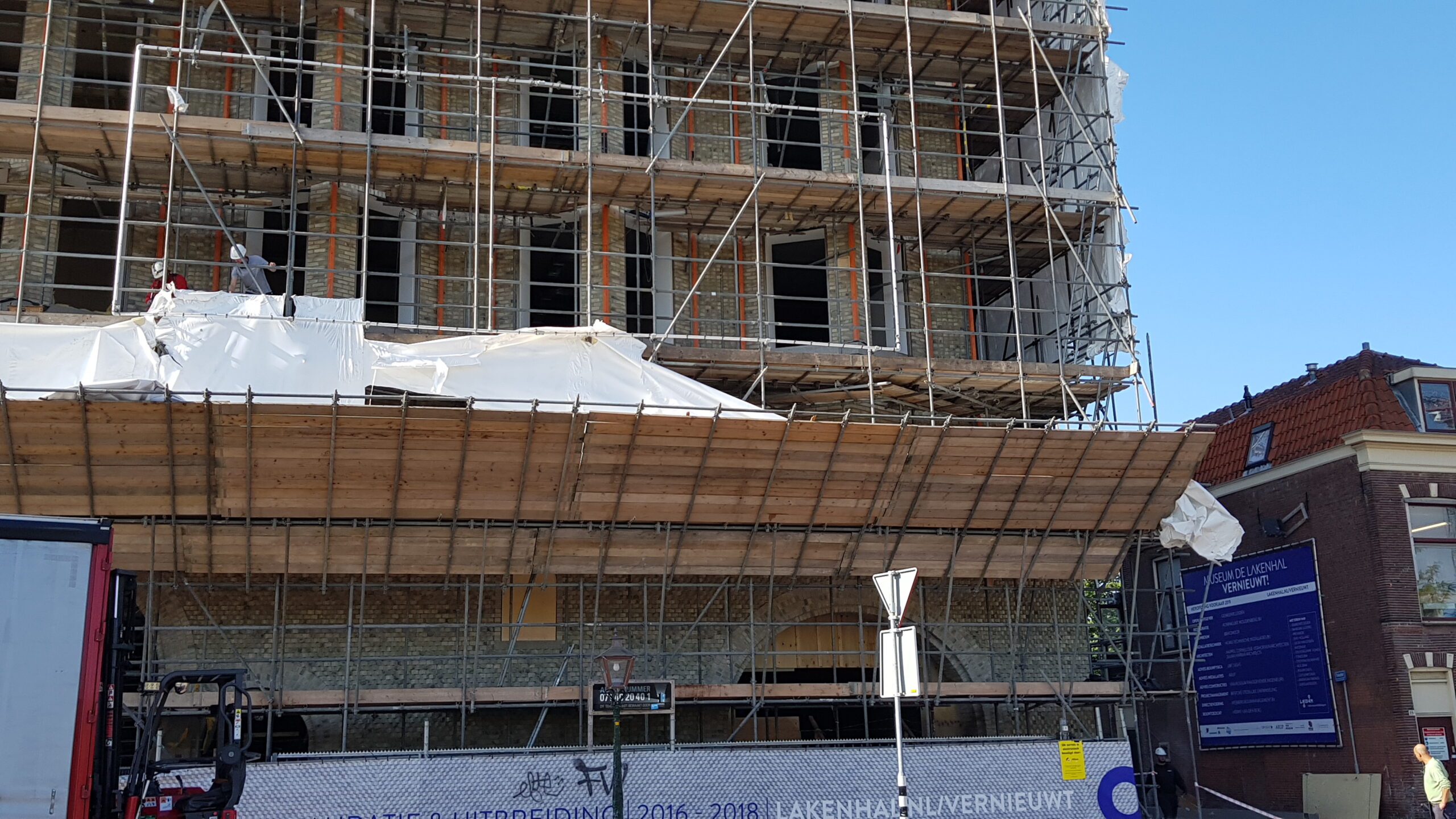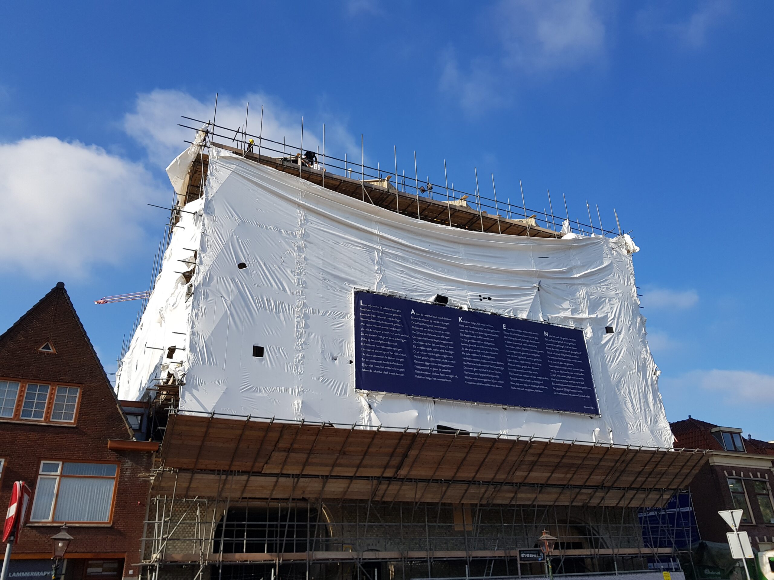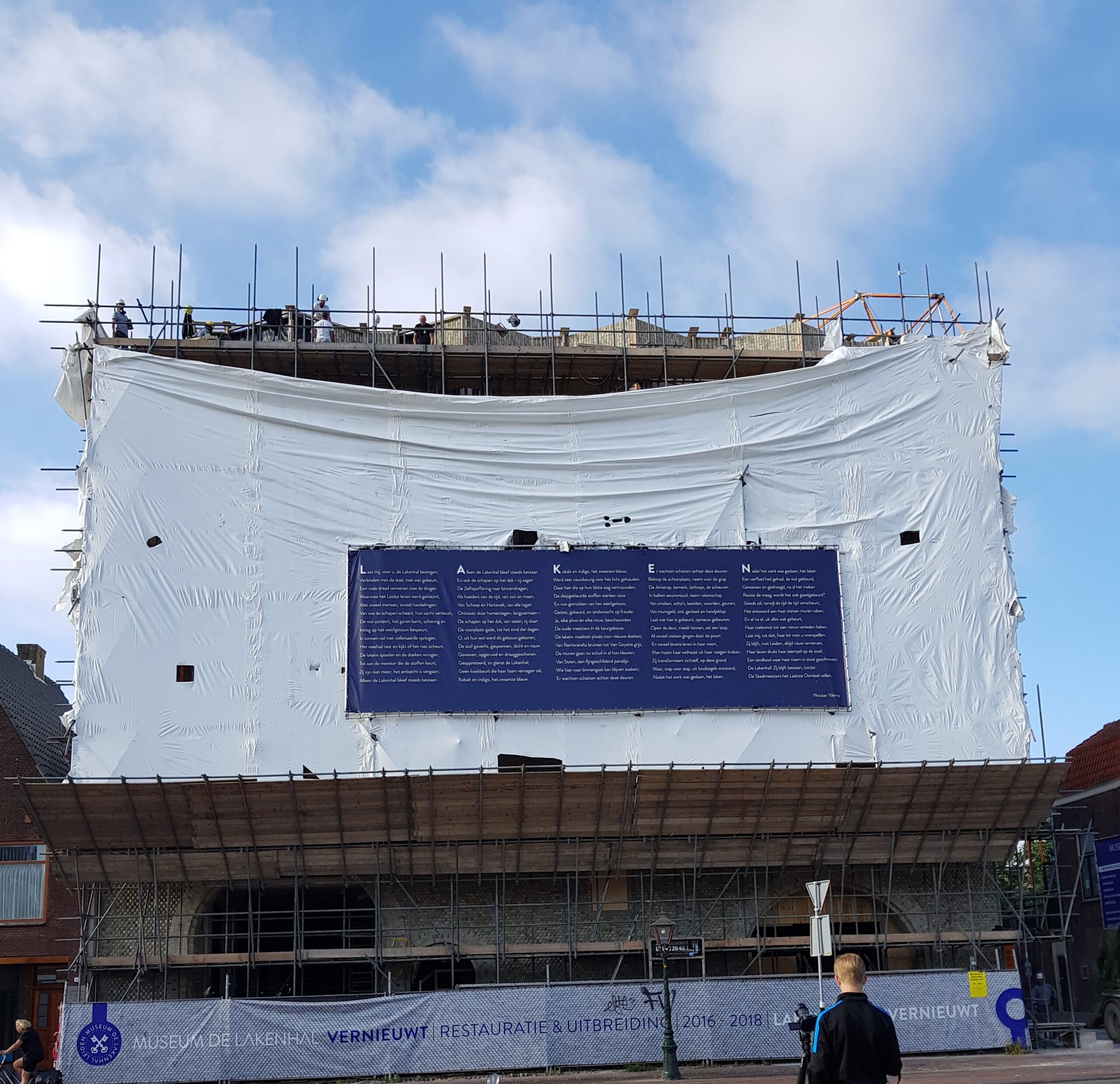 Het bouwplastic van de nieuwbouw van Museum de Lakenhal is vanmorgen verwijderd. Daardoor is de veelbesproken gevel van de uitbreiding van het museum voor het eerst zichtbaar voor het publiek.