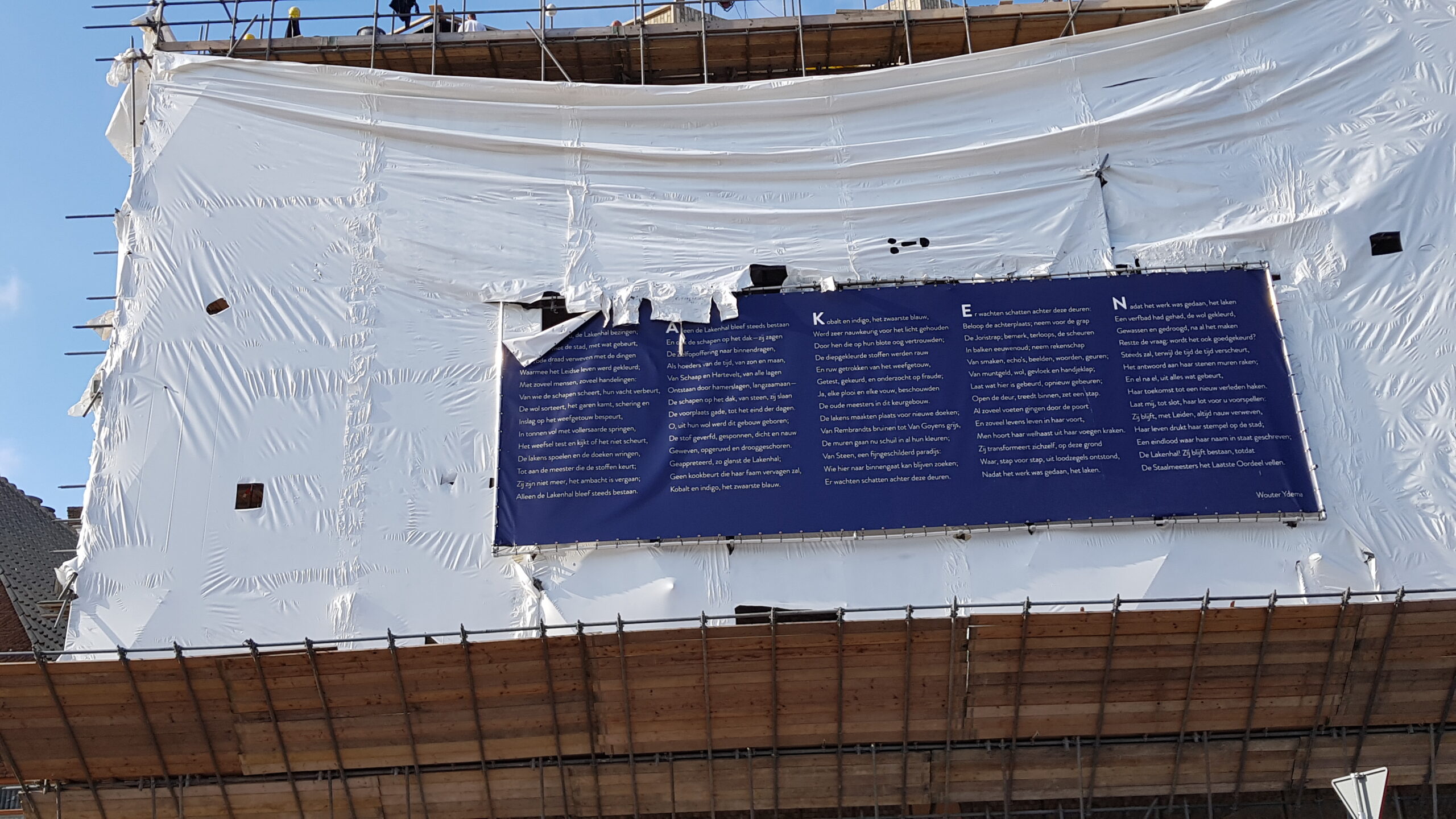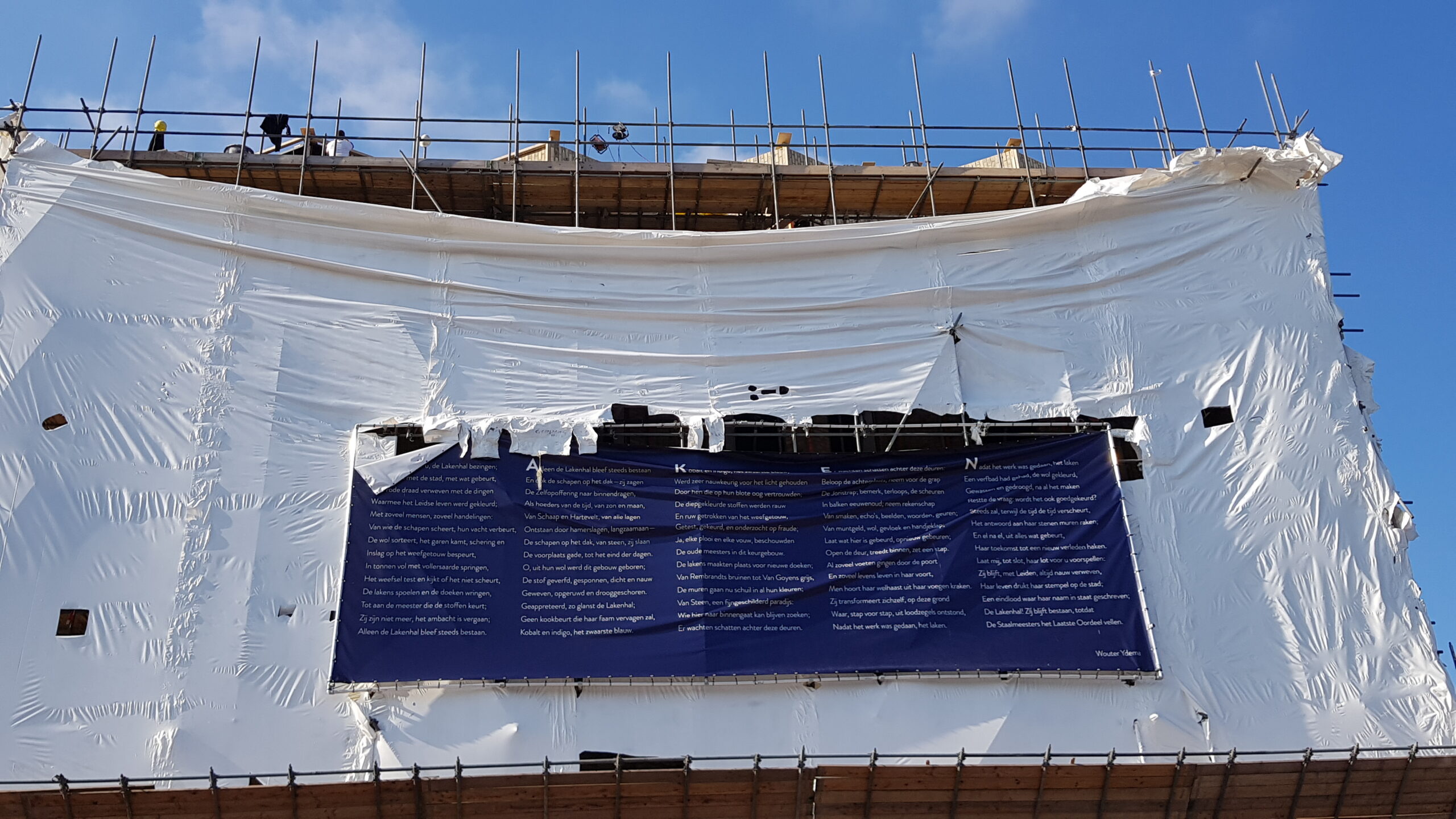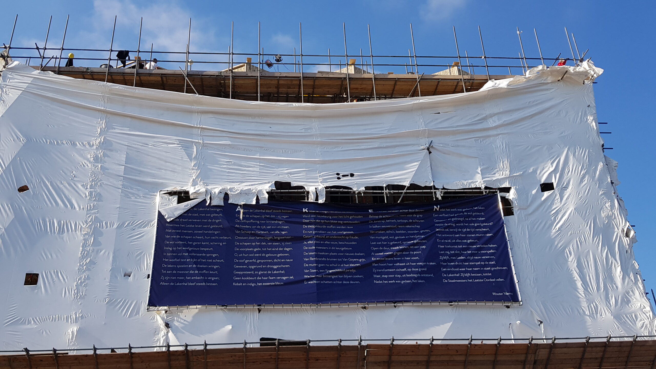 Het bouwplastic van de nieuwbouw van Museum de Lakenhal is vanmorgen verwijderd. Daardoor is de veelbesproken gevel van de uitbreiding van het museum voor het eerst zichtbaar voor het publiek.