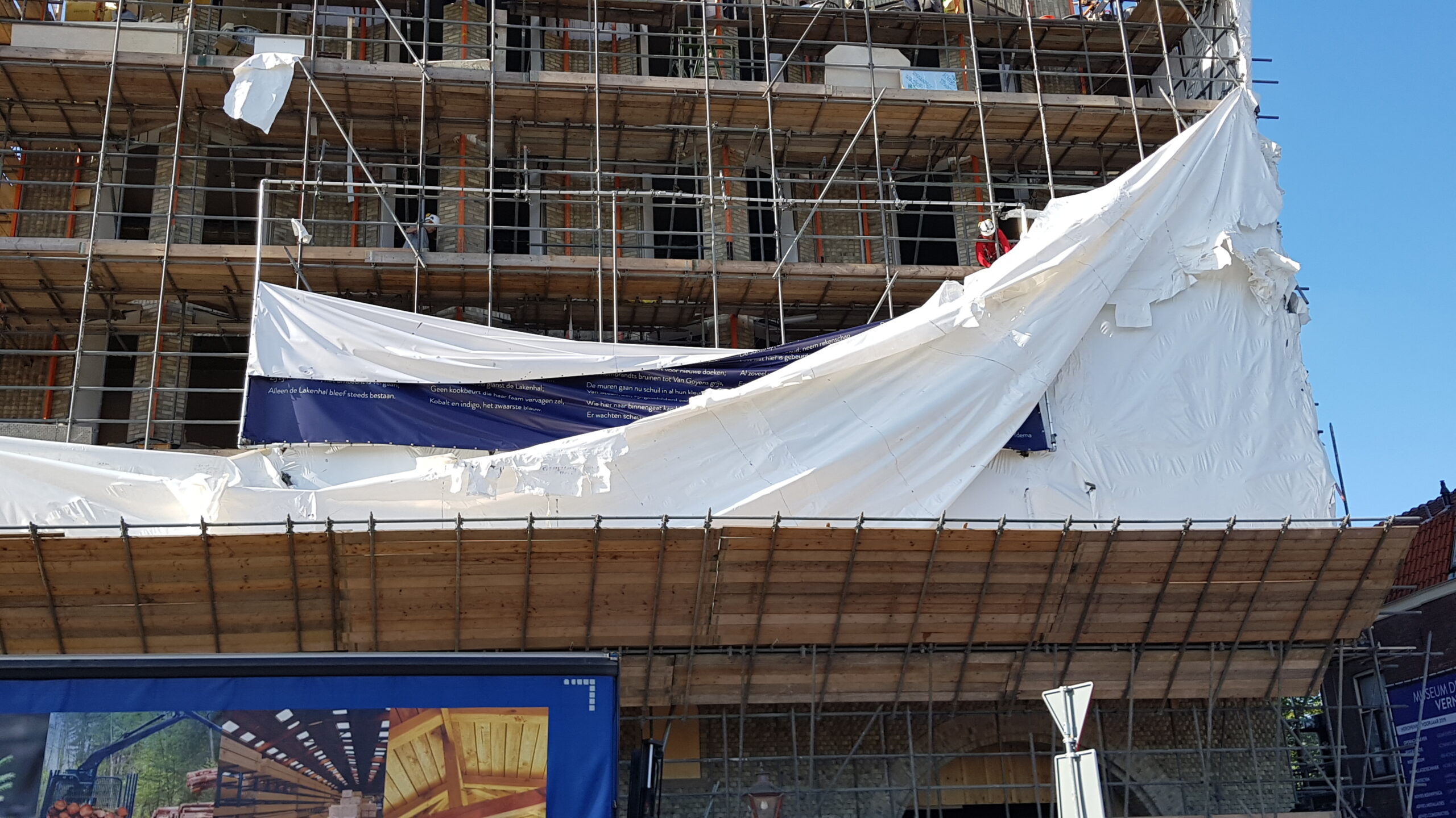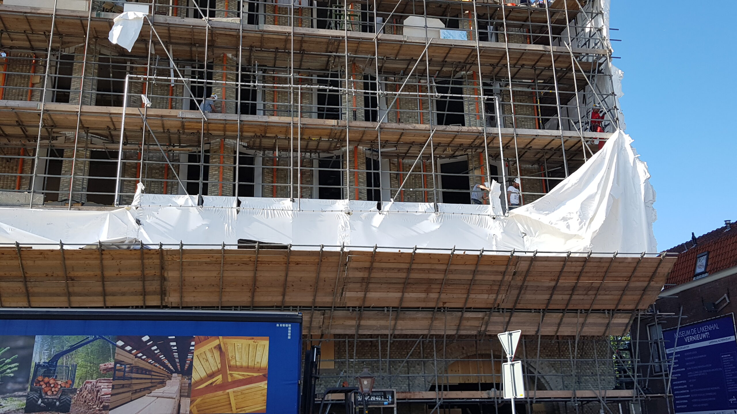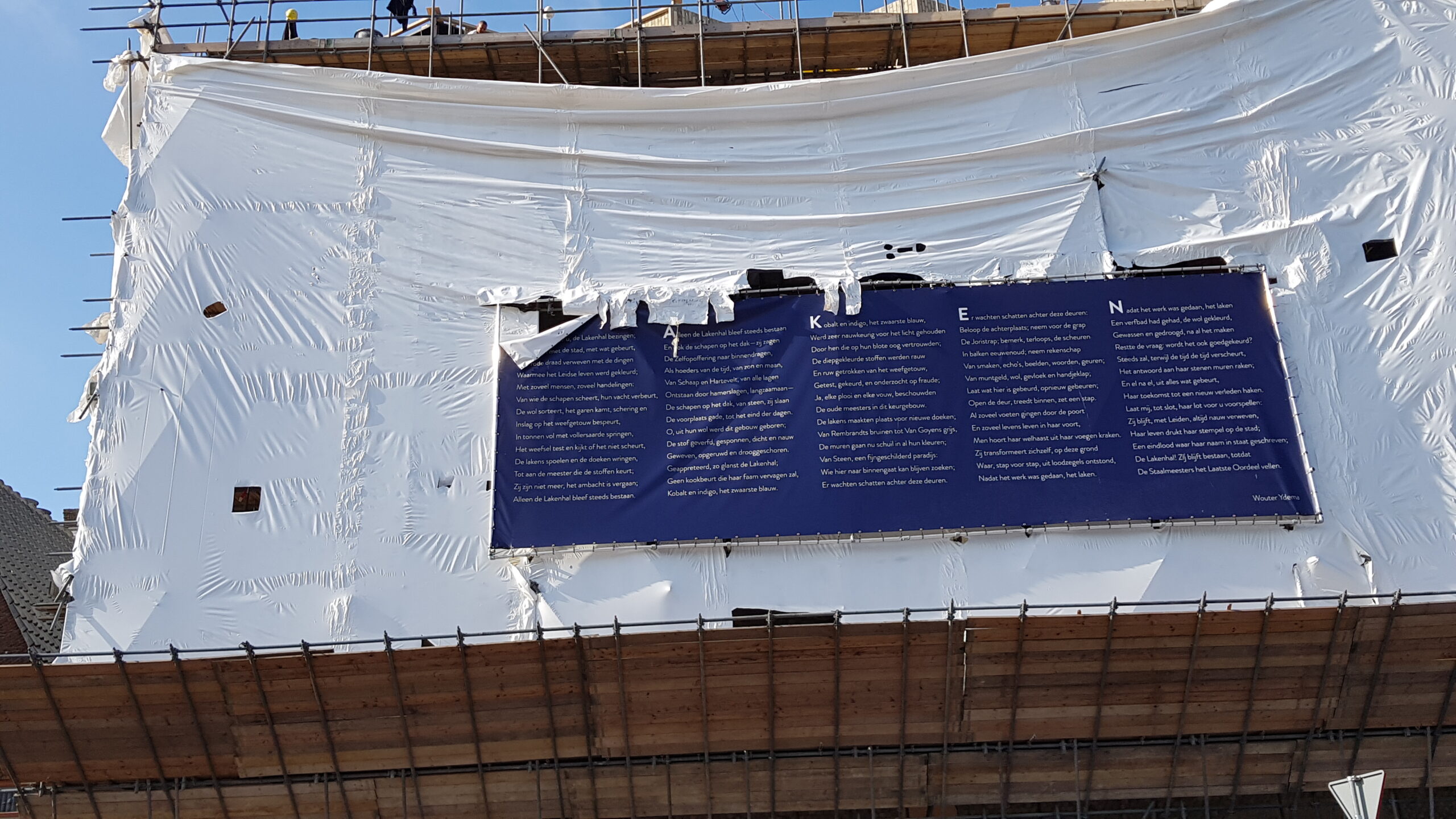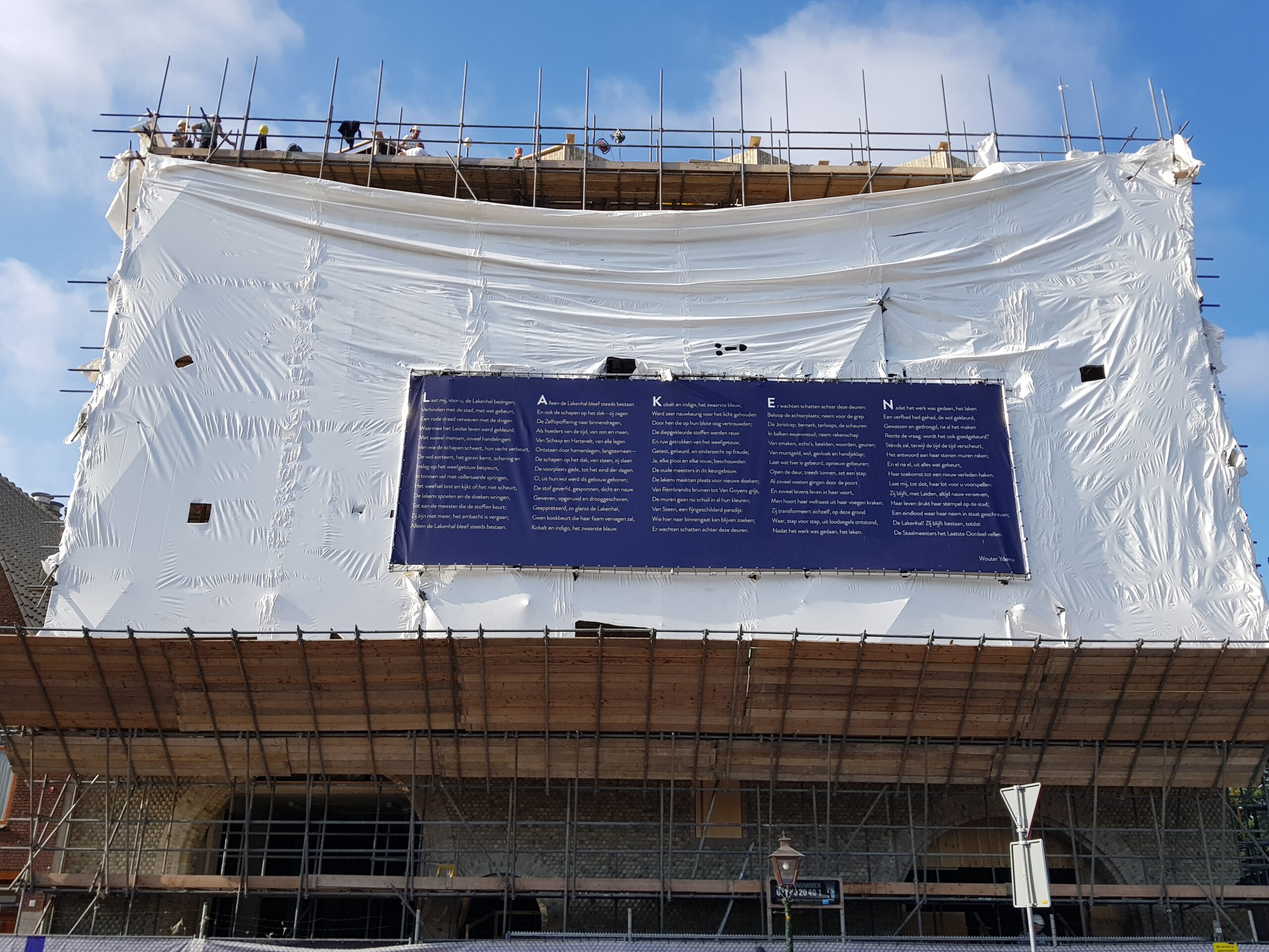 Het bouwplastic van de nieuwbouw van Museum de Lakenhal is vanmorgen verwijderd. Daardoor is de veelbesproken gevel van de uitbreiding van het museum voor het eerst zichtbaar voor het publiek.
