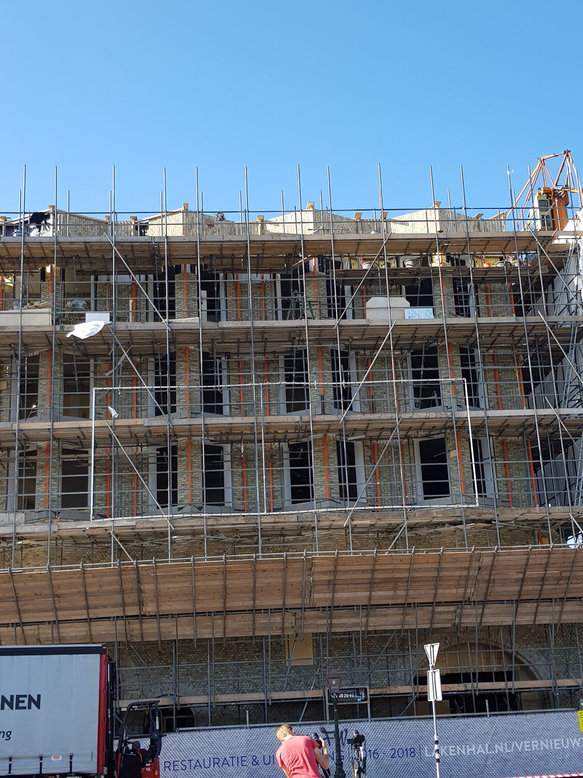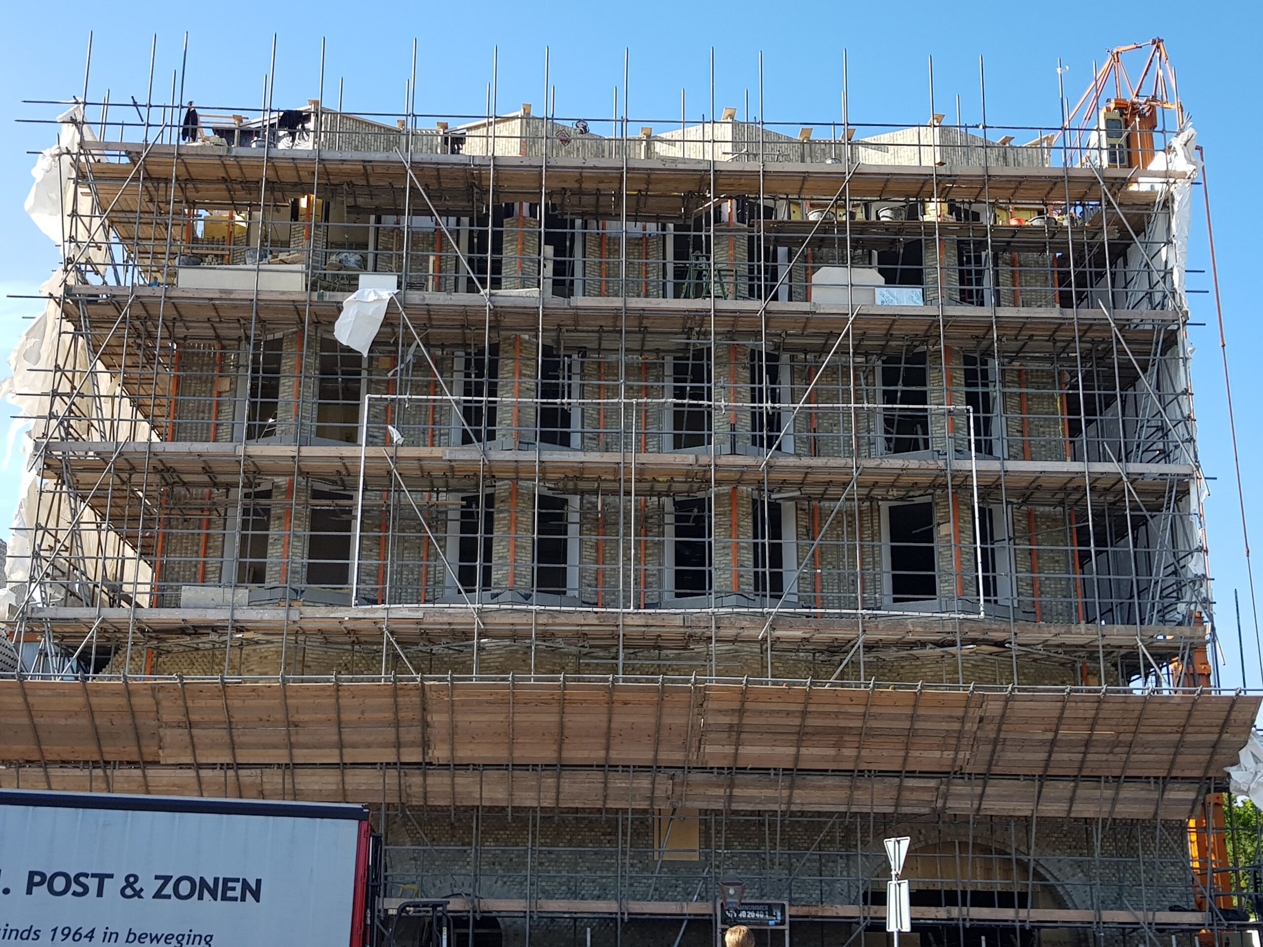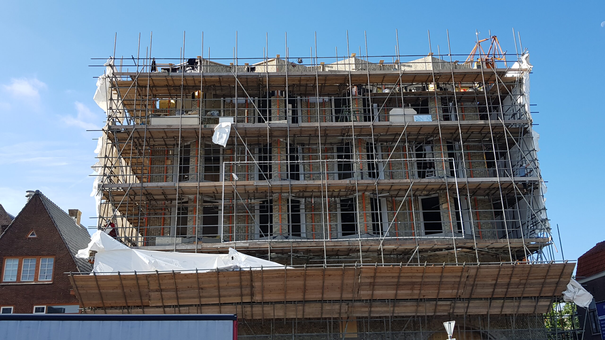 De steigers staan er nog, maar nu het bouwplastic is verdwenen, is een flink deel van de nieuwe gevel voor het eerst zichtbaar.