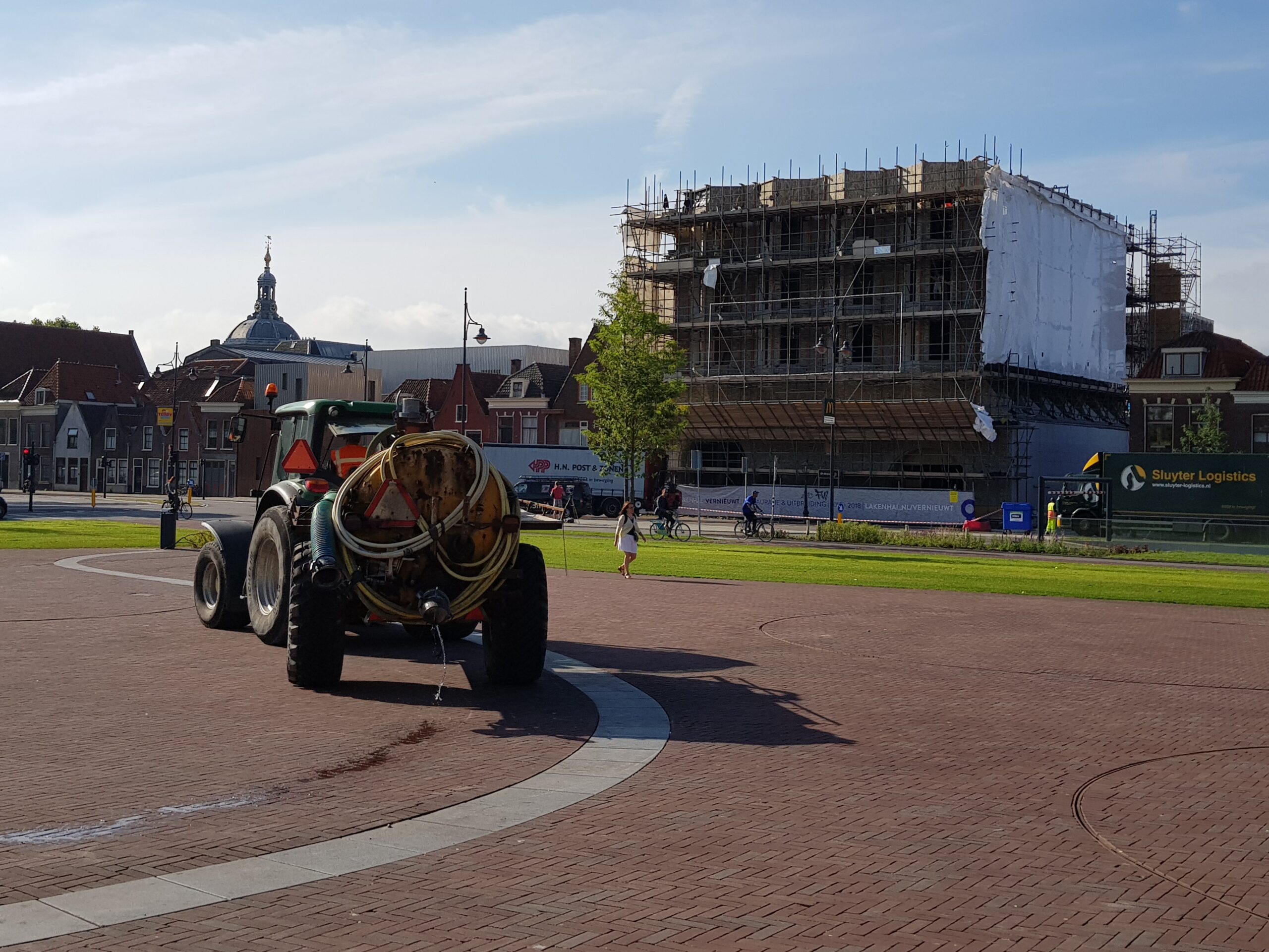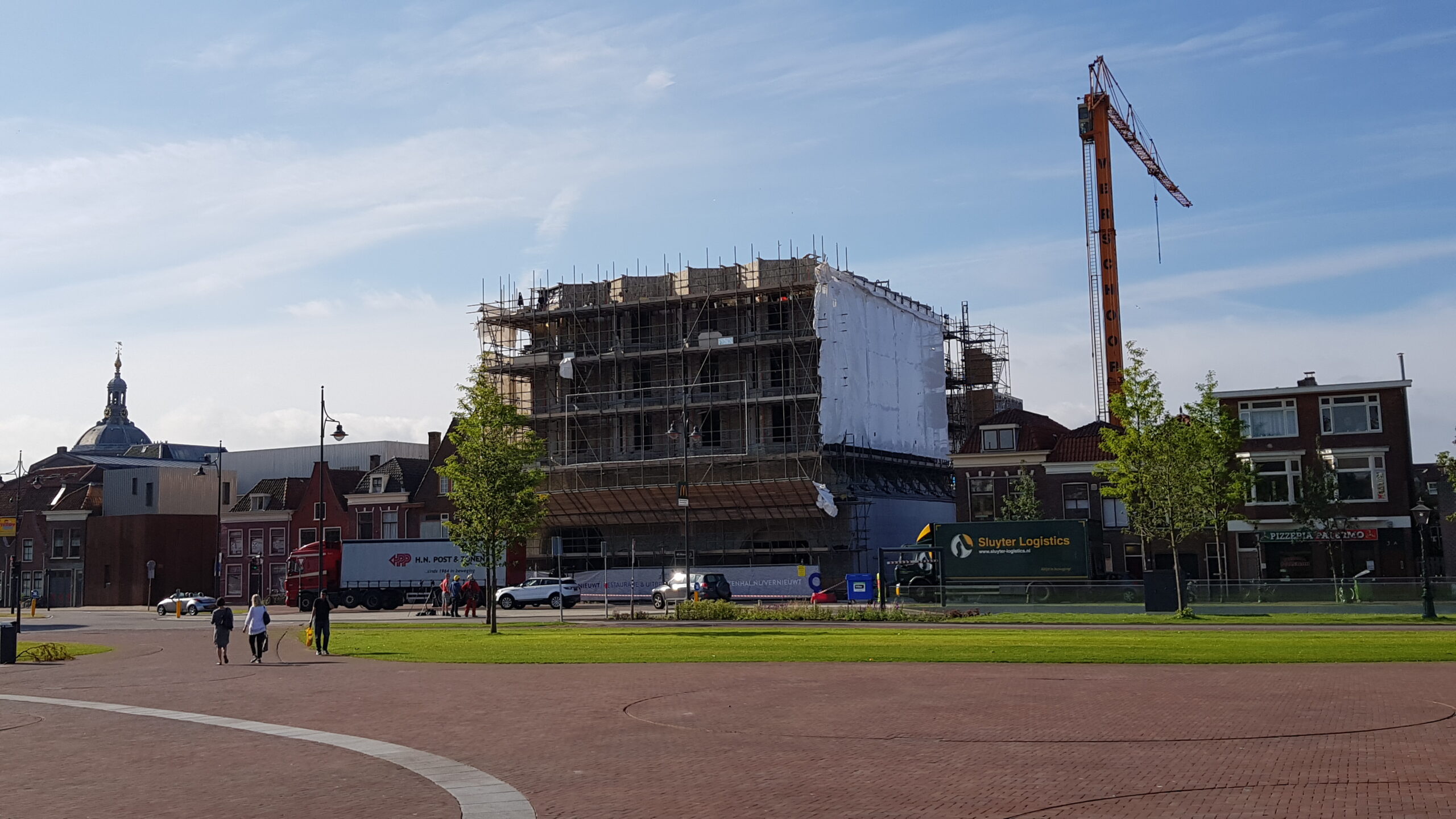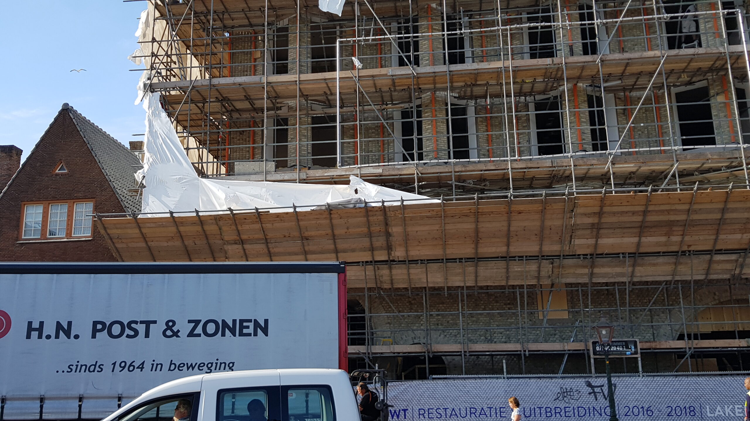 De steigers staan er nog, maar nu het bouwplastic is verdwenen, is een flink deel van de nieuwe gevel voor het eerst zichtbaar.