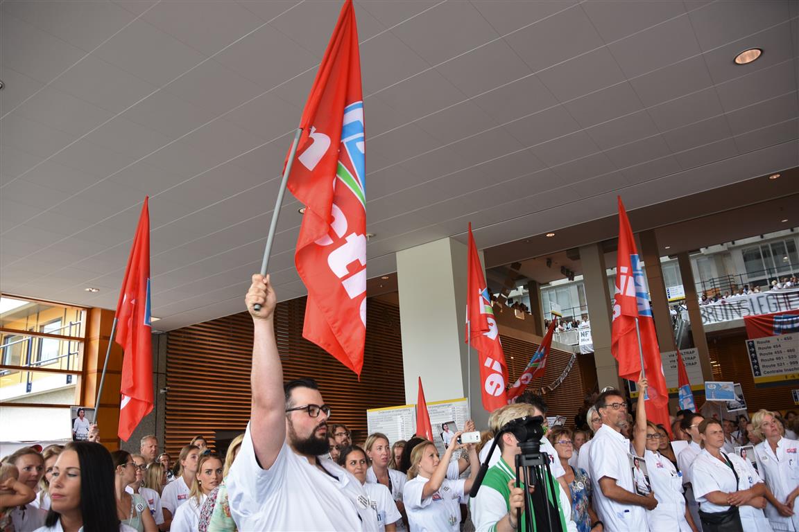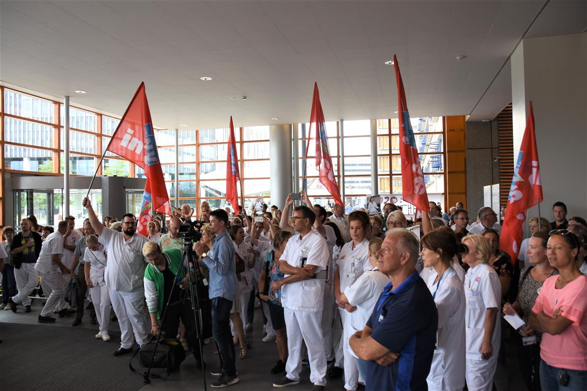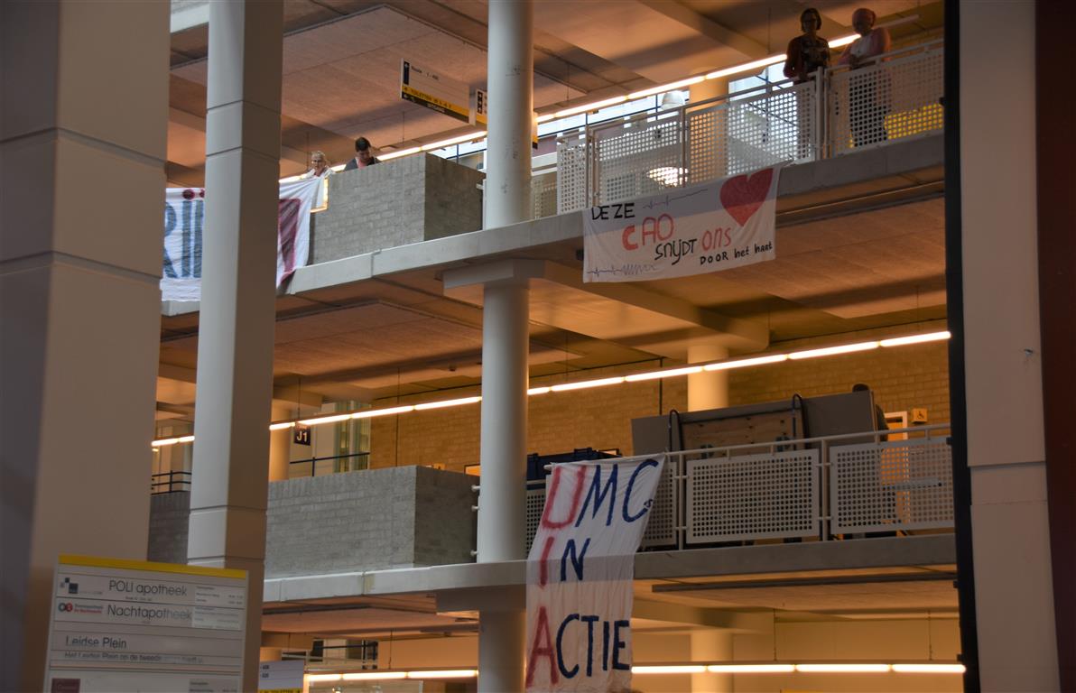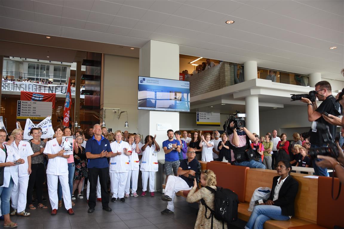 Honderden medewerkers van het LUMC verzamelden zich vanmiddag in de hal van het medisch centrum om actie te voeren voor een eerlijke cao. Vanaf vandaag tot en met 15 augustus worden stiptheidsacties gehouden. Dat betekent dat medewerkers zich houden aan de arbeidsvoorwaarden die overeen gekomen zijn en dus pauze houden op de afgesproken tijden en niet meer overwerken.
