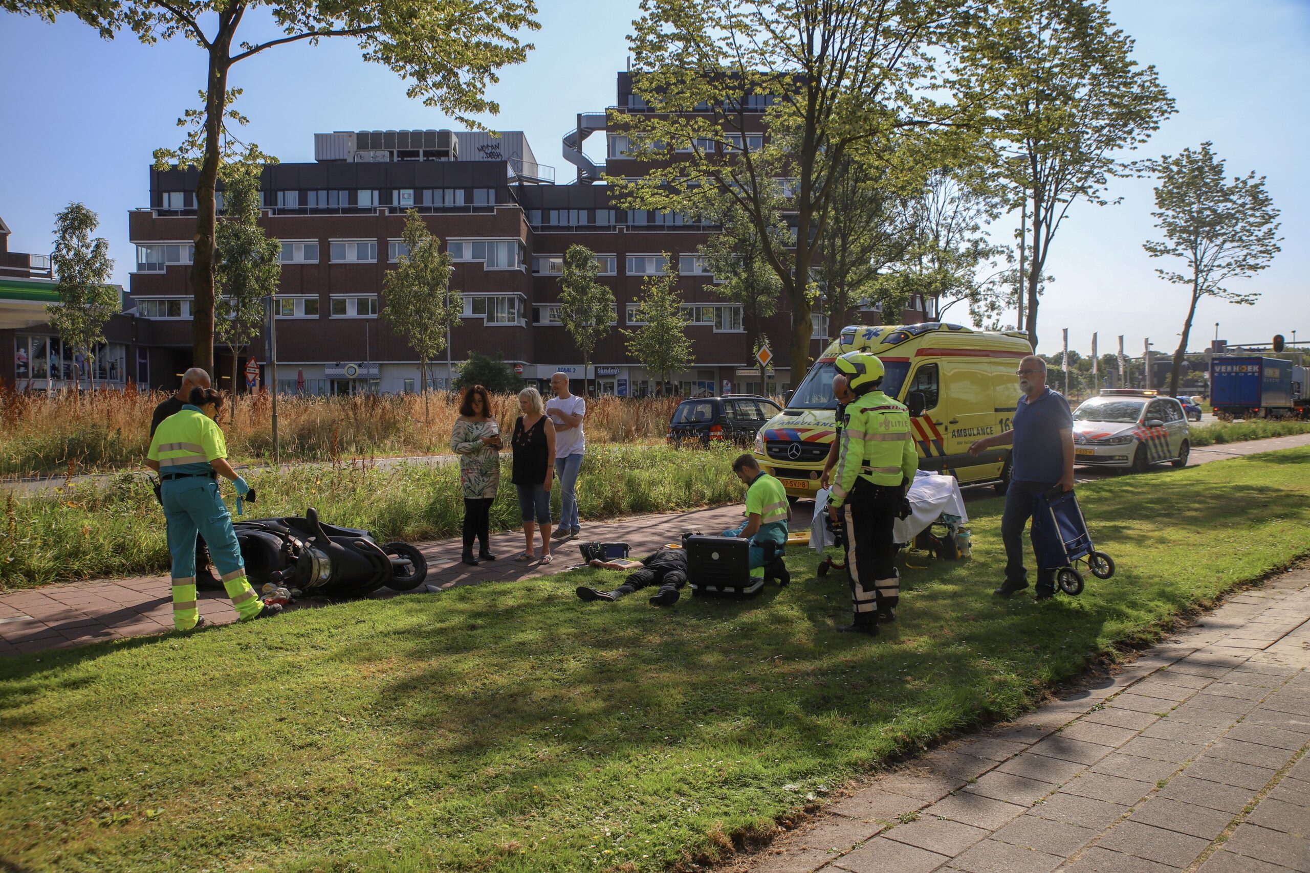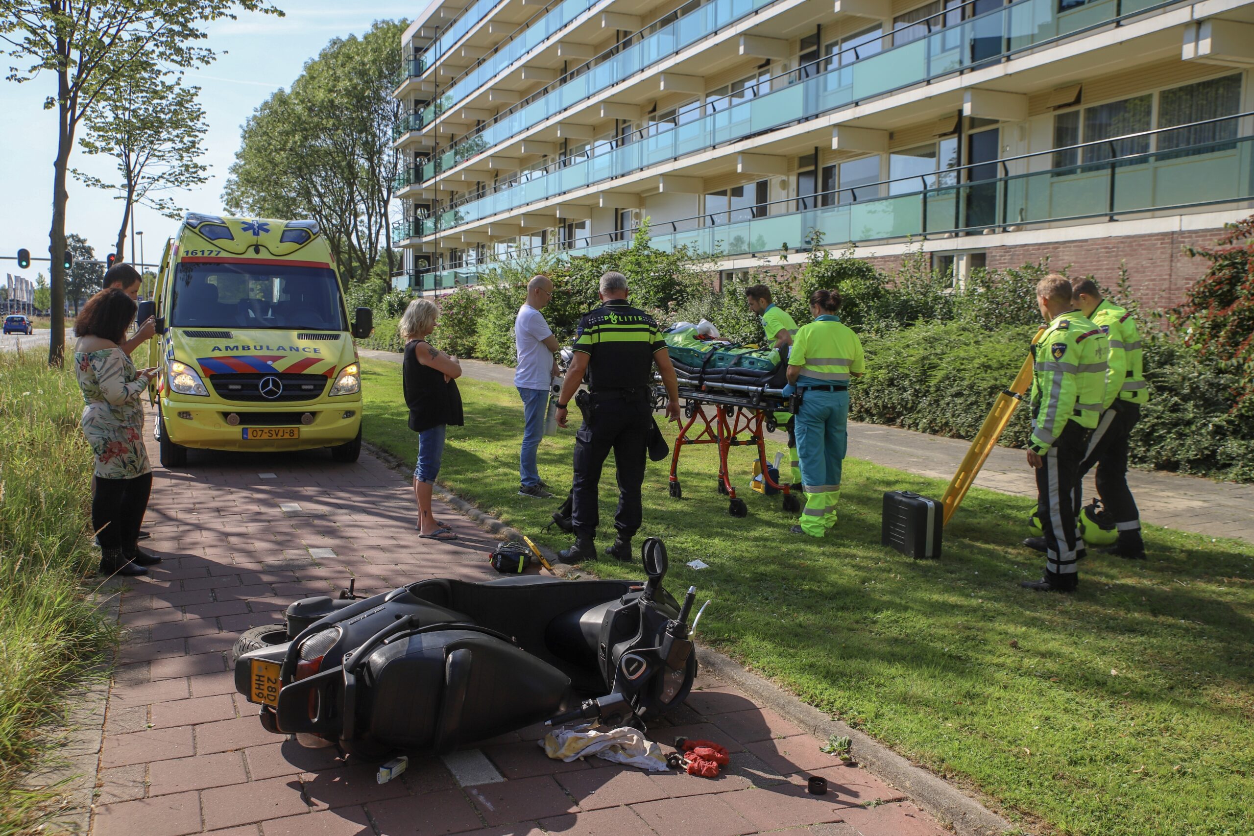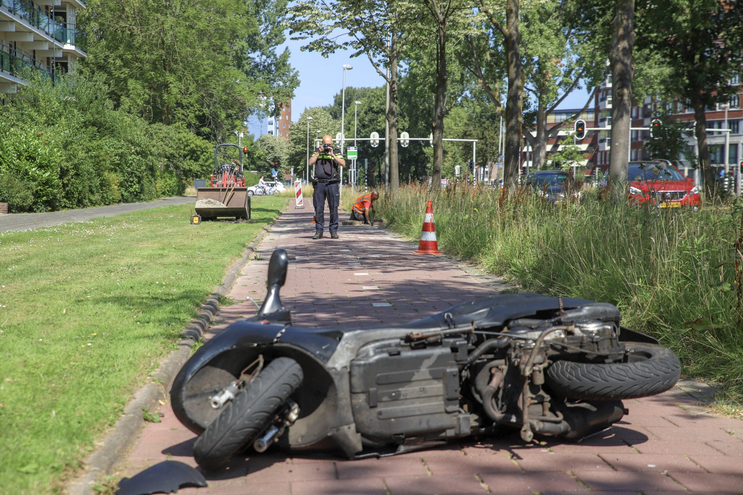Op het fietspad langs de Engelendaal in Leiderdorp is vanmorgen een scooter over de kop geslagen door een losliggende tegel. De berijder van de scooter is met onbekende verwondingen naar het ziekenhuis vervoerd. De gemeente is door de politie ingelicht over het gat in het fietspad en is direct ter plaatse gekomen om het te repareren.
