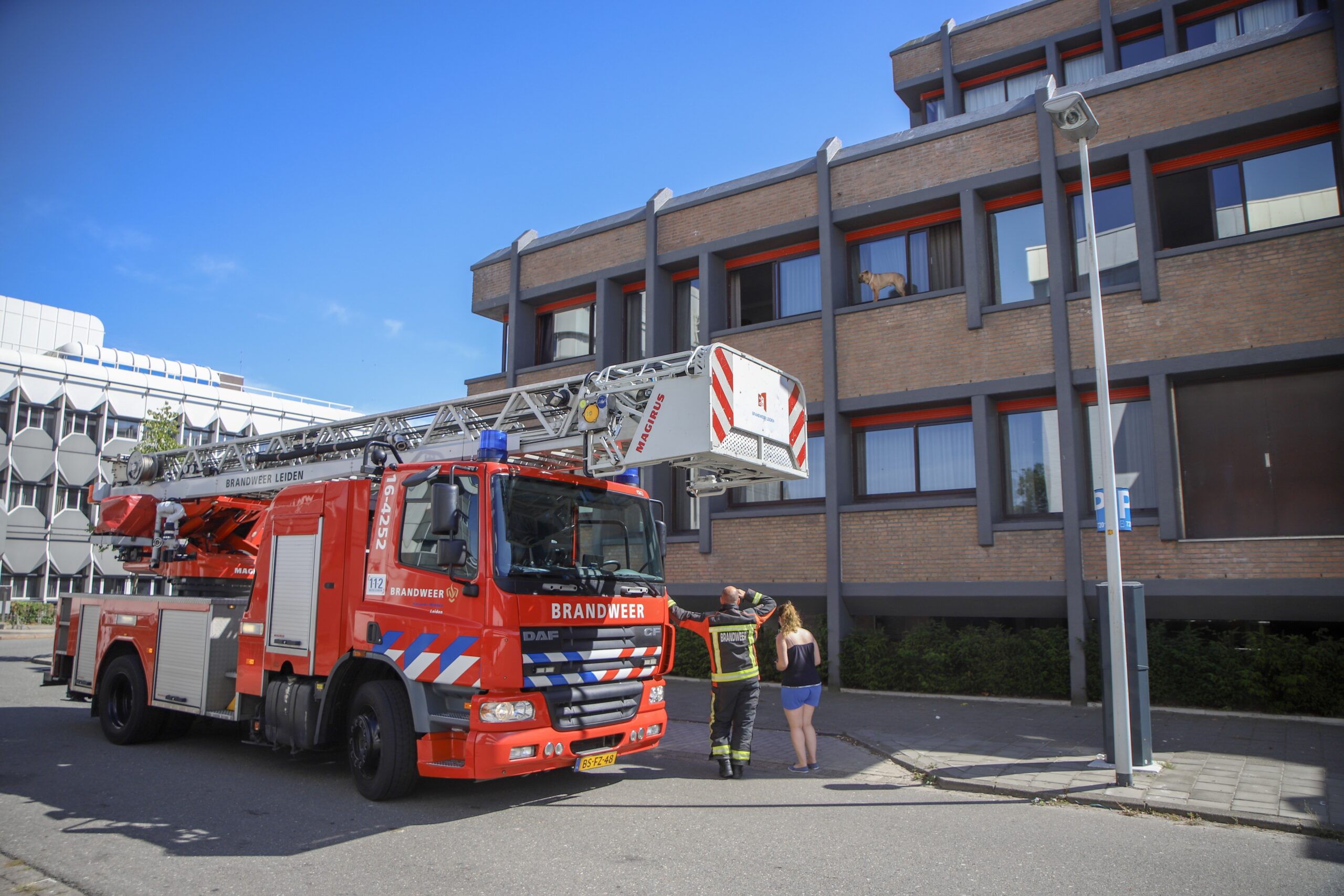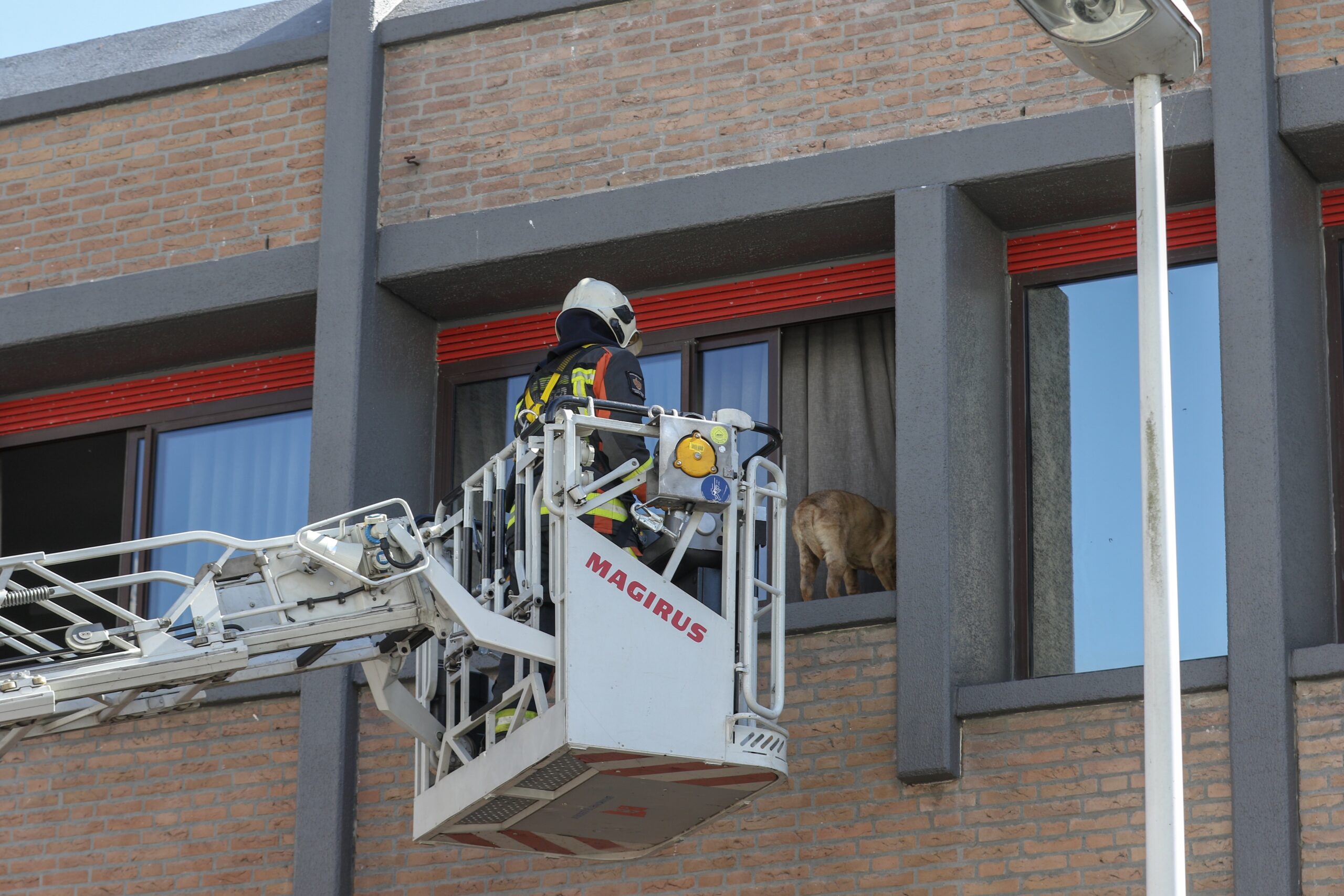 Een hond die vanmiddag uit het raam van een appartement aan de Verbeekstraat in Leiden was geklommen, is door de brandweer behoed voor een fikse valpartij. Het dier stond enkele verdiepingen hoog op een smalle richel. Met behulp van een ladderwagen kon de brandweer de hond veilig de woning in krijgen. Vervolgens is het raam gesloten. De eigenaar kan nog een telefoontje verwachten.