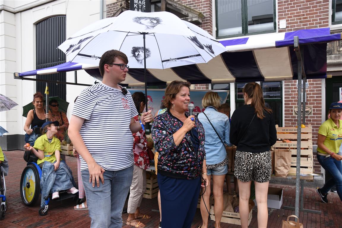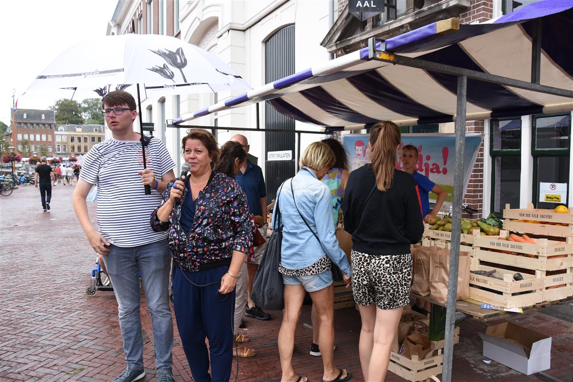 Op de Aalmarkt werd vanaf 12.00 uur het groente en fruit geveild. De bekende Leidse marktkoopman Ilias El Marsse trapte de veiling af. Al snel vlogen de kilo’s tomaten, bananen en paprika’s de kraam uit voor mooie prijzen. Ilias was erg onder de indruk van Stichting Nadja en zijn assistentje Ashley en zei tijdens de veiling zich vaker in te gaan zetten voor de stichting.