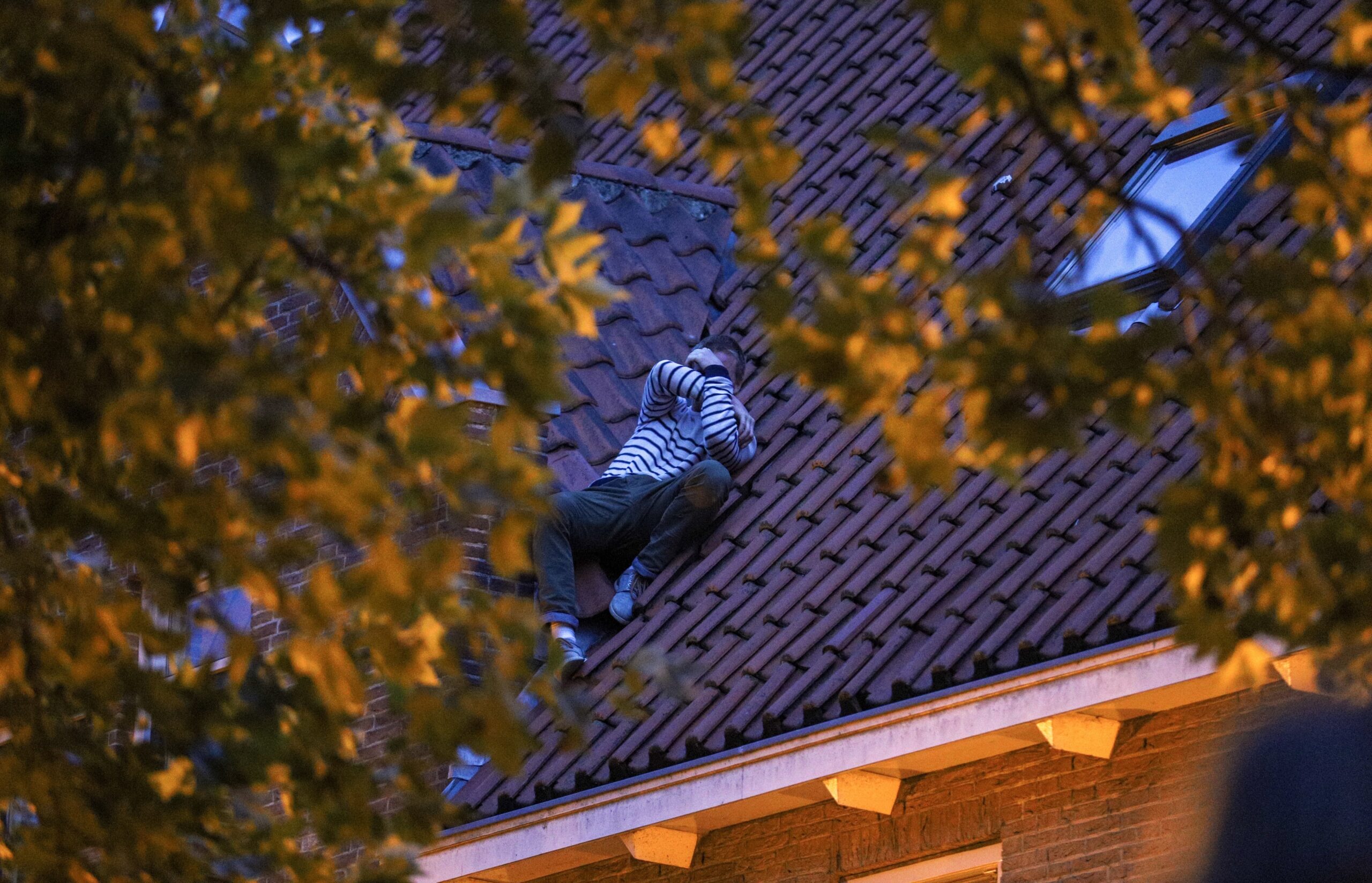 Update: Rond 22.15 uur wist de brandweer de man via de ladderwagen van het dak te halen. Hij is door de politie aangehouden en meegenomen.