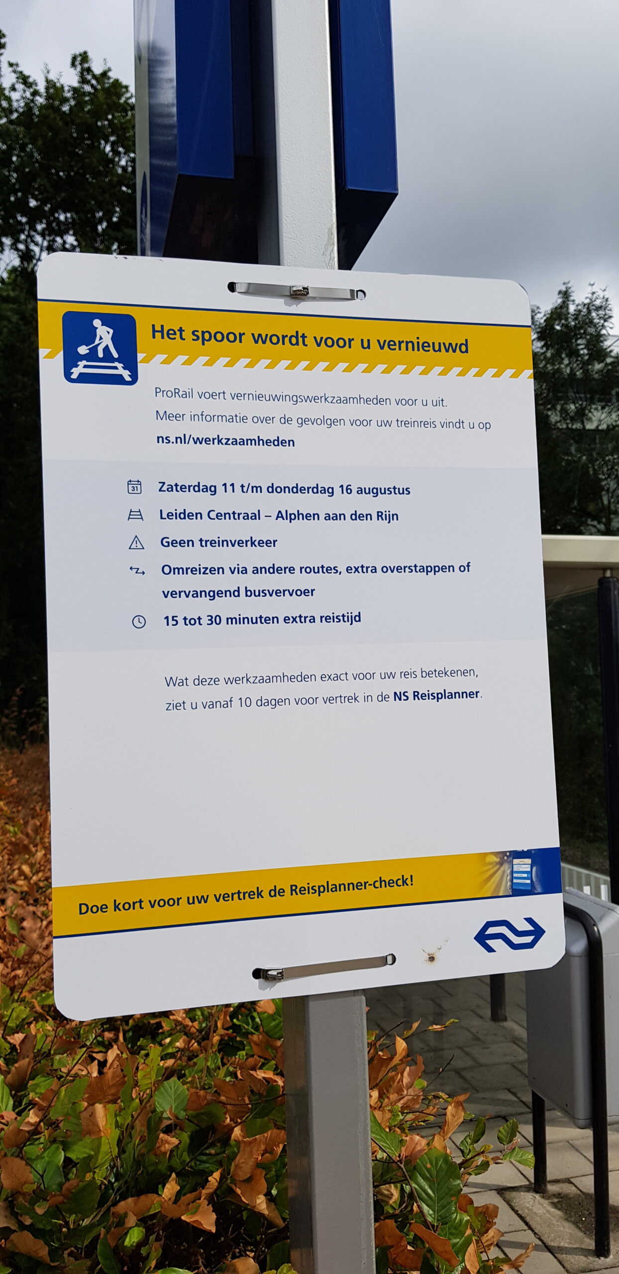 Van 17 tot en met 19 augustus rijden er geen treinen tussen Leiden en Den Haag Centraal en Leiden en Den Haag HS. Er rijden snel- en stopbussen op dit traject en ook kunnen reizigers op langere trajecten omreizen.