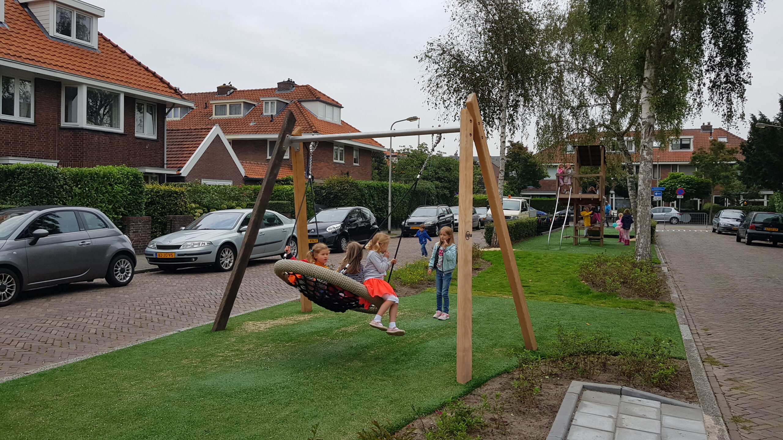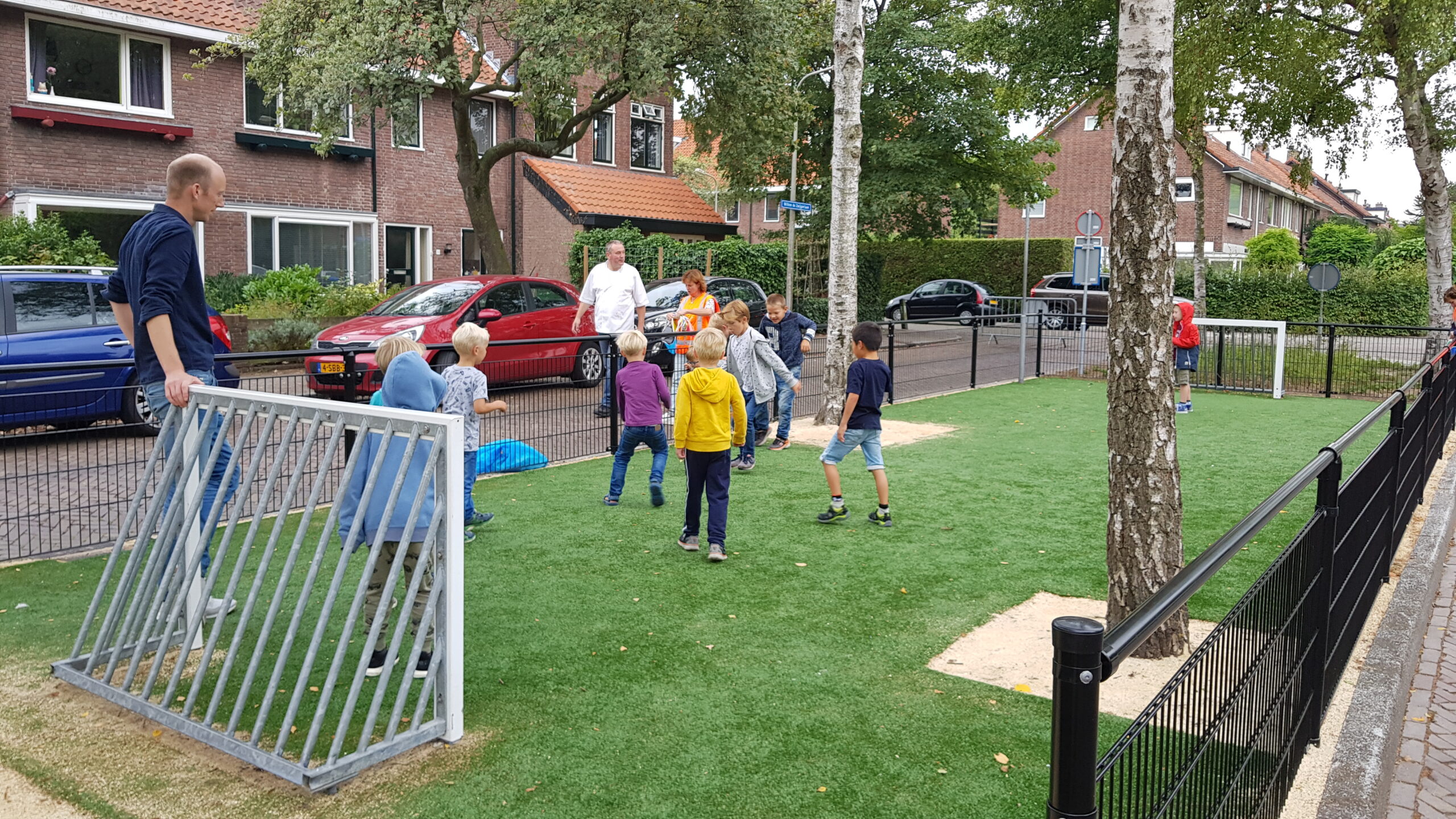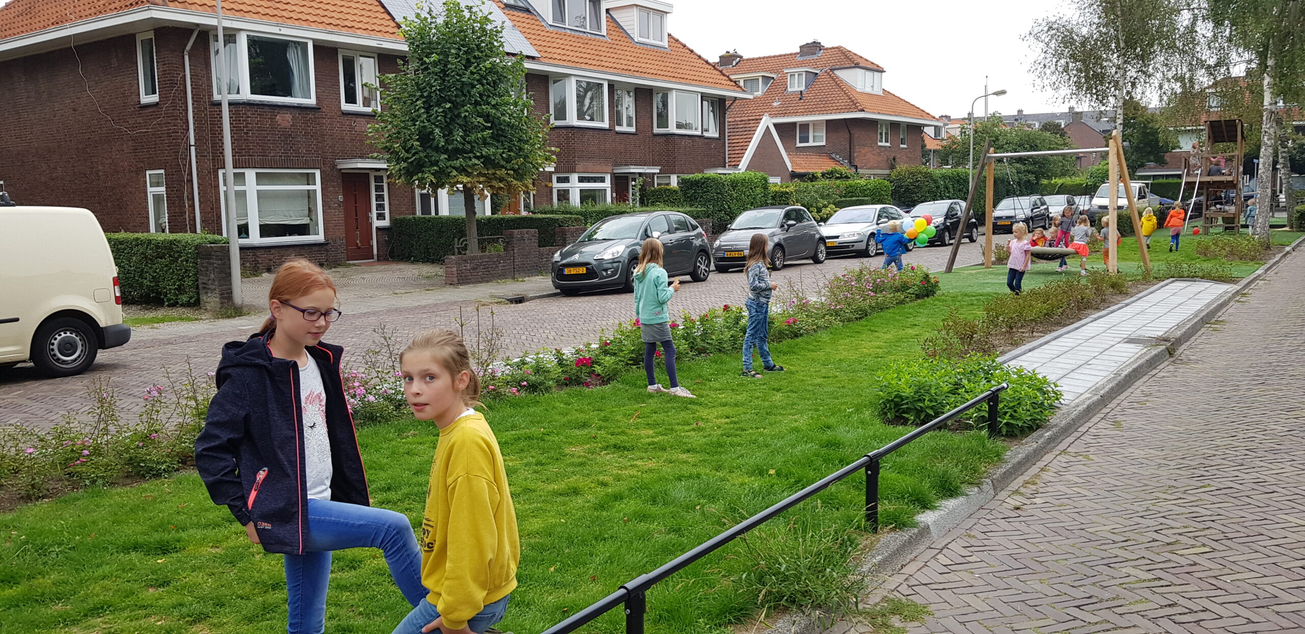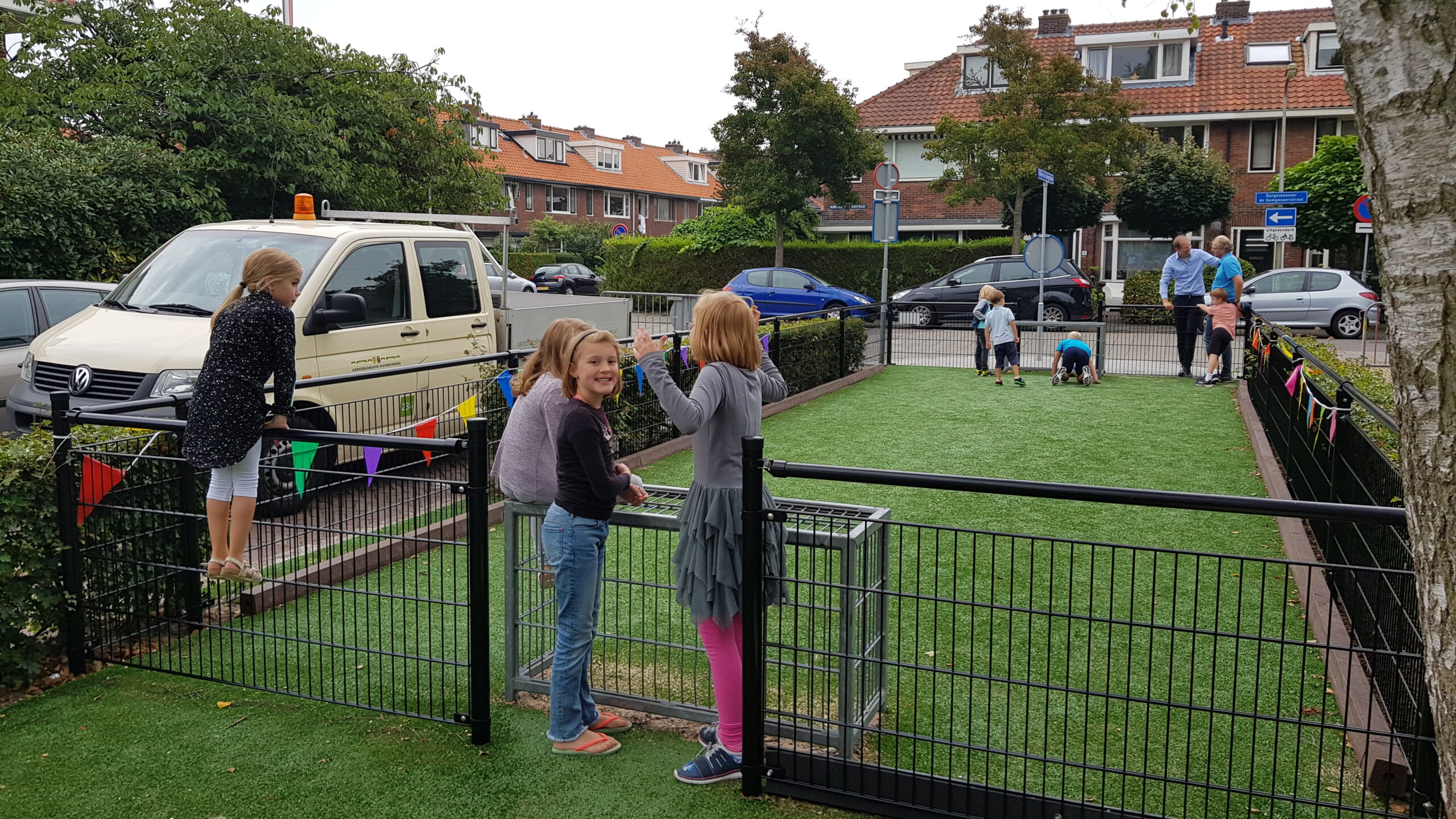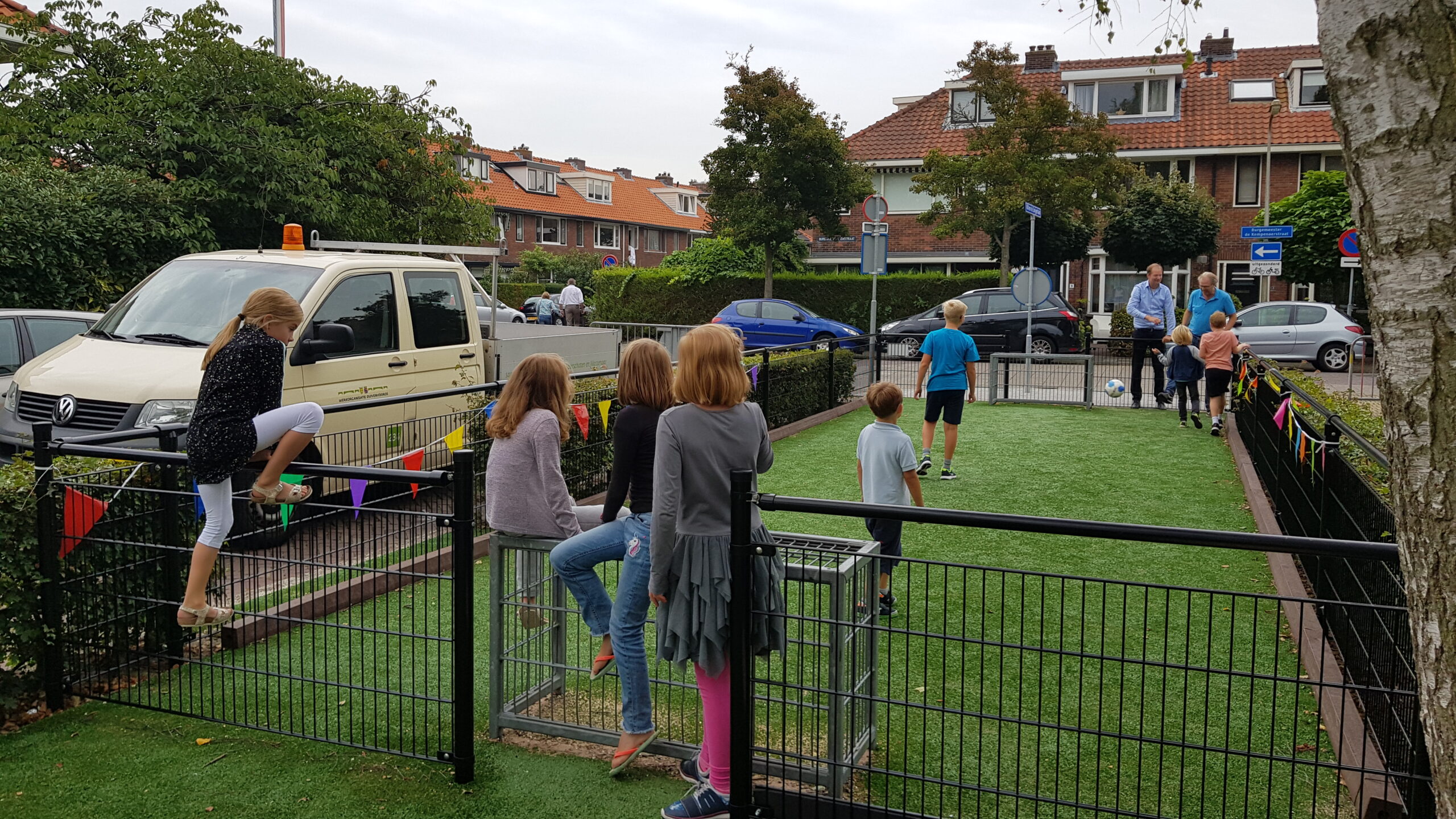 De wat oudere kinderen zijn vooral blij dat er nu niet meer alleen speeltoestellen zijn voor de allerkleinsten. Een familieschommel stond hoog op hun verlanglijstje en die is er nu ook. Aan weerszijden van de bespeelbare groenstrook zijn nu veldjes aangelegd voor voetbal en hockey. Met een hek er omheen, zodat kinderen niet meer zomaar de straat op kunnen lopen als er een bal van het veldje wordt getrapt. Een zorg minder voor de ouders die in de oude situatie nog weleens met de zenuwen in het lijf zaten.