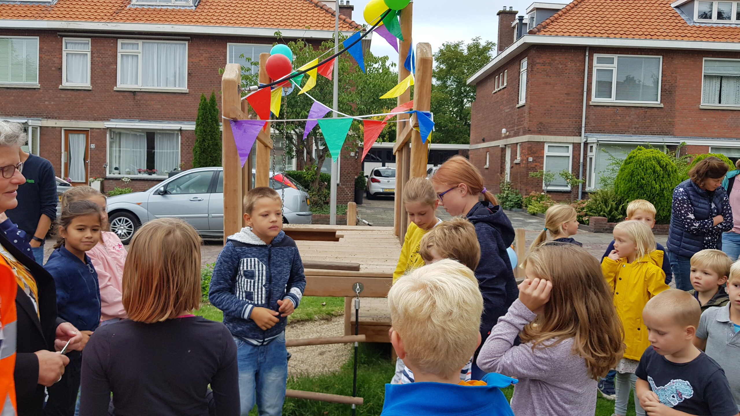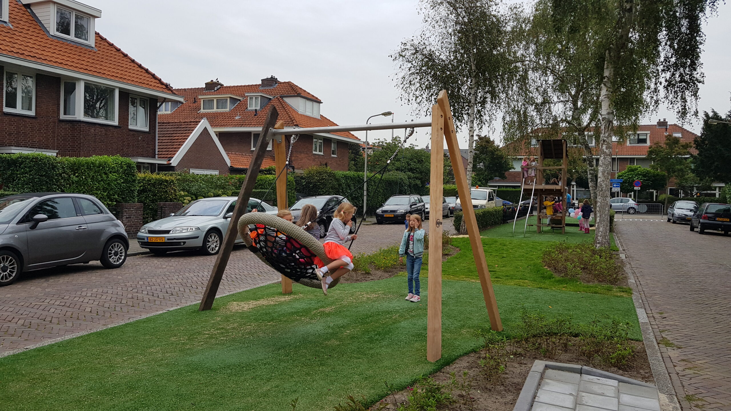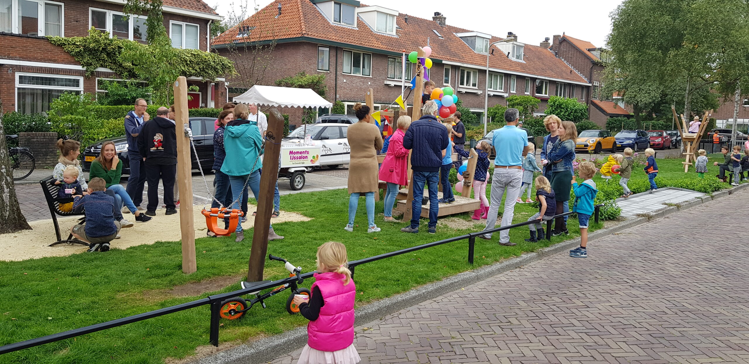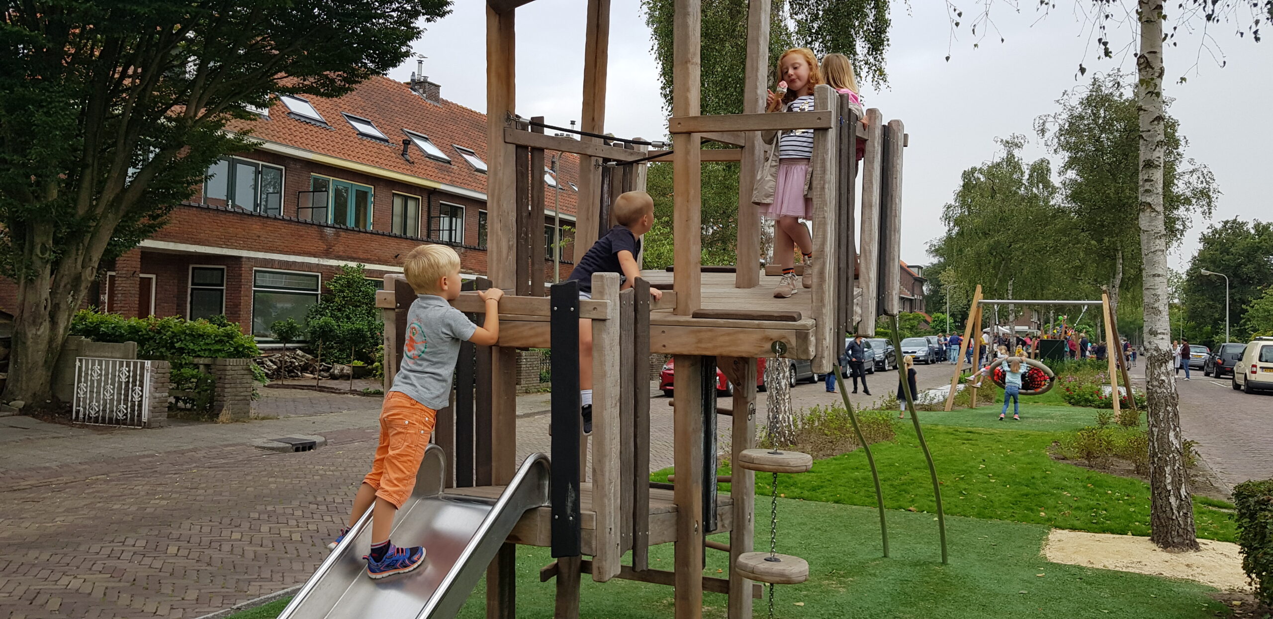 De wat oudere kinderen zijn vooral blij dat er nu niet meer alleen speeltoestellen zijn voor de allerkleinsten. Een familieschommel stond hoog op hun verlanglijstje en die is er nu ook. Aan weerszijden van de bespeelbare groenstrook zijn nu veldjes aangelegd voor voetbal en hockey. Met een hek er omheen, zodat kinderen niet meer zomaar de straat op kunnen lopen als er een bal van het veldje wordt getrapt. Een zorg minder voor de ouders die in de oude situatie nog weleens met de zenuwen in het lijf zaten.