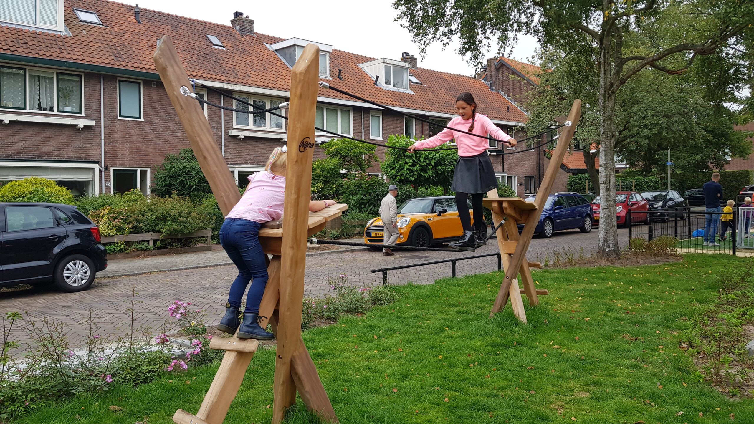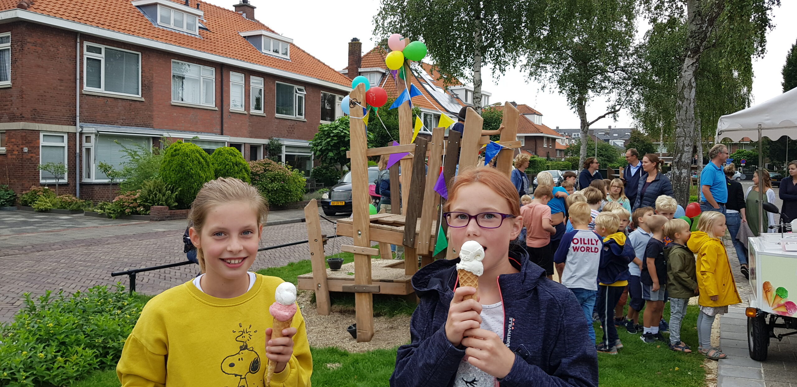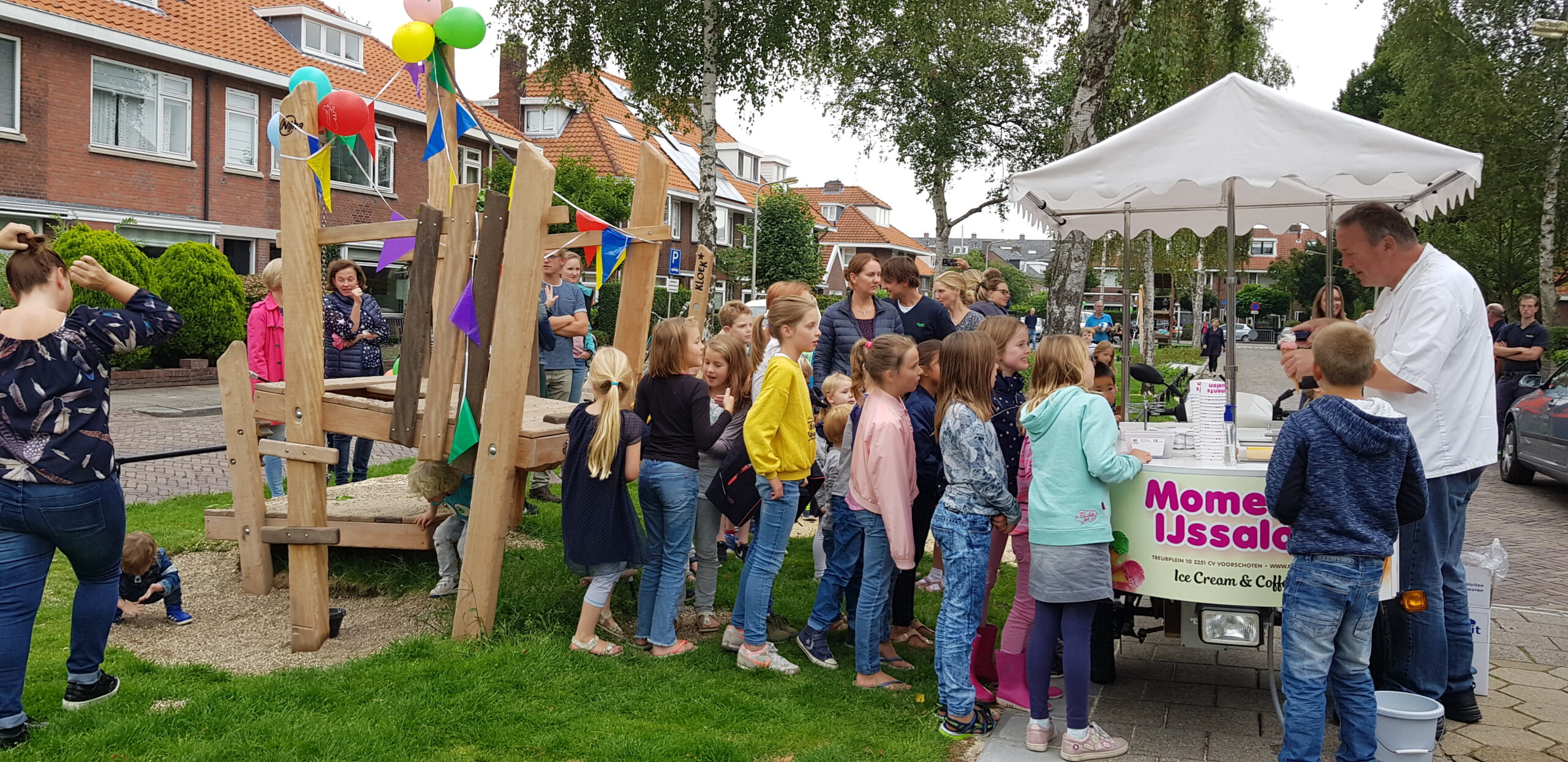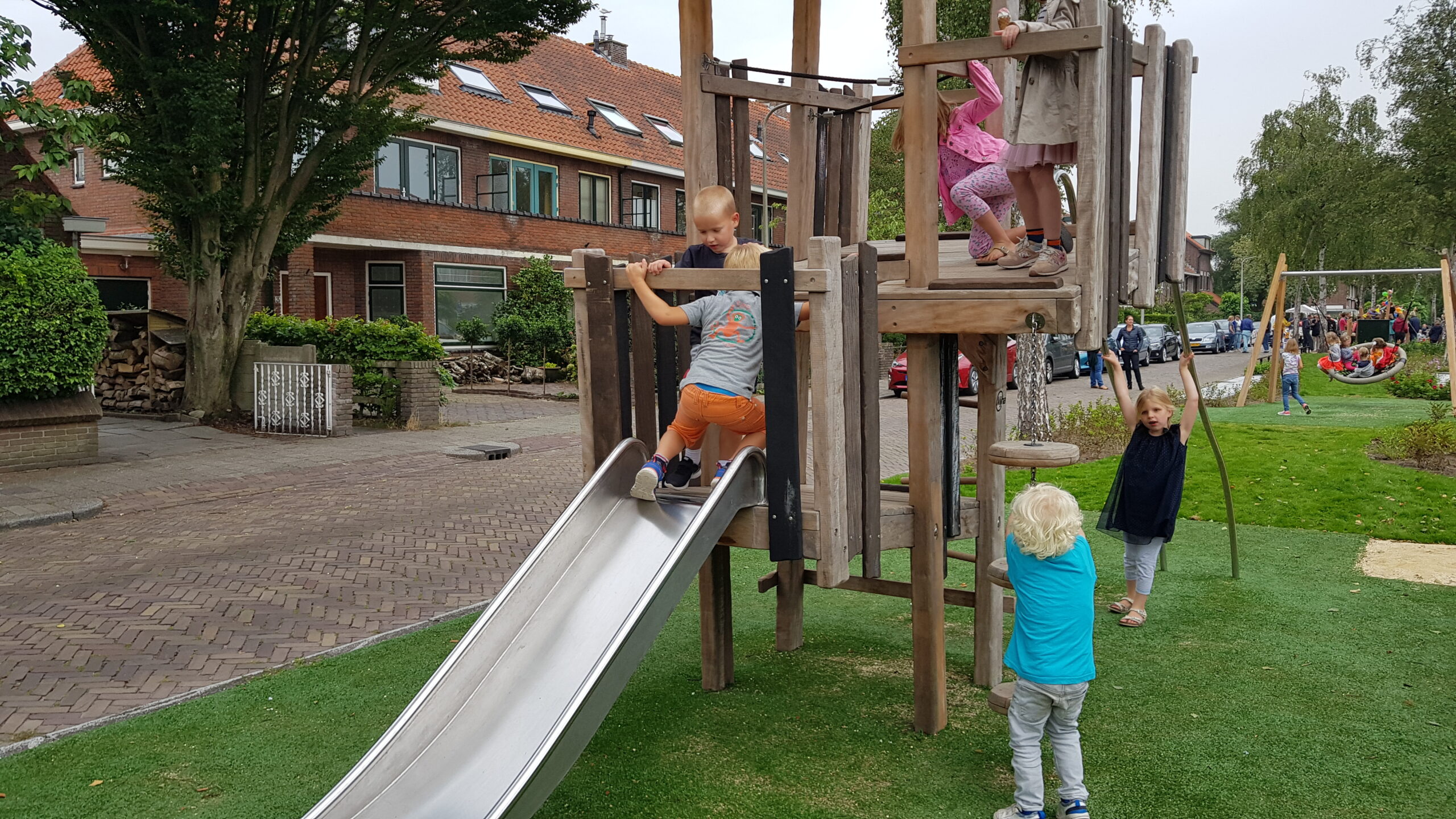 De wat oudere kinderen zijn vooral blij dat er nu niet meer alleen speeltoestellen zijn voor de allerkleinsten. Een familieschommel stond hoog op hun verlanglijstje en die is er nu ook. Aan weerszijden van de bespeelbare groenstrook zijn nu veldjes aangelegd voor voetbal en hockey. Met een hek er omheen, zodat kinderen niet meer zomaar de straat op kunnen lopen als er een bal van het veldje wordt getrapt. Een zorg minder voor de ouders die in de oude situatie nog weleens met de zenuwen in het lijf zaten.