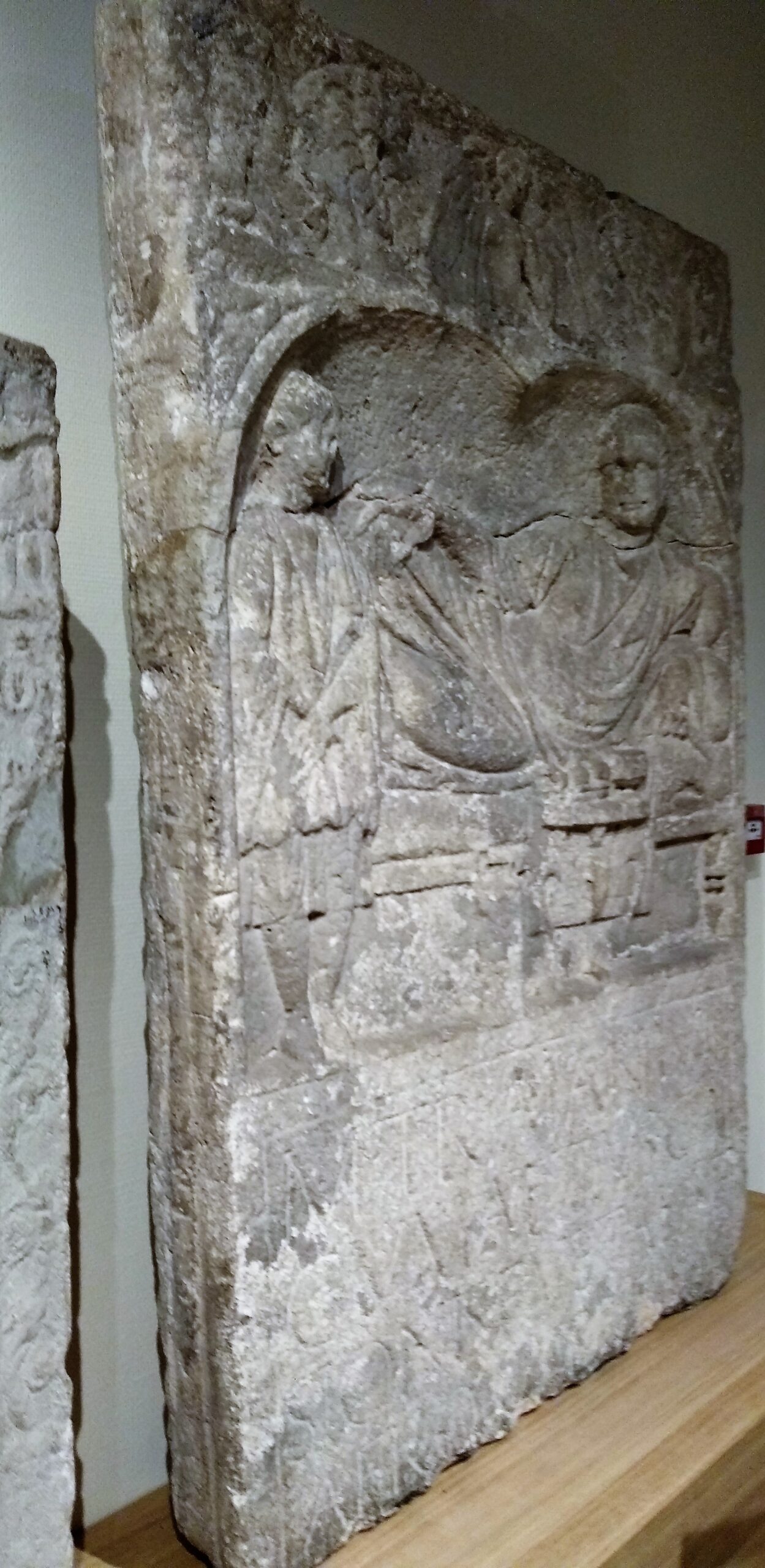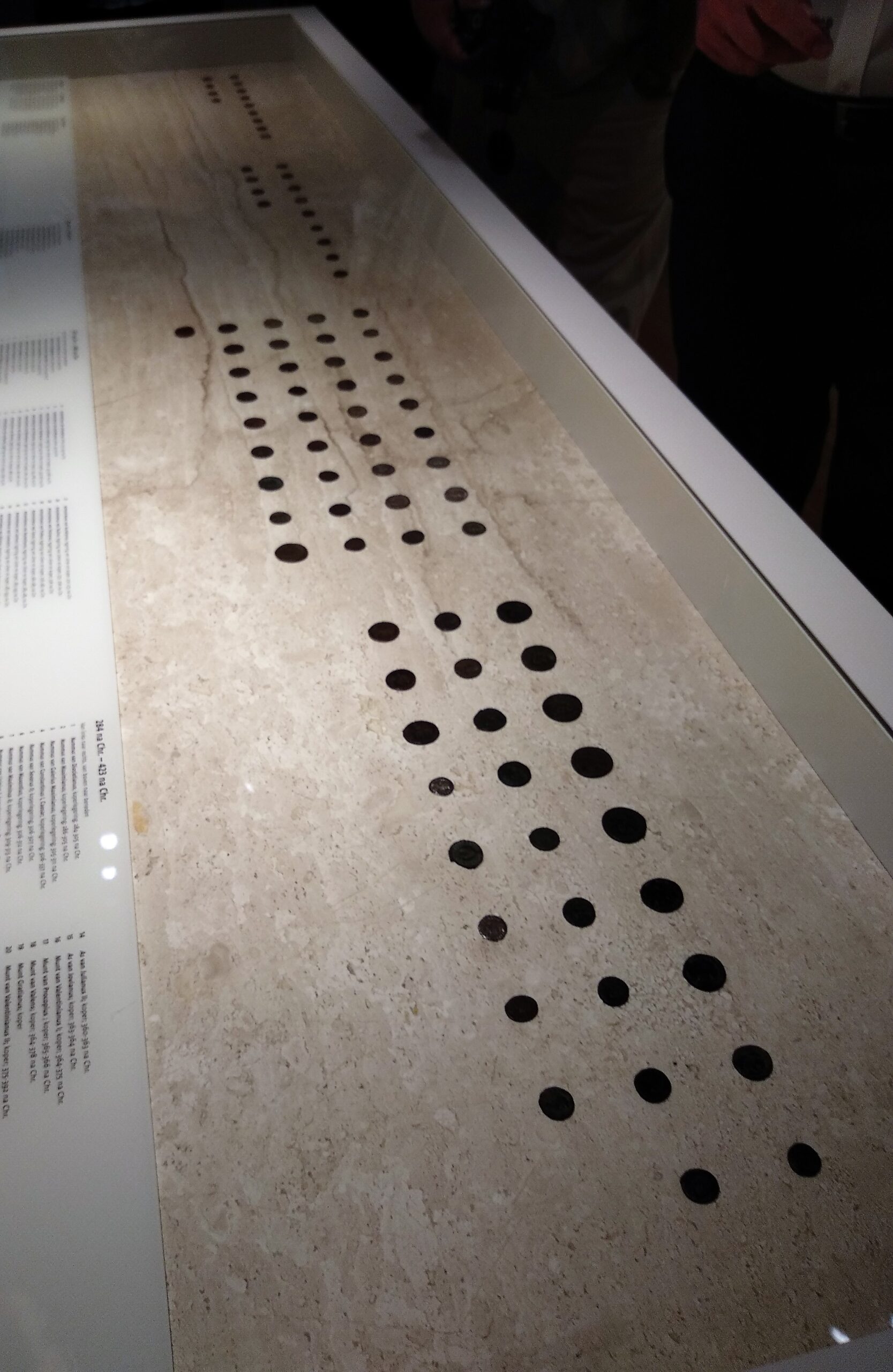 Meer vragen dan antwoorden. Dat maakt de afdeling leuk. De vitrine met Romeinse munten is op het eerste gezicht een saaie ordening in rijen, als je je niet interesseert voor munten. Totdat iemand je erop wijst dat de munten ook de stabiliteit van het Romeinse rijk, de hoeveelheid keizers, weergeven. De periode waar heel veel munten van liggen uitgestald, is de periode van onrust en veel keizers. En Julius Caesar, helemaal aan het begin van de zaal, zag die er echt zó uit? Of de stenen inscriptie waar de naam van een vermoorde (mogelijke) troonpretendent uit is weggebeiteld en waar een keizerlijke eretitel is bijgebeiteld. Alsof je naar herdrukken van een modern boek staat te kijken, maar dan op één stuk steen.