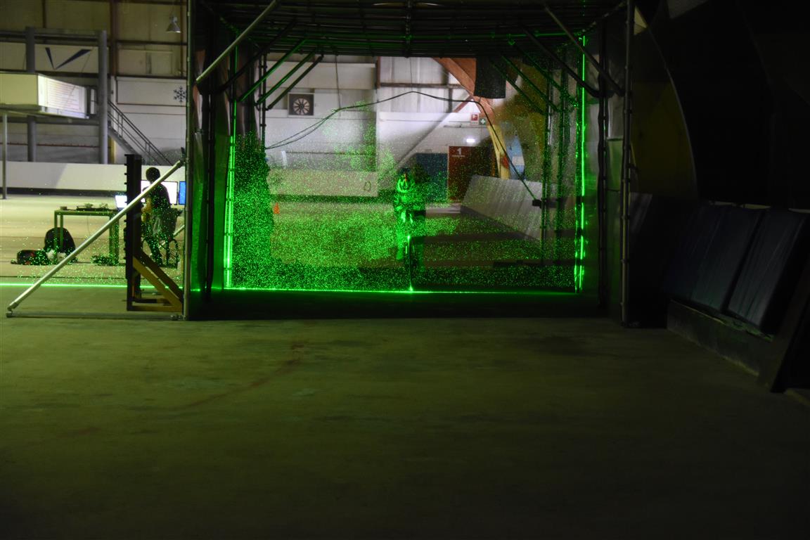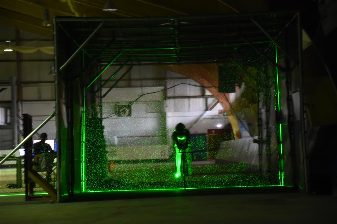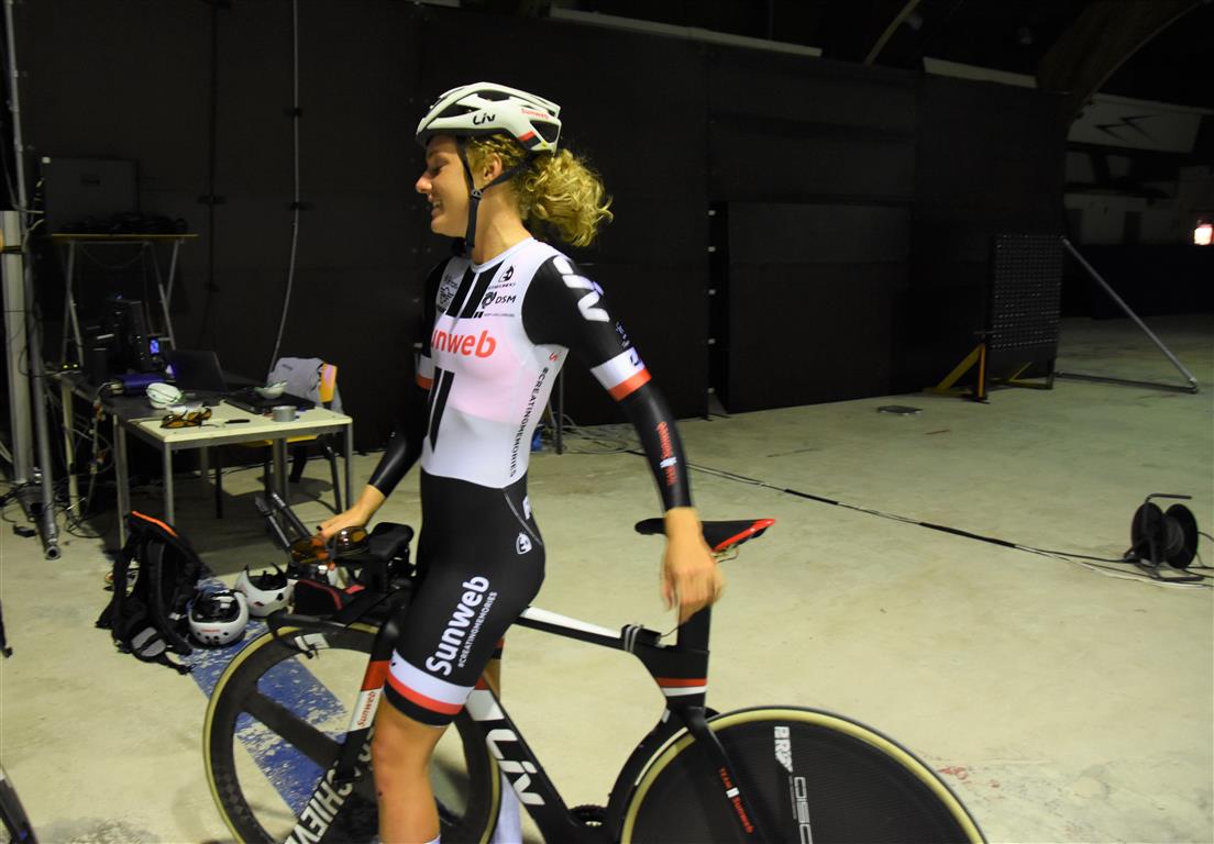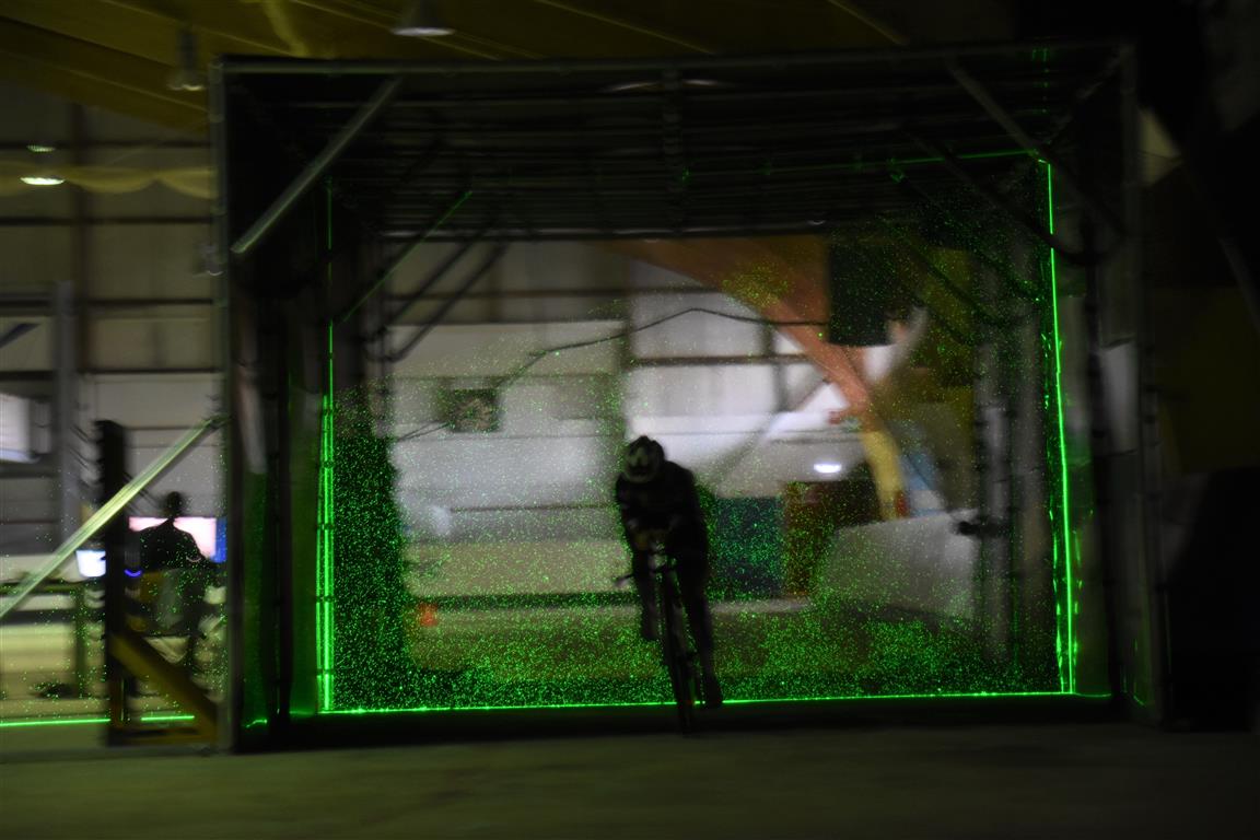 Omdat lucht niet zichtbaar is, worden er met helium gevulde zeepdeeltjes gebruikt. Die worden met een laser en camera’s gevisualiseerd. Zodra de wielrenner de stilstaande lucht is gepasseerd, meten de onderzoekers de beweging van die deeltjes. Daarmee kan de weerstand worden gemeten. Wielrenners Floortje Makaay en Albert Timmer waren namens Sunweb aanwezig om mee te werken aan het onderzoek.