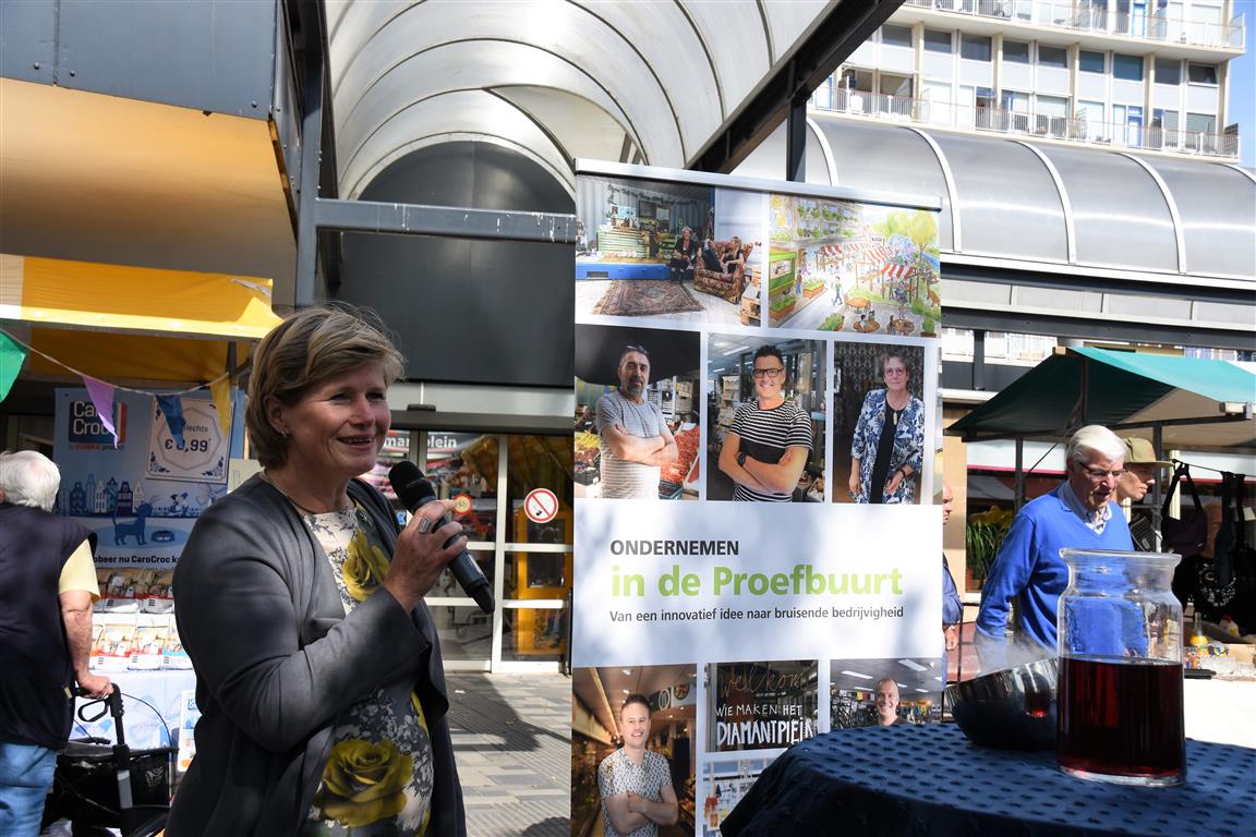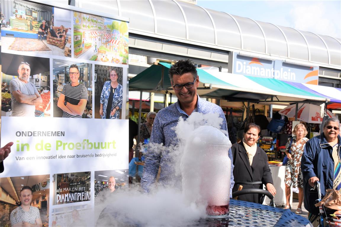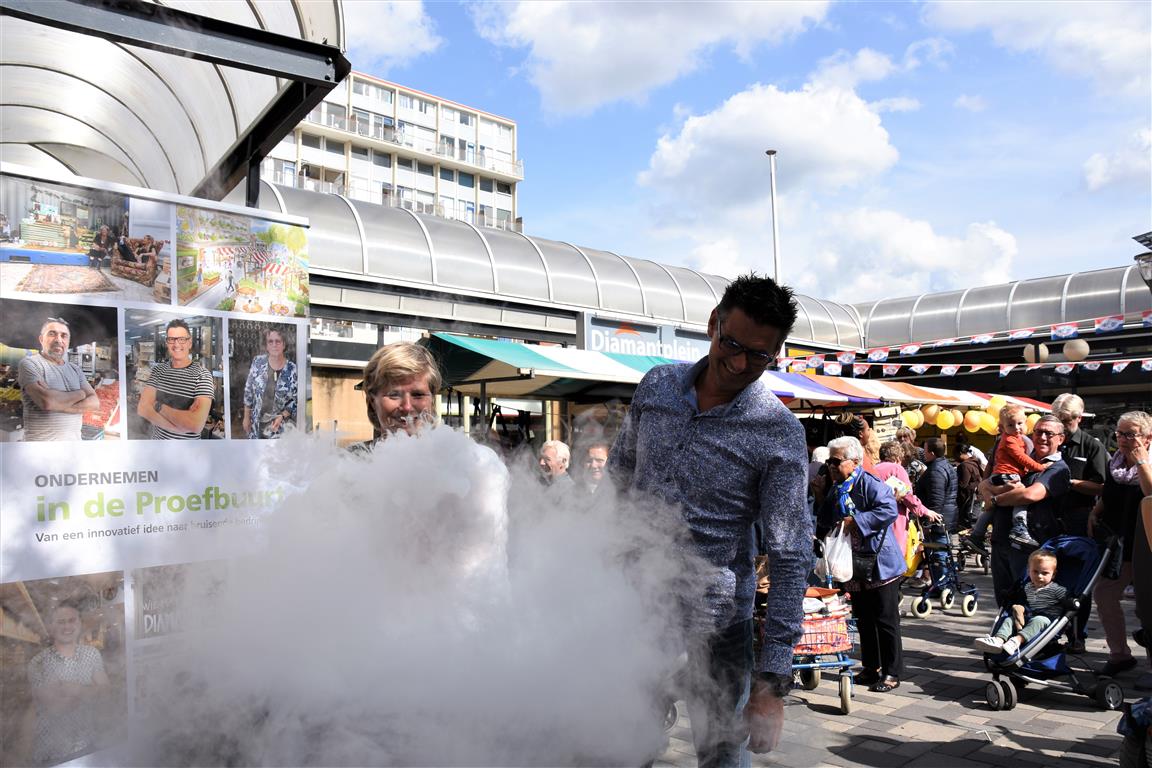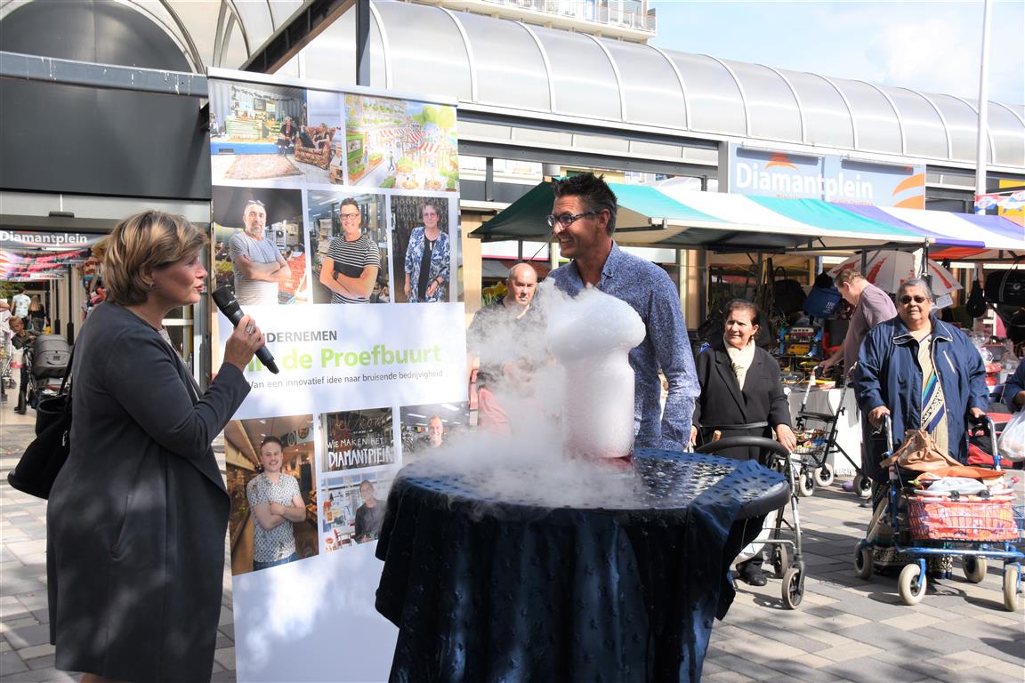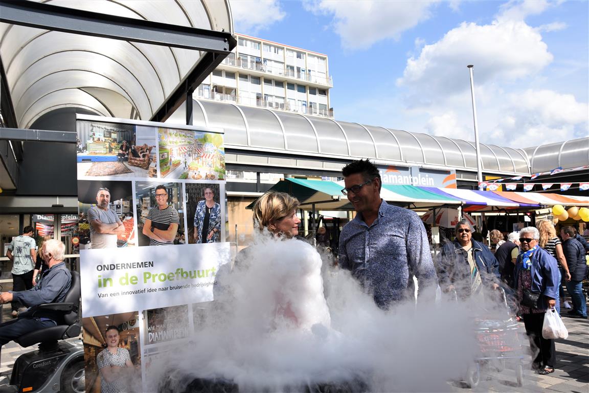 Ondernemers in winkelcentrum Diamantplein gaan de komende tijd aan de slag om het winkelcentrum weer levendig en bruisend te maken. Om veel innovatieve ideeën van ondernemers niet te frustreren door ellenlange procedures en regeltjes gaat de gemeente als proef hier soepel mee om. Tijdens een druk bezochte zomermarkt gaf wethouder Yvonne van Delft samen met ondernemer Jean Lamet op een bruisende manier het startsein voor ‘Ondernemen in de Proefbuurt’.
