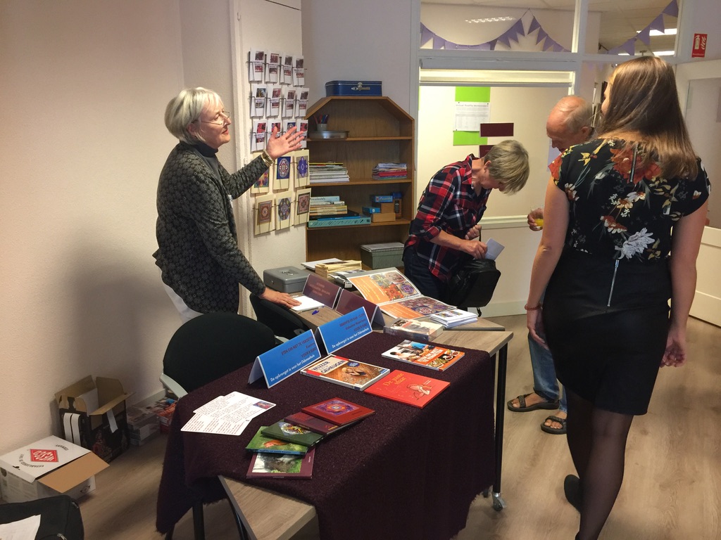Gerry van Bakel in gesprek met wethouder Marleen Damen, AH medewerkster Esther Bouwens, participant Maarten den Draak, dochter Mieke Fijn en coordinator Jacqueline Koster.