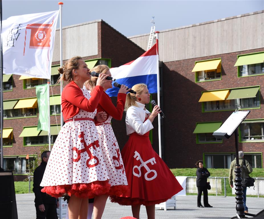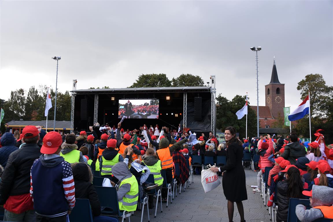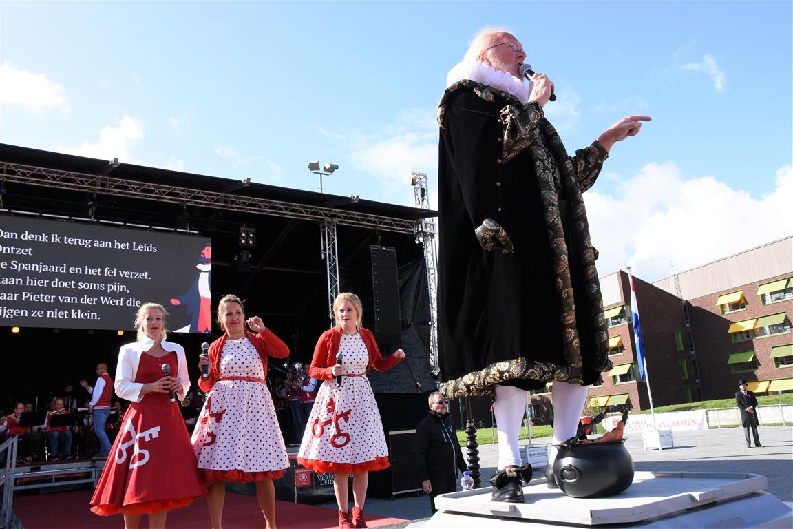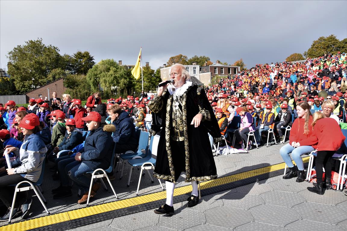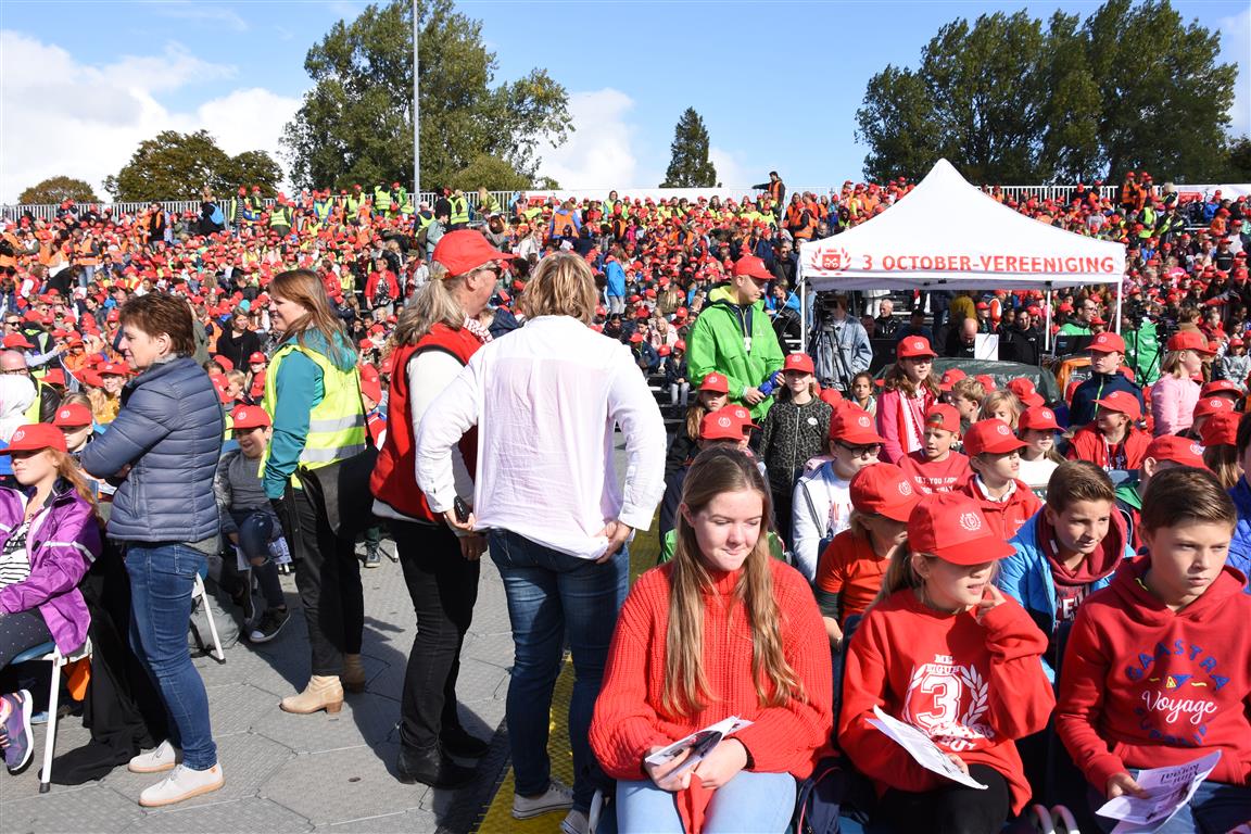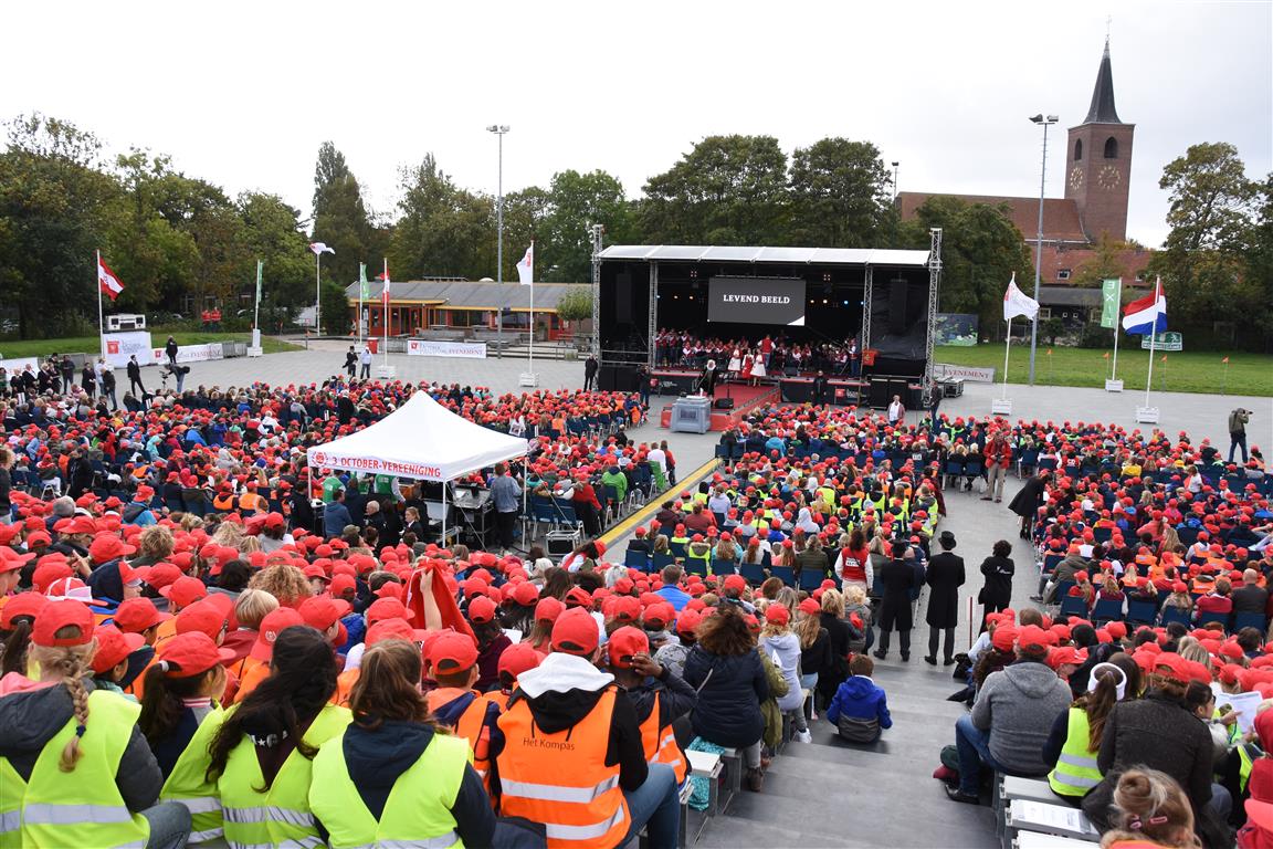 De donkere luchten, de kortstondige buitjes kunnen de pret niet drukken. De Minikoraal is niet meer weg te denken uit de 3 Oktoberviering. Wat vijfentwintig jaar geleden begon met een handjevol Leidse scholen is uitgegroeid tot een fenomenaal evenement waaraan scholen uit alle buurgemeenten meedoen. Begonnen in het groen van het Van der Werfpark, verhuisde de Minikoraal eerst naar de nabijgelegen Garenmarkt. Nu dat een bouwplaats is geworden tot medio 2020 heeft de Minikoraal voorlopig onderdak gevonden op het Trigonterrein aan de Zoeterwoudsesingel, waar helaas geen plaats meer is voor toeschouwers. Maar Sleutelstad zendt elk jaar live uit via Facebook en website, die je hier nog terug kunt kijken.